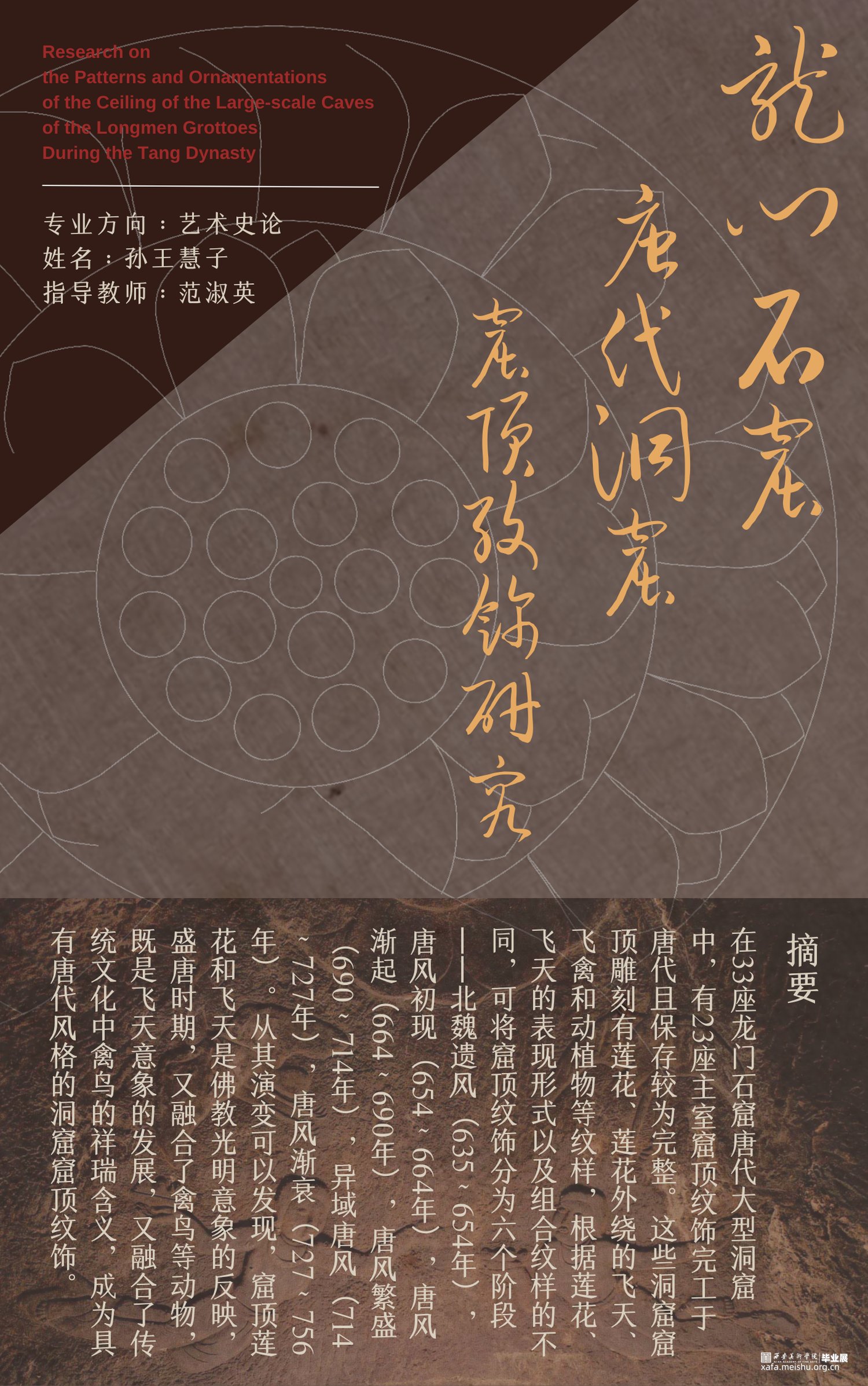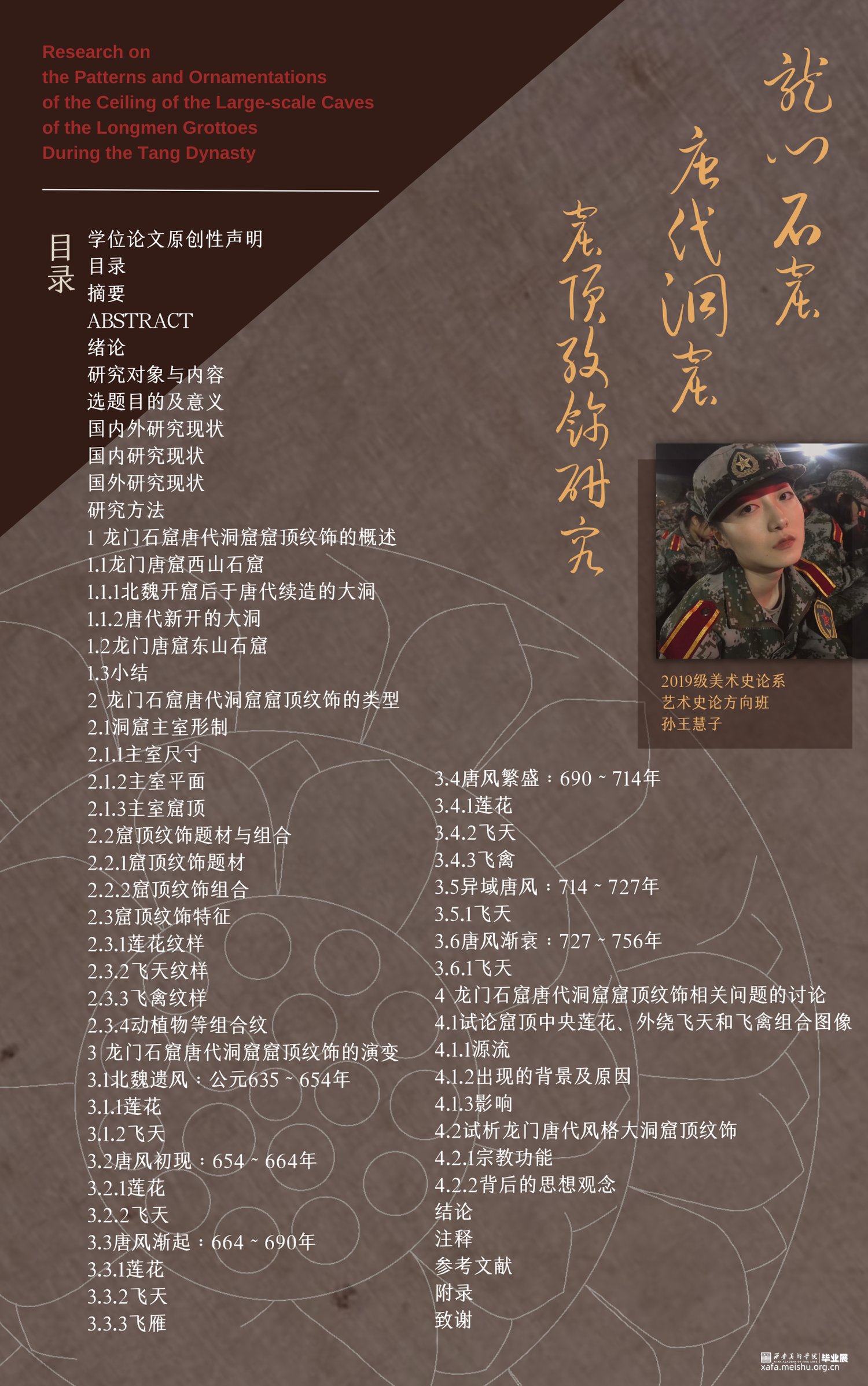 在33座龙门石窟唐代大型洞窟中,有23座主室窟顶纹饰完工于唐代且保存较为完整。这些洞窟窟顶雕刻有莲花、莲花外绕的飞天、飞禽和动植物等纹样,根据莲花、飞天的表现形式以及组合纹样的不同,可将窟顶纹饰分为六个阶段——北魏遗风(635~654年),唐风初现(654~664年),唐风渐起(664~690年),唐风繁盛(690~714年),异域唐风(704~727年),唐风渐衰(727~756年)。从其演变可以发现,窟顶莲花和飞天是佛教光明意象的反映,盛唐时期,又融合了禽鸟等动物,既是飞天意象的发展,又融合了传统文化