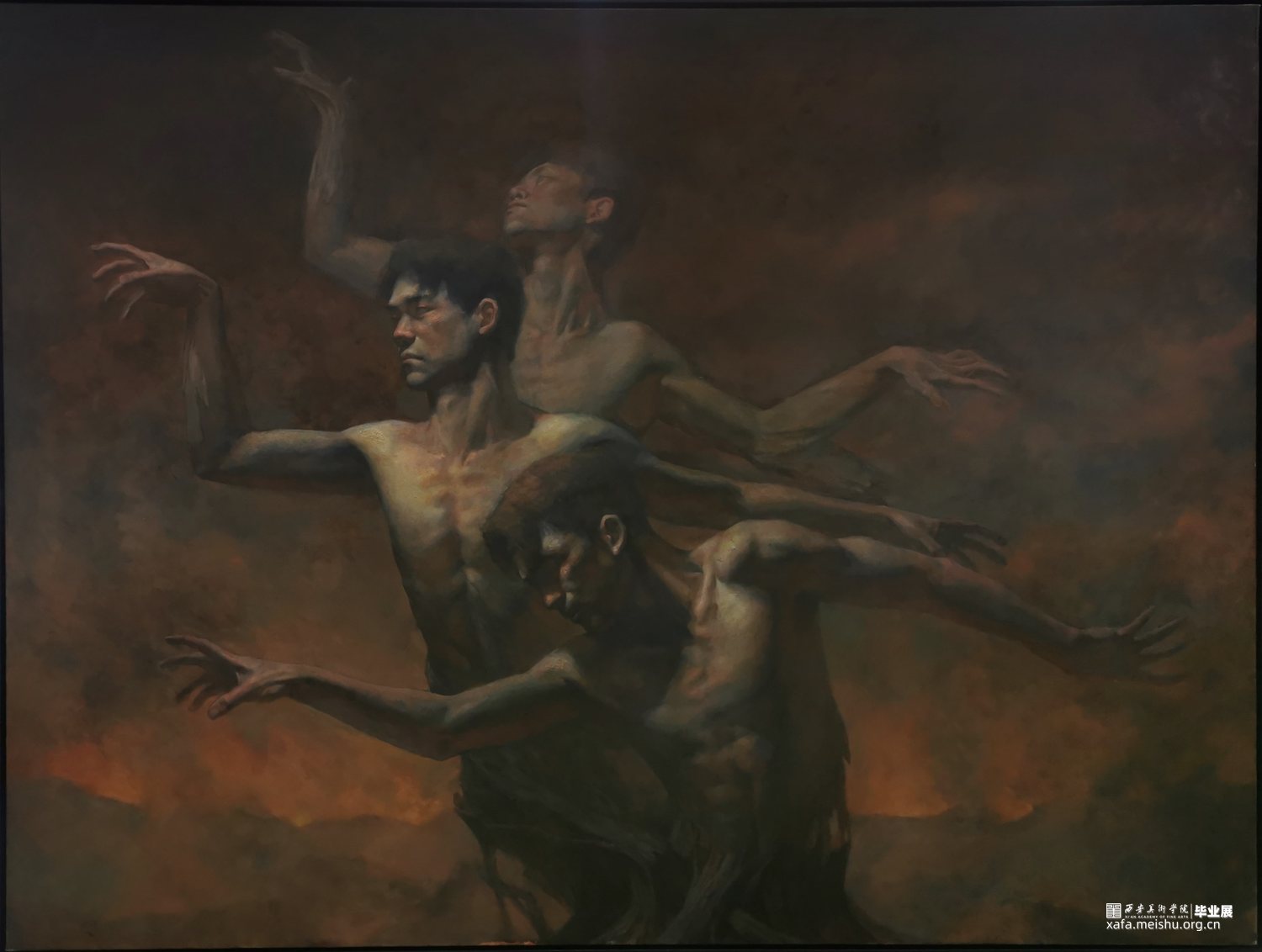 作品描绘了人物与树一同生长的三联动态,人物的躯干生长着,手臂如树枝弯折,分叉再生,其灵感来源于2022年夏日极端高温引发的山火。句芒是中国神话中掌管树木生长的神灵,作品想借此讨论人与环境的共同命运,与对山火后灰烬中能萌发新生的祈愿。