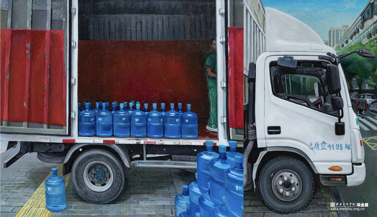 这幅现实主义题材的作品尽量去除画面中多余的情感和情绪化,以一种理智的旁观者态度去看待周遭的事物。尽量减少有叙事性的形象,试图探求纯粹的视觉体验。并传达出在当代社会生活的人如同产品一样被源源不断的生产,人在时代的列车上不由自主的滚滚向前。我截取了普通人生活中随处可见的一个片段,它可能只是电影中的一帧,却也展示出了当下我们所生活的世界。