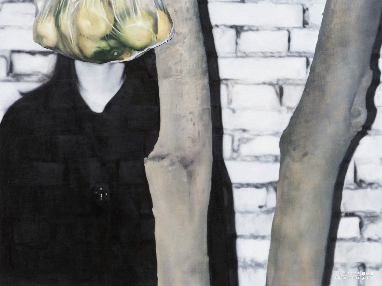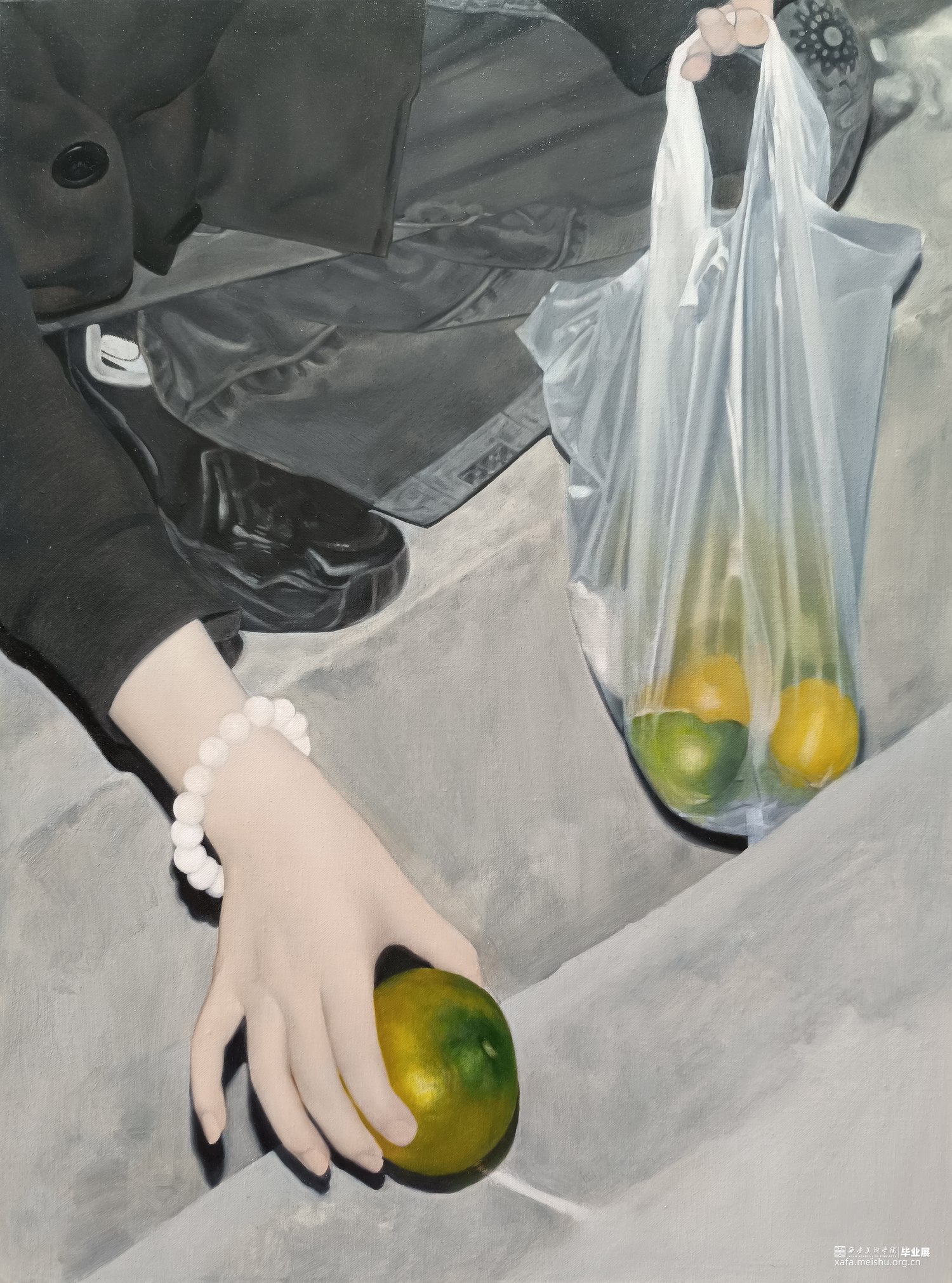 《没熟》系列探讨关系、过程、结果等,没熟的橘子作为意义的承载,吸引着注意。伸出手的《没熟》是外向的,是传递。我的朋友们说:“这橘子一看就很酸。”这确实是令人不太满意的橘子,它属于我,我无从得知它能否被接受,我的真实意图也无法被明确。横幅的《也没熟》是内向的,是防卫。我设置了层层阻碍,“希望你不要注意到我”。
