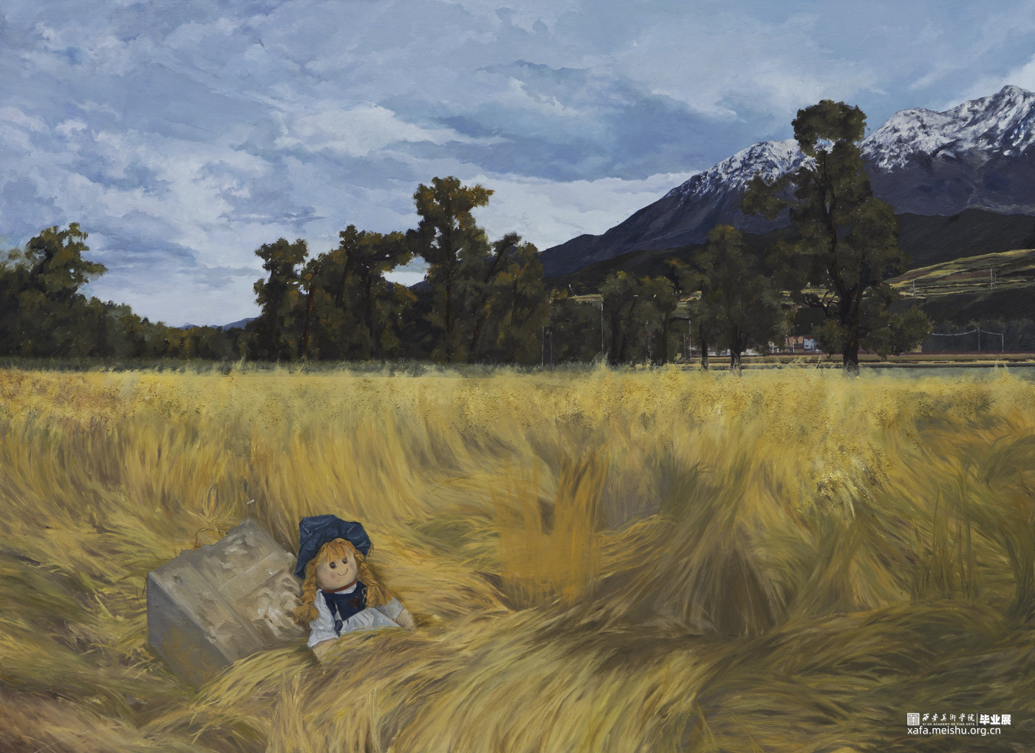 作品《麦田圈》描绘了长势茂密的麦田与一旁被弃置的古老石碑和洋娃娃相对比,人们只关注眼前的物质需求,却忽略了能够让自己更加充实的精神食粮。