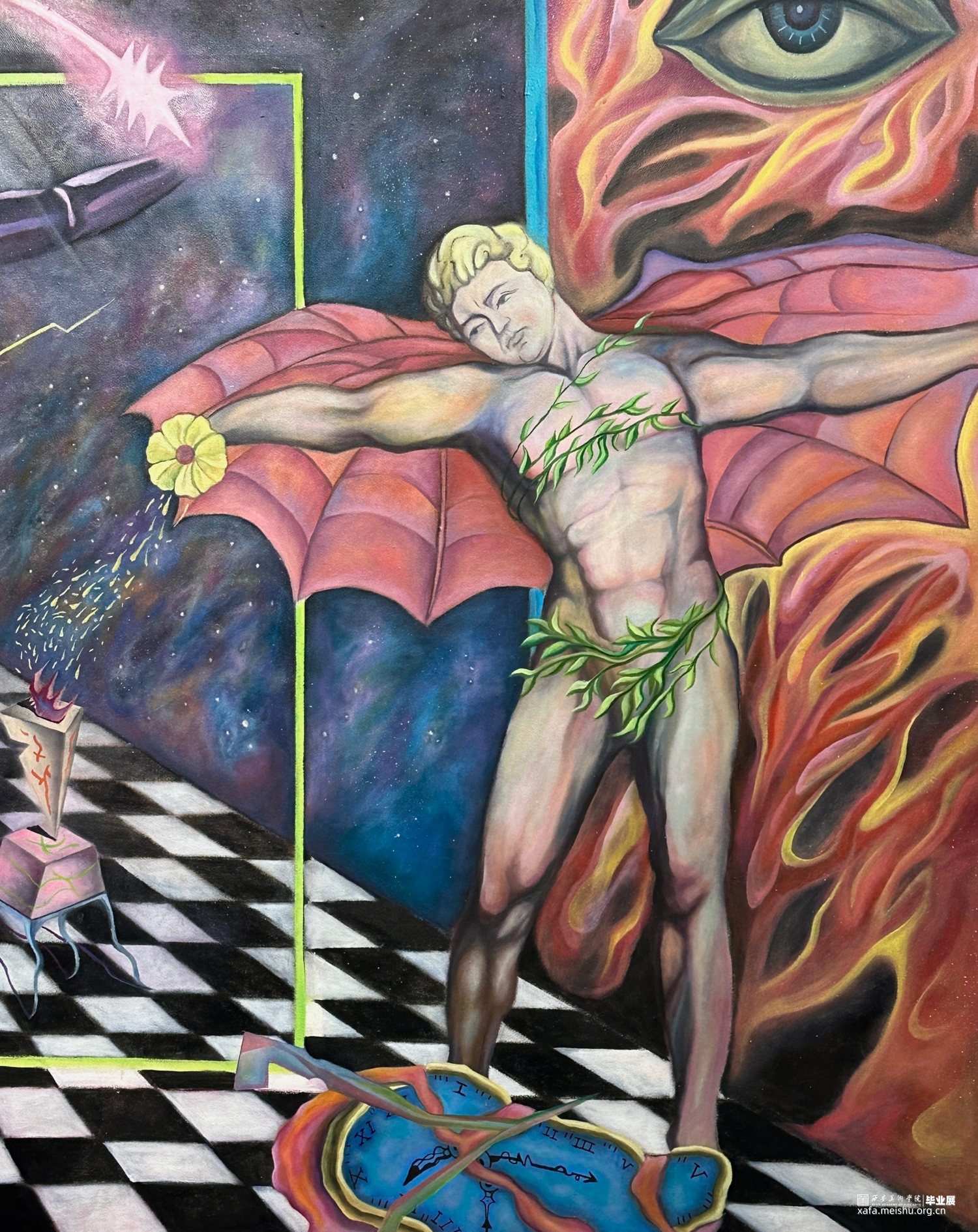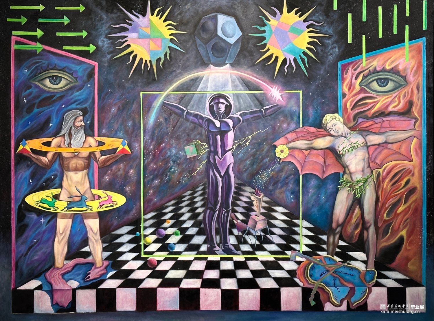 画面中这些物像和场景架构仿佛并不存在和谐关系。但我将这些不和谐的形象并置在画面上时,整体画面在构成与绘画基础逻辑上 却融洽的处于同一环境中,从原来的逻辑关系中割离出来,在创作中充分地重新构成新的关系和秩序。他们原来的存在与现在的存在或许都有属于他们本身的运行规律与呼吸状态。之间的相互作用使得新的画面更加带有我想寻找的宇宙法则。