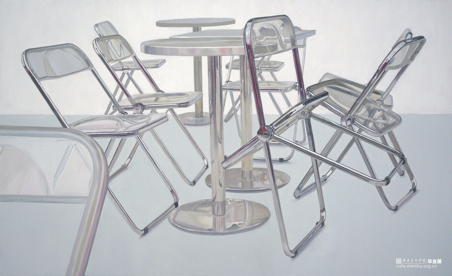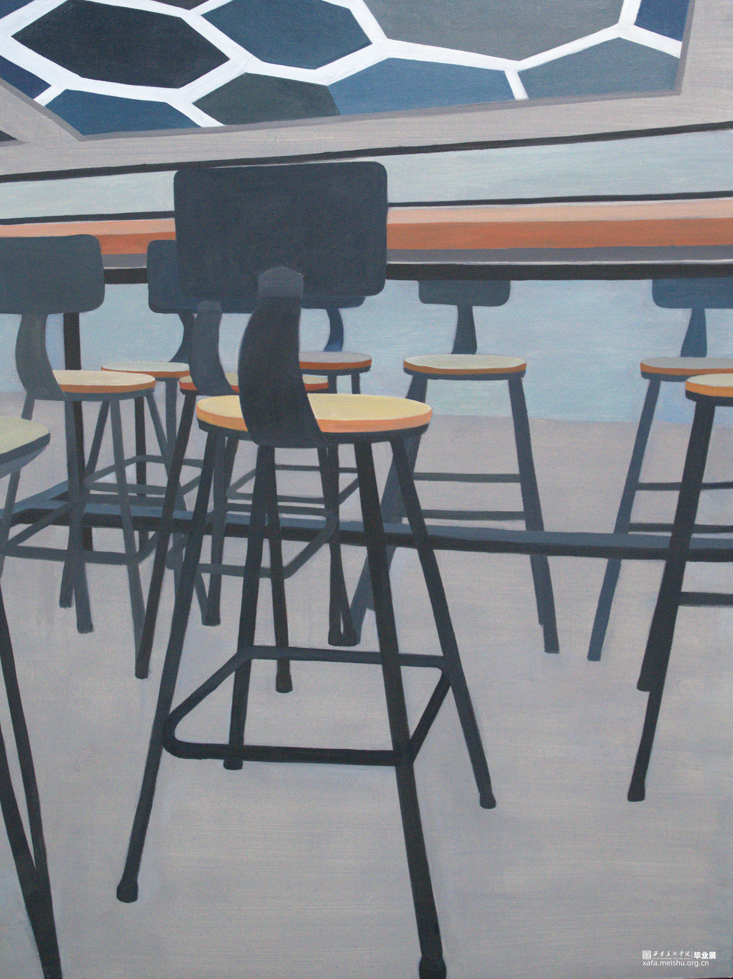 《无人赴约》系列是疫情时期的创作,灵感来源是寻找素材时外面空荡的街道。以往路边热闹的餐厅里空无一人,空无一人的座位像是在等待,又像是在守望。这些场景触动到我,所以我以椅子为主题进行创作,将椅子在不同空间中排列组合,尝试寻找时间与空间中微妙的关系。《无人赴约1》选择用最质朴的手法传达最直接的情感,画面采用利落的线条,简化的几何平面化,探索当代油画的创新表现手法。《无人赴约2》尝试用更细腻的手法描绘画面,和系列一形成对比,用静谧、平静的画面引发观者内心的思考,表达作者思想的同时传达作者的内心世界。