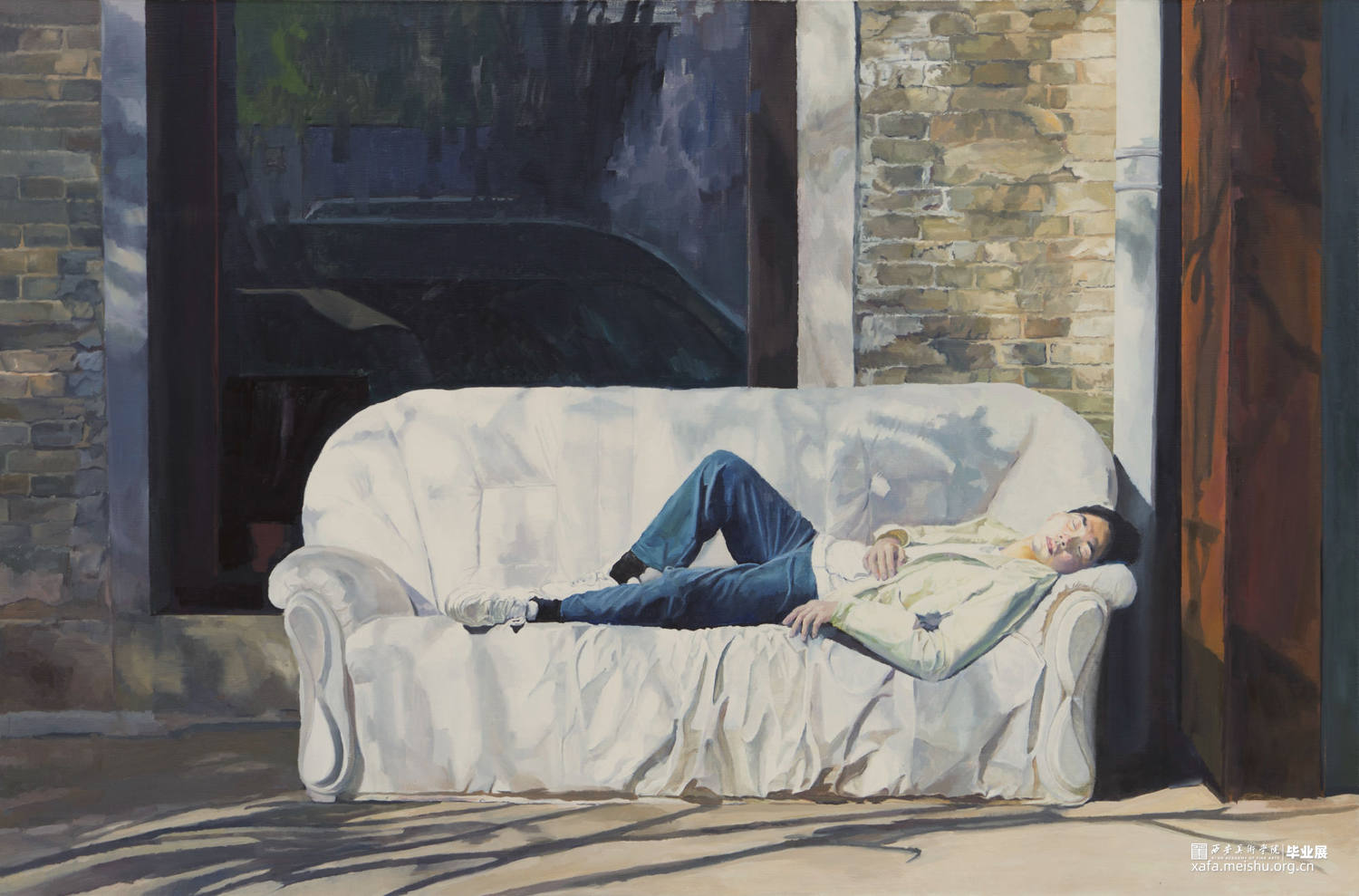 人物画是美术史上一个永恒的主题,对于在油画系里学习的四年中我一直在寻找自己喜欢的主题。通过对美术史的学习,以及老师的指导我对委拉斯贵支产生了强烈的喜欢。其中卧姿维纳斯式的构图从威尼斯画派的乔尔乔内《入睡的维纳斯》、提香《乌尔比诺的维纳斯》、再到委拉斯贵支《镜前的维纳斯》,一些列的传承使我看到不同时期不同艺术家在对同一个主题进行创作。让我对卧姿维纳斯主题有着浓厚的兴趣,也想根据自己所处的时代下创作出当代的卧姿维纳斯。所以我在《时光》中的构图上采用了经典卧姿维纳斯式的构图,主要人物躺在白色的沙发上与周围的环境