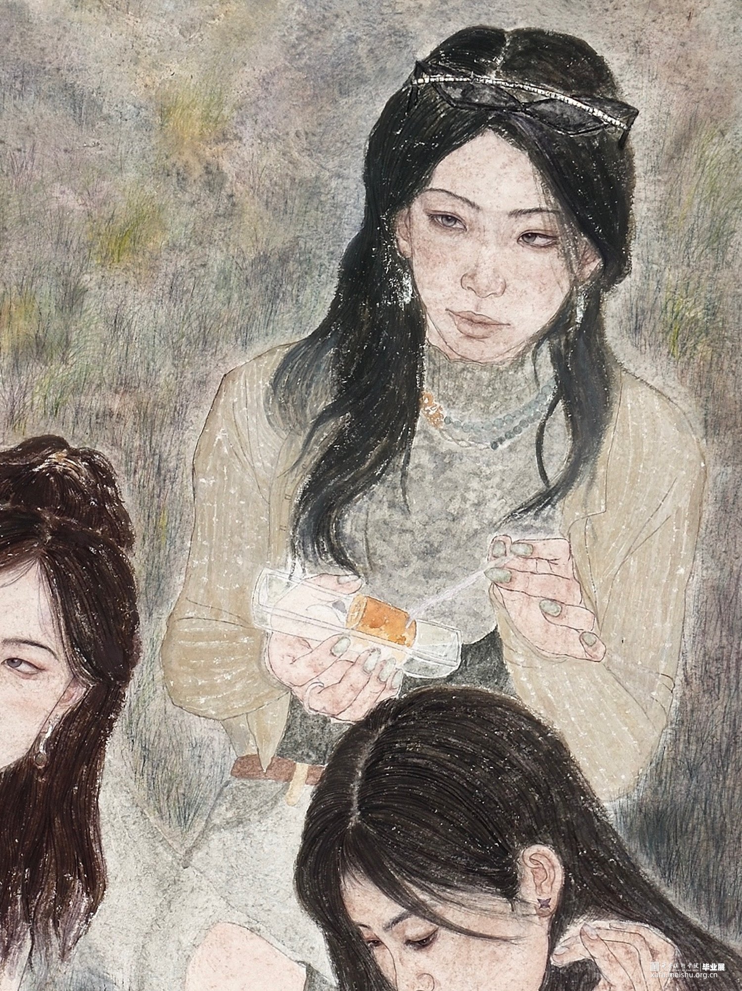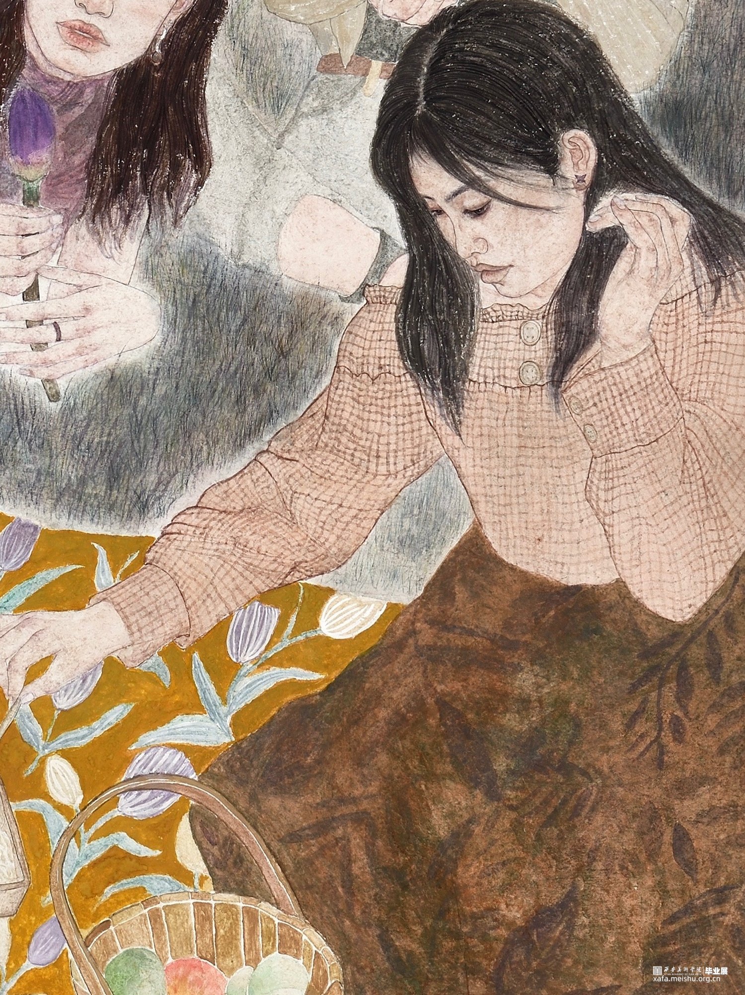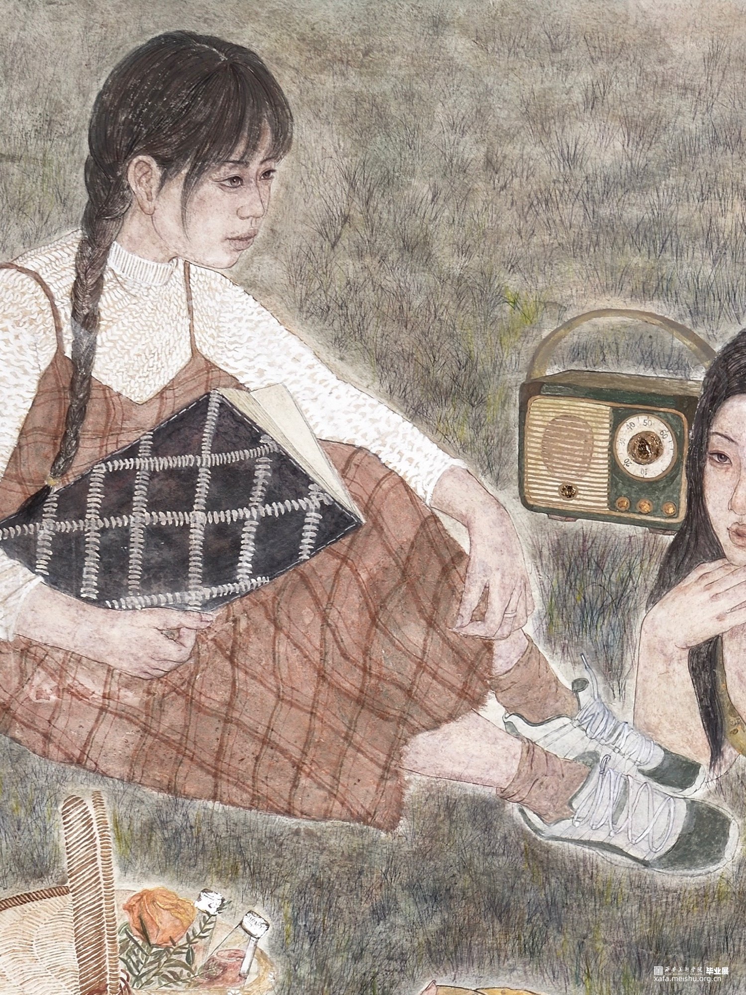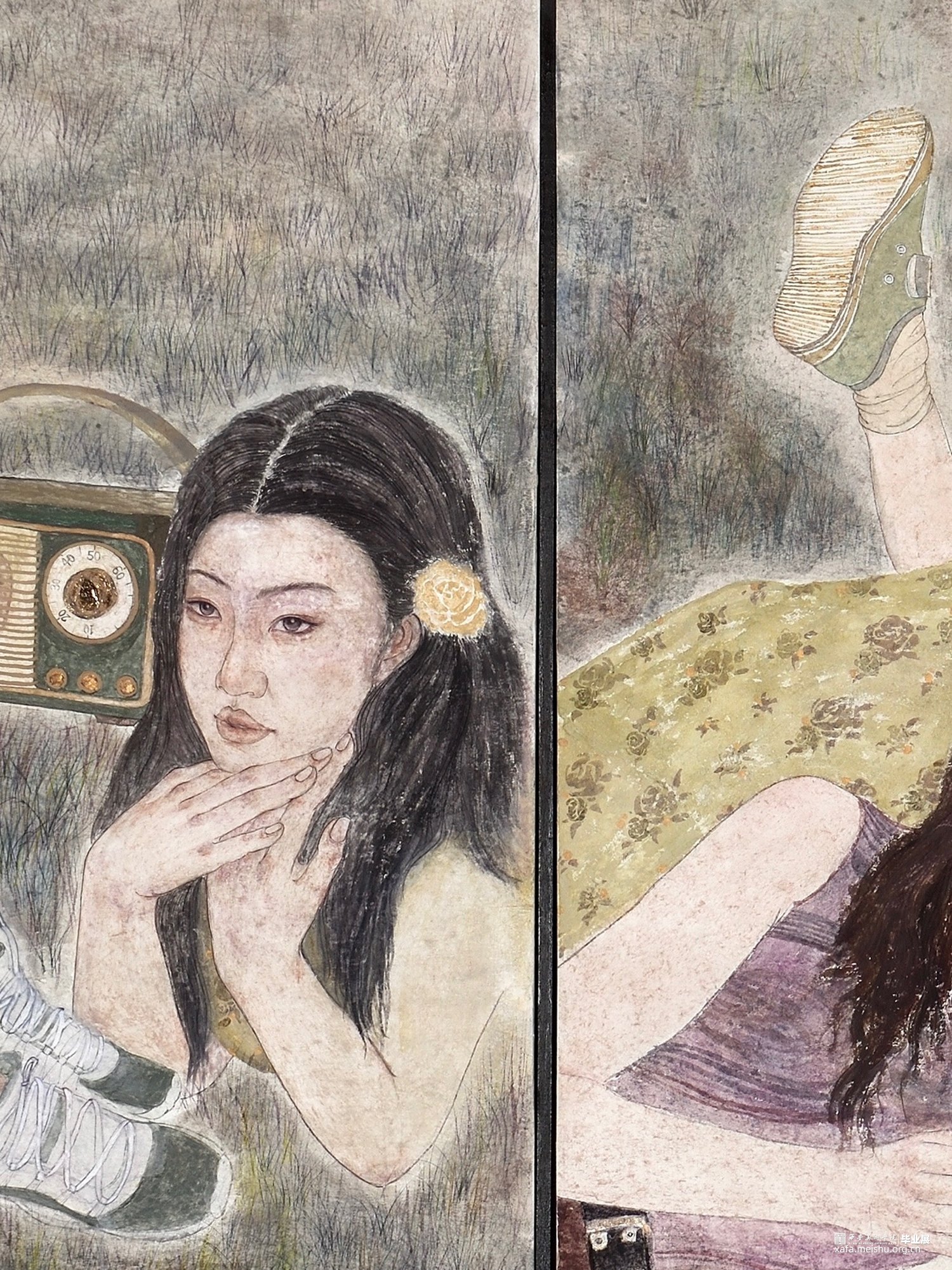 《旷野伊甸》是将岩彩的和重彩工笔的技法,相互借鉴与结合起来,整个过程像是在混乱中寻求某种秩序。做底色,沥粉,贴箔,使抽象的作品慢慢变得具体;在这个过程中我也慢慢寻找到自己的节奏:与其畏首畏尾,不如狂野一点,真诚一点。祝愿大家都能找到自己内心的那片“旷野”。