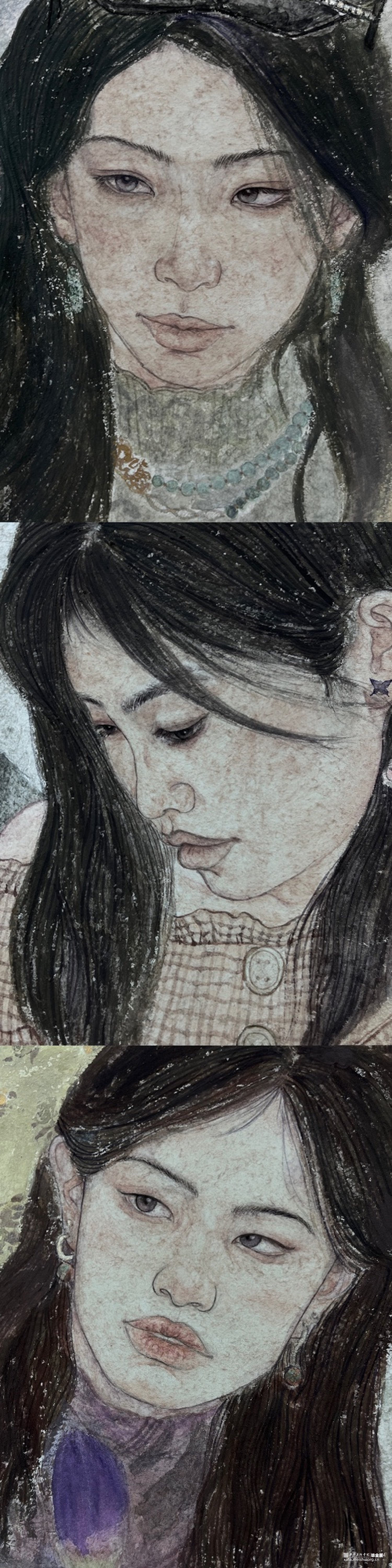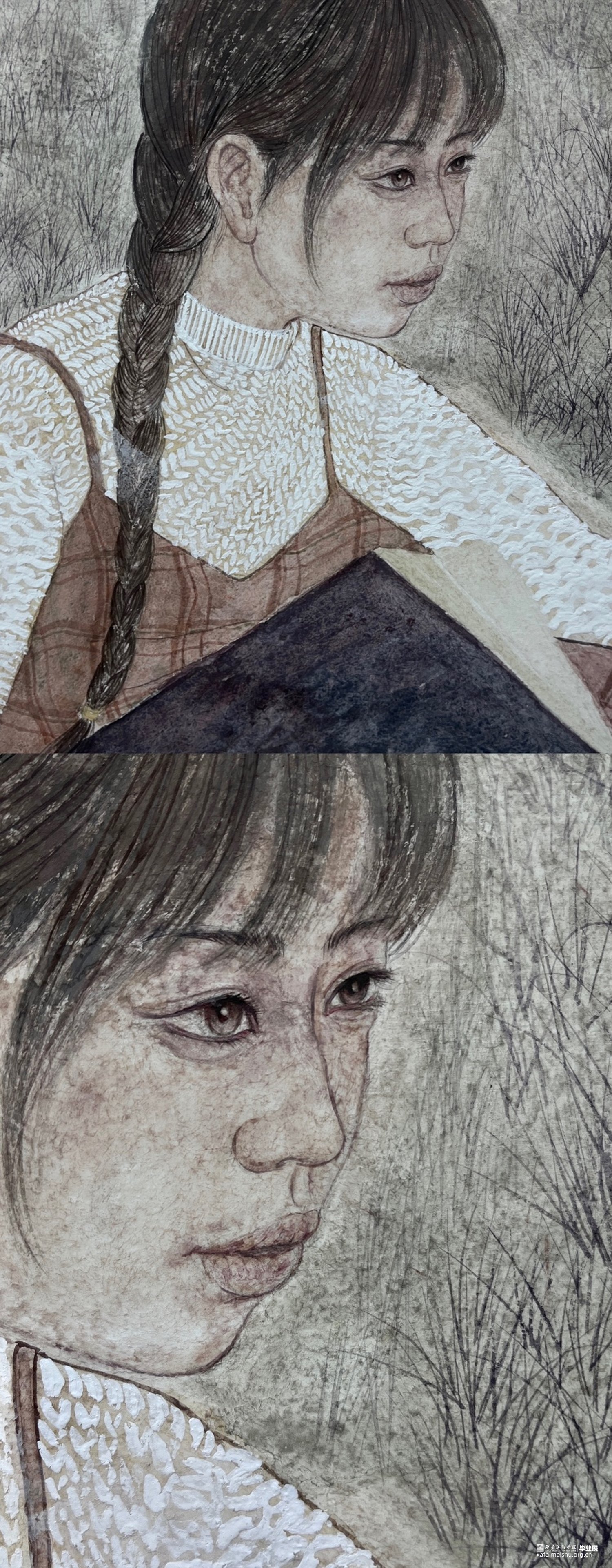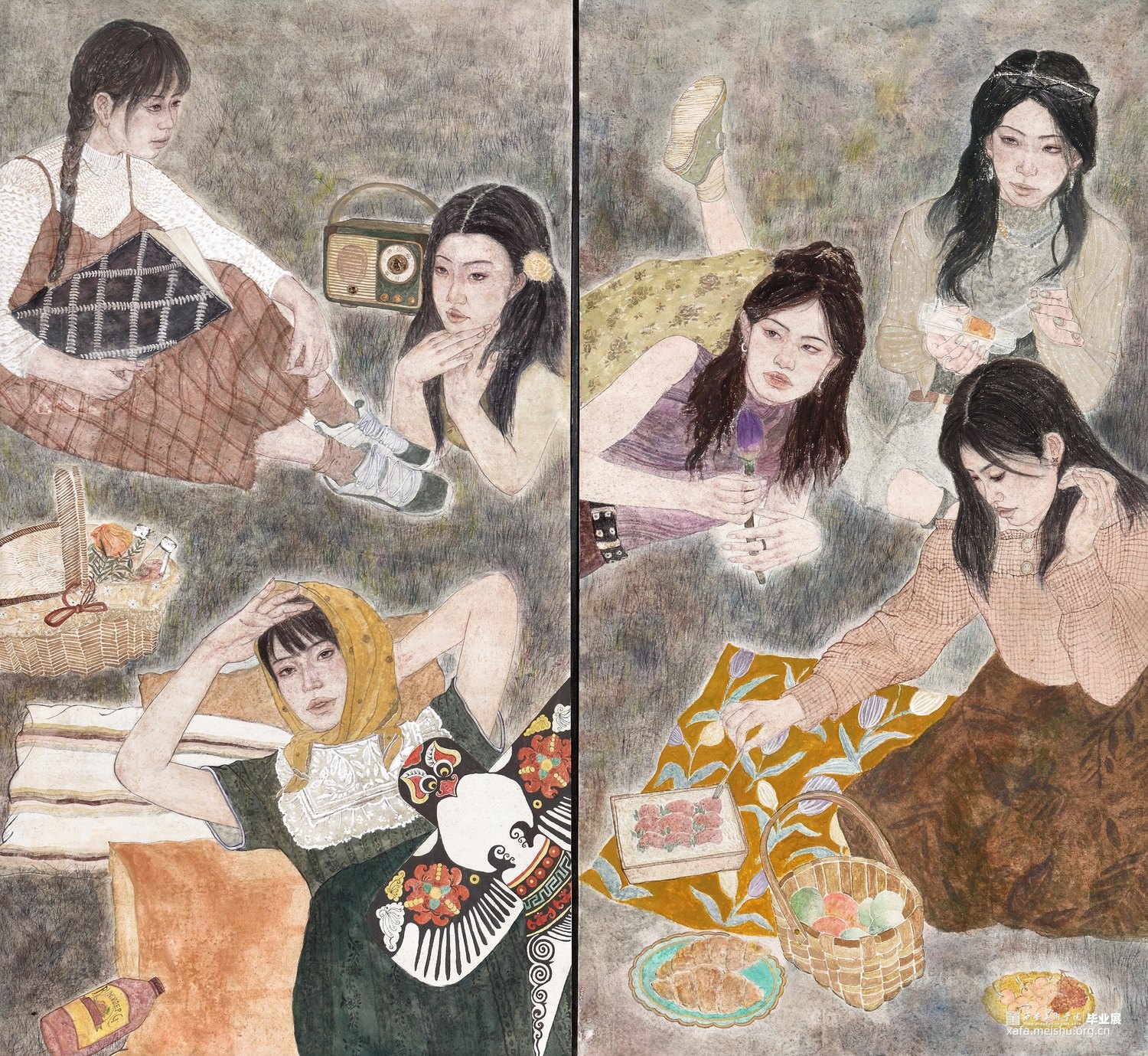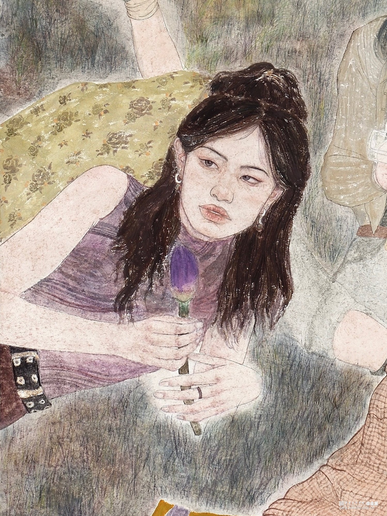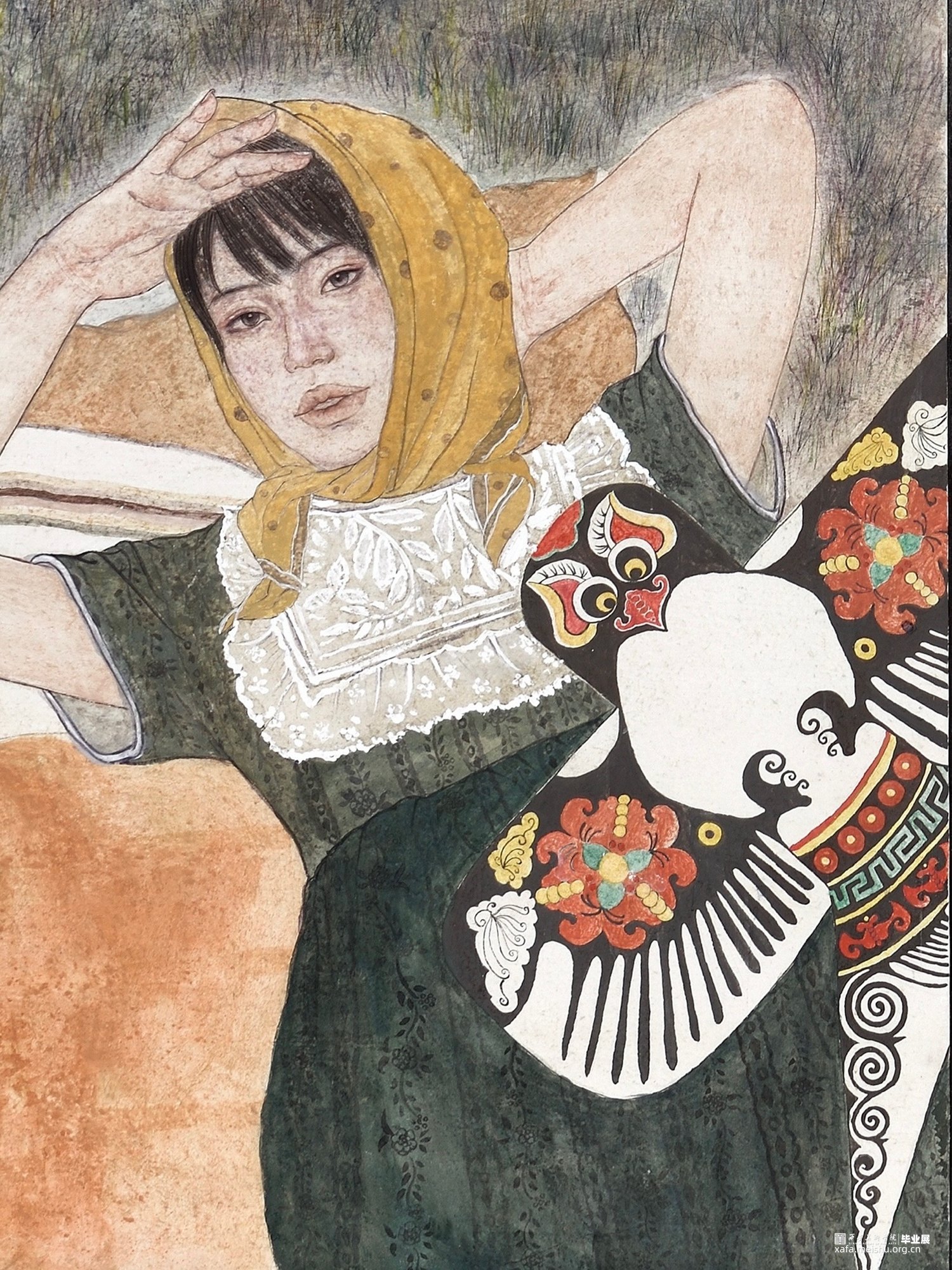 《旷野伊甸》是将岩彩的和重彩工笔的技法,相互借鉴与结合起来,整个过程像是在混乱中寻求某种秩序。做底色,沥粉,贴箔,使抽象的作品慢慢变得具体;在这个过程中我也慢慢寻找到自己的节奏:与其畏首畏尾,不如狂野一点,真诚一点。祝愿大家都能找到自己内心的那片“旷野”。