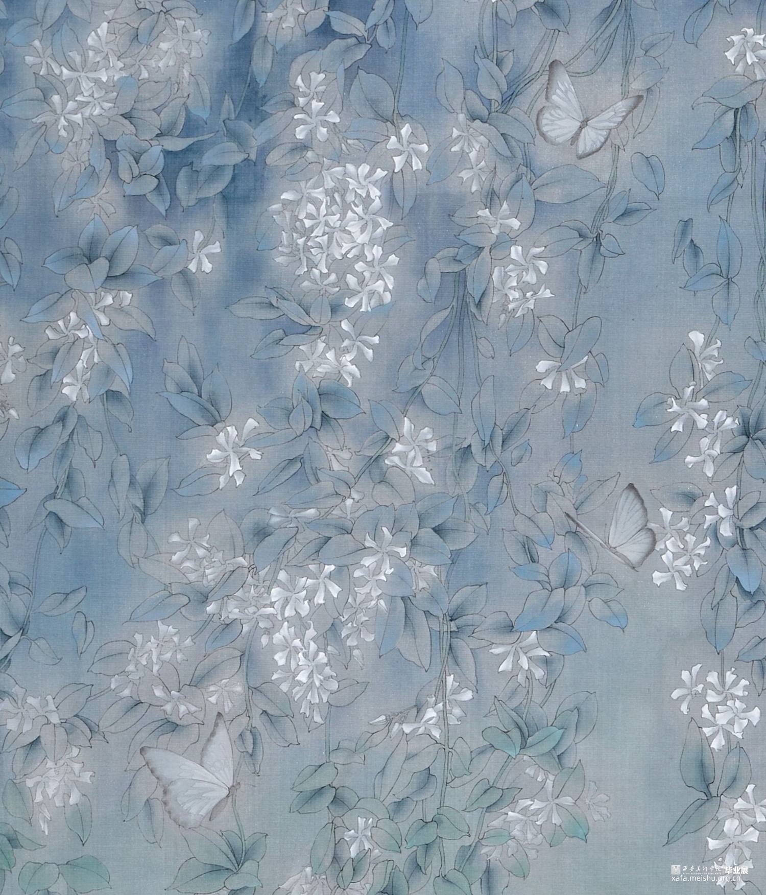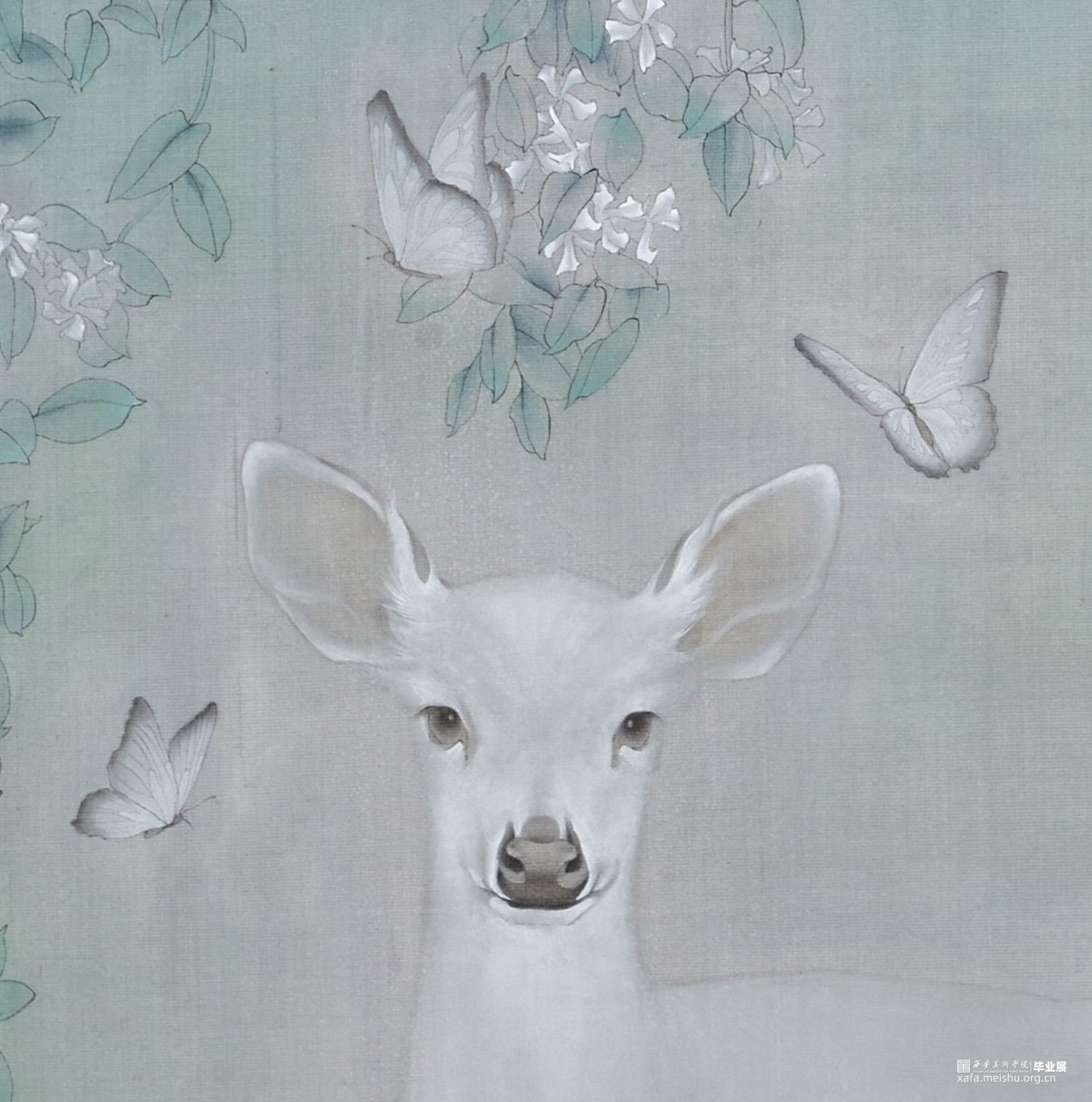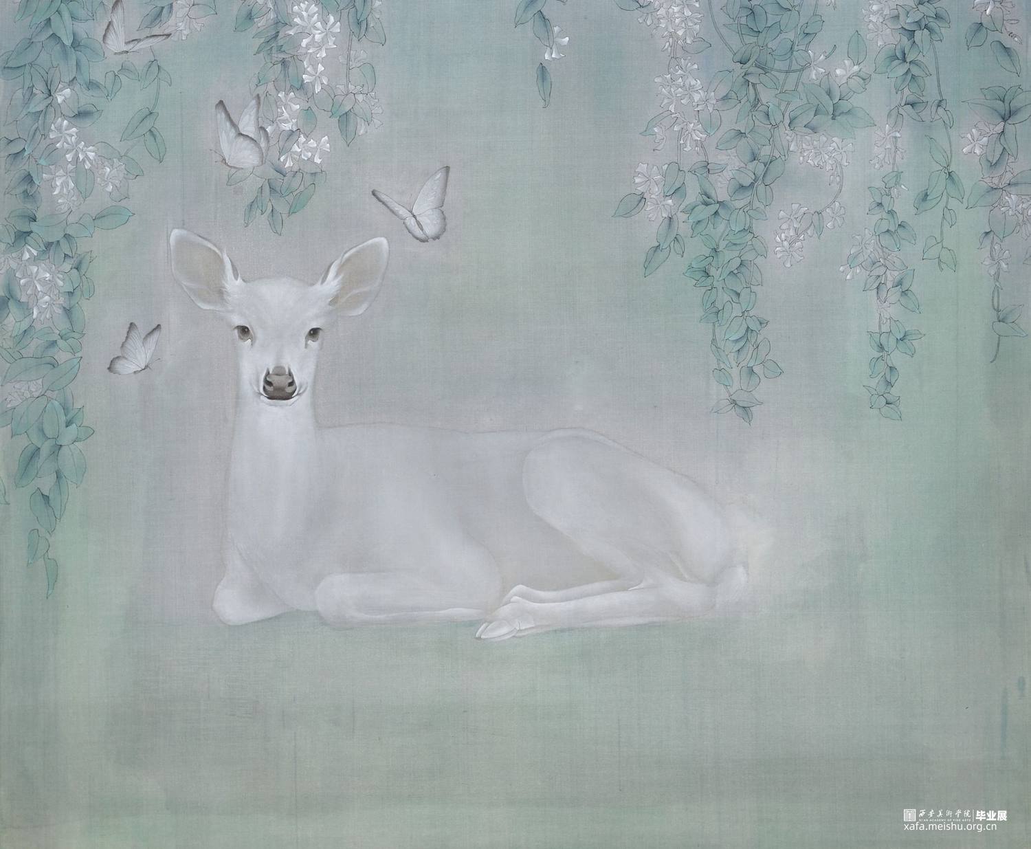 树深时见鹿,画面中层层叠叠的叶片之中形似风车的花朵发出隐隐的白光,带着些许晨露的湿润,白色的小鹿盘踞之下,眼望前方,从容而又安静。飞舞的蝴蝶围绕而上,展现出神秘而又富有生机的景象。