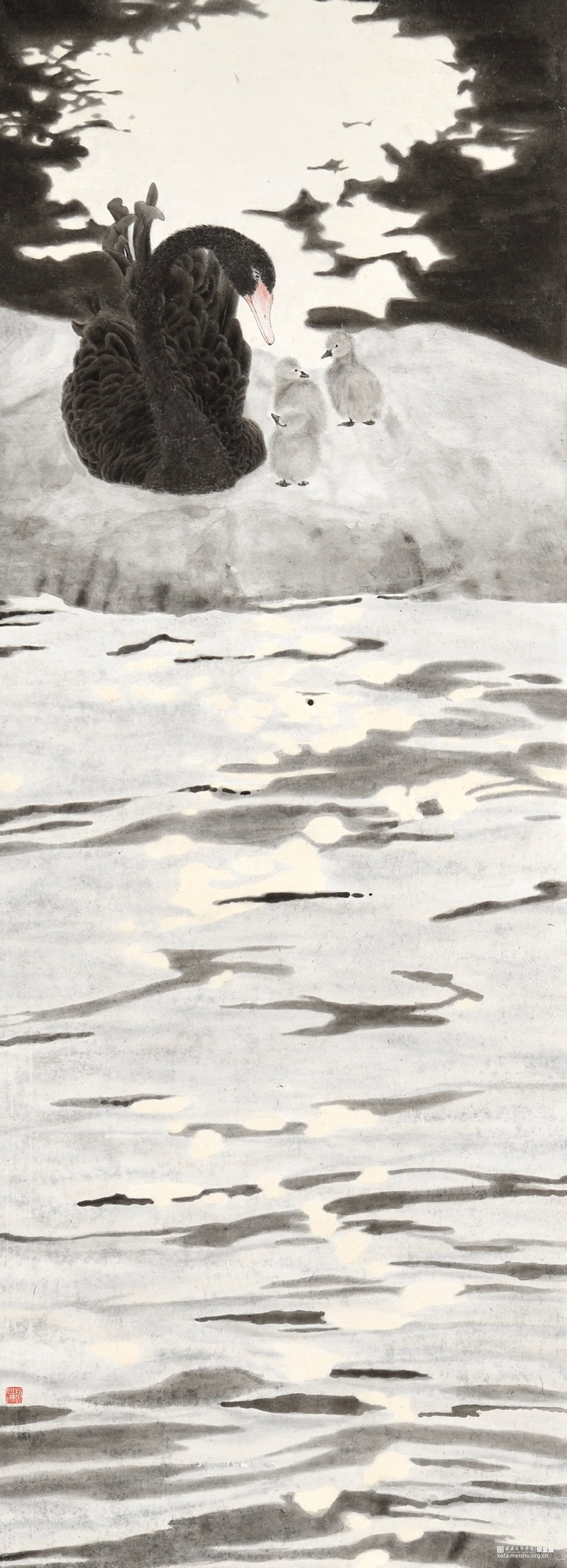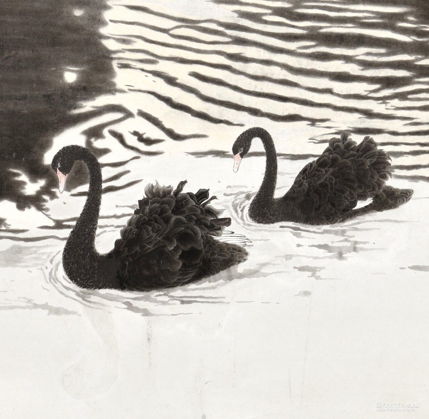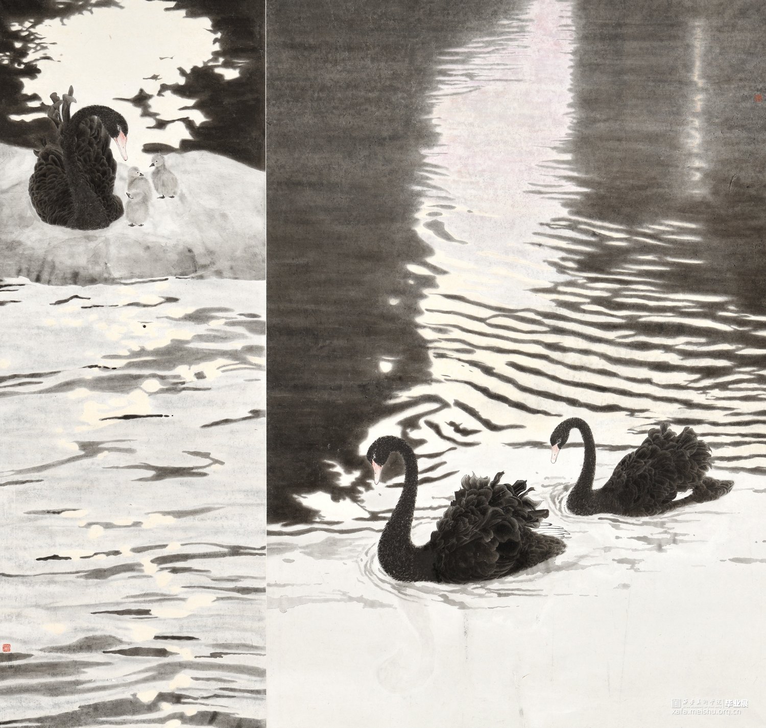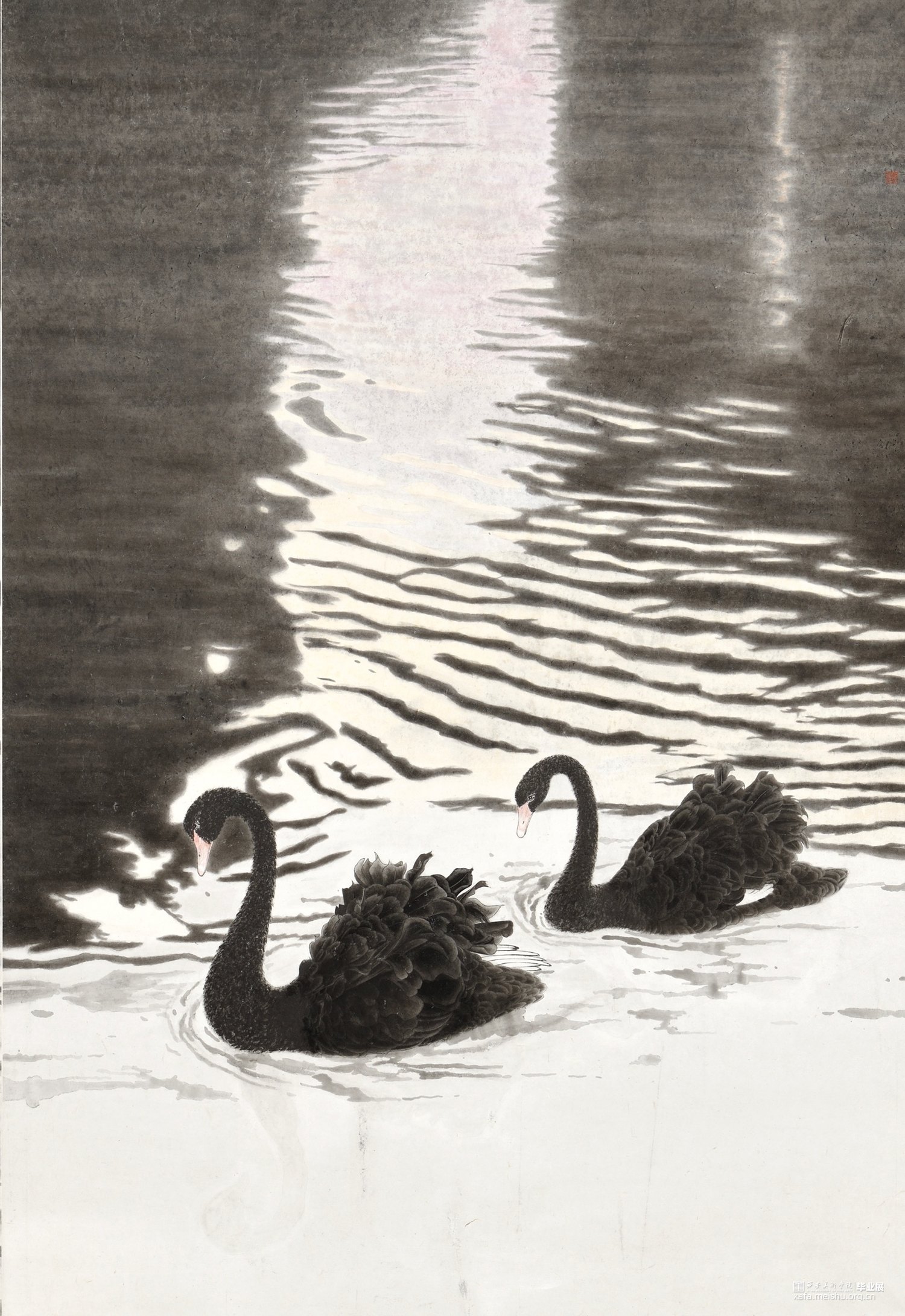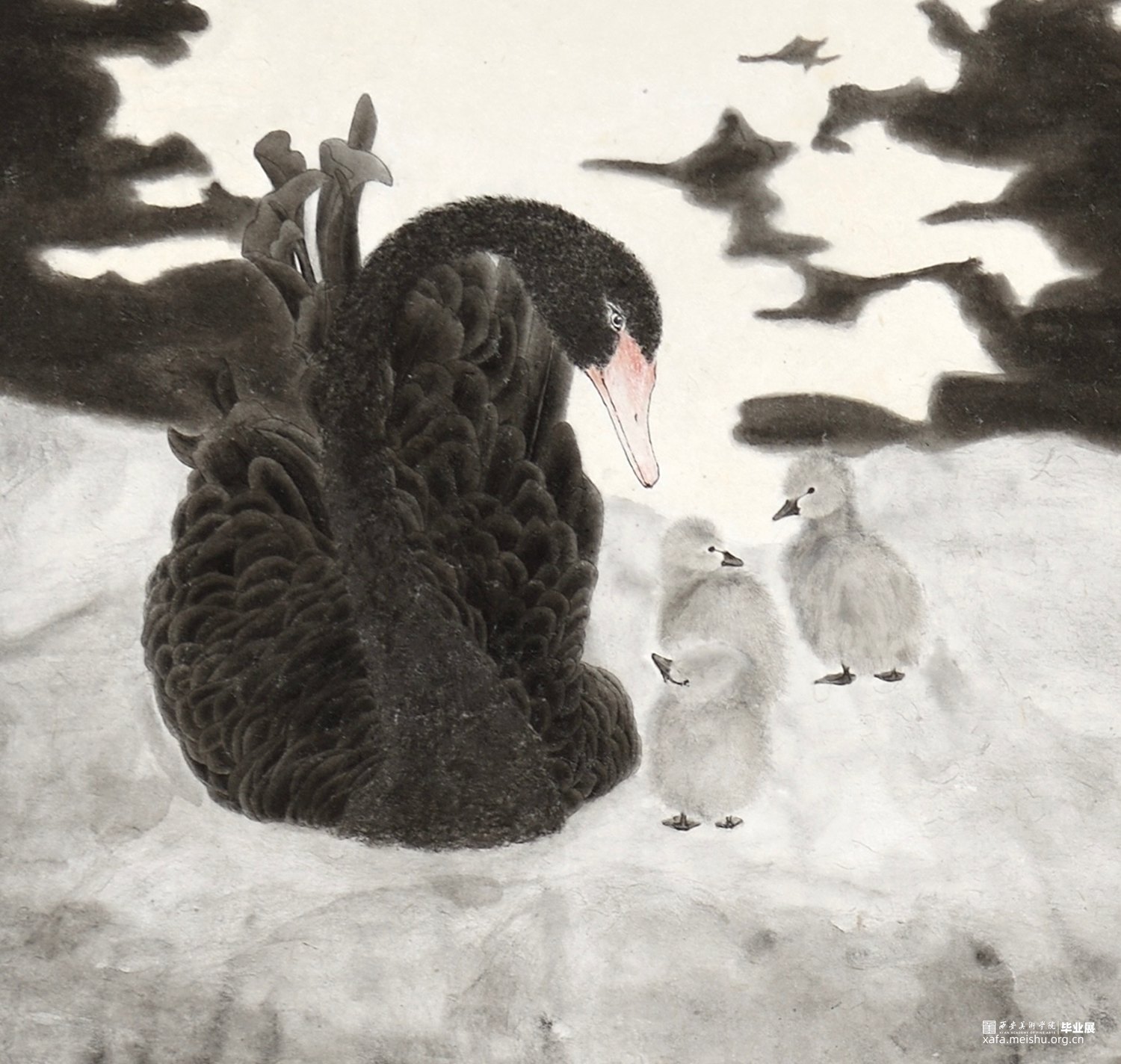 艺术来源于生活,作品意在表现身边的美好。夕阳的余辉透过霞云,湖面波光粼粼,天鹅依依多情。