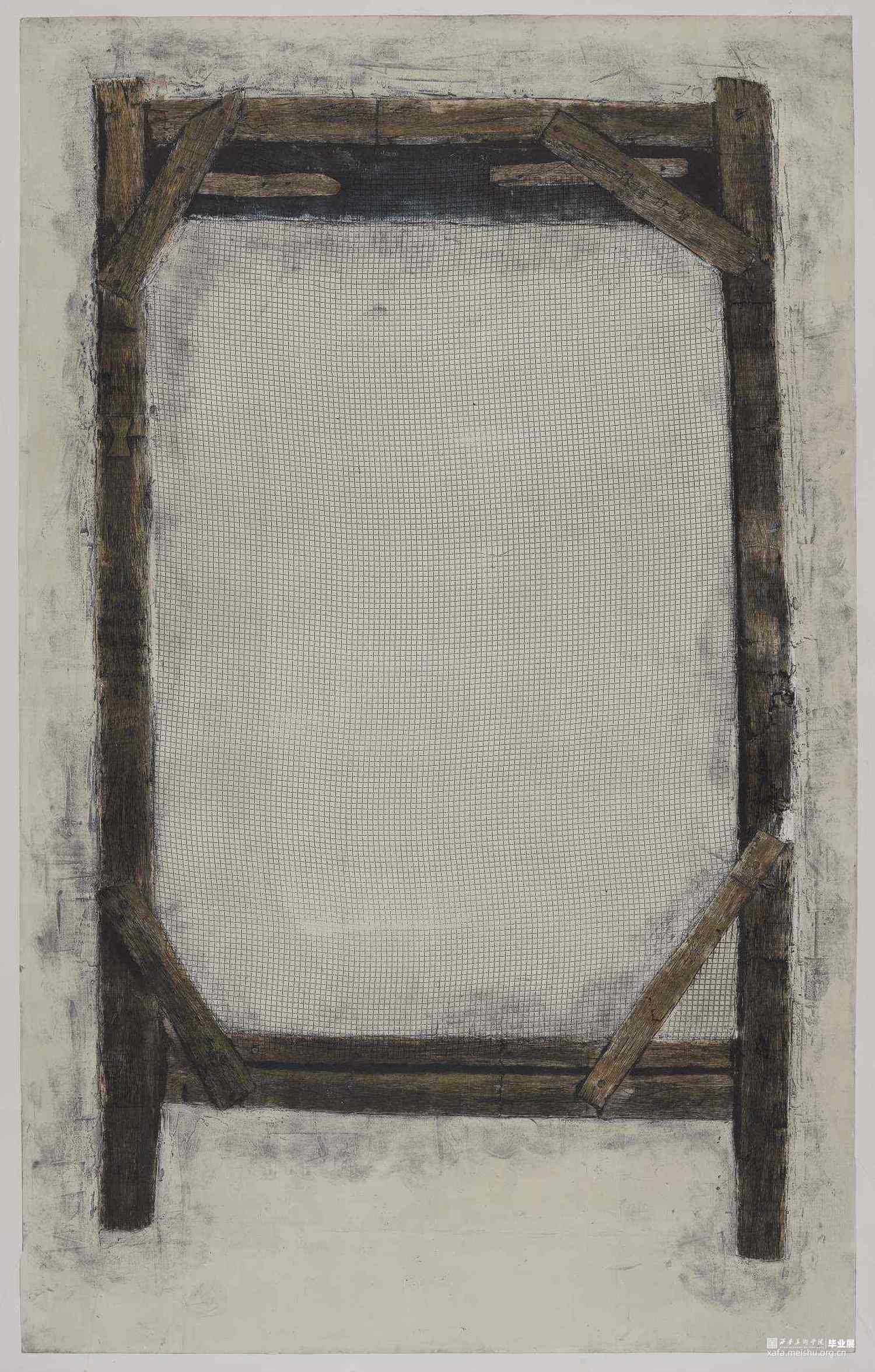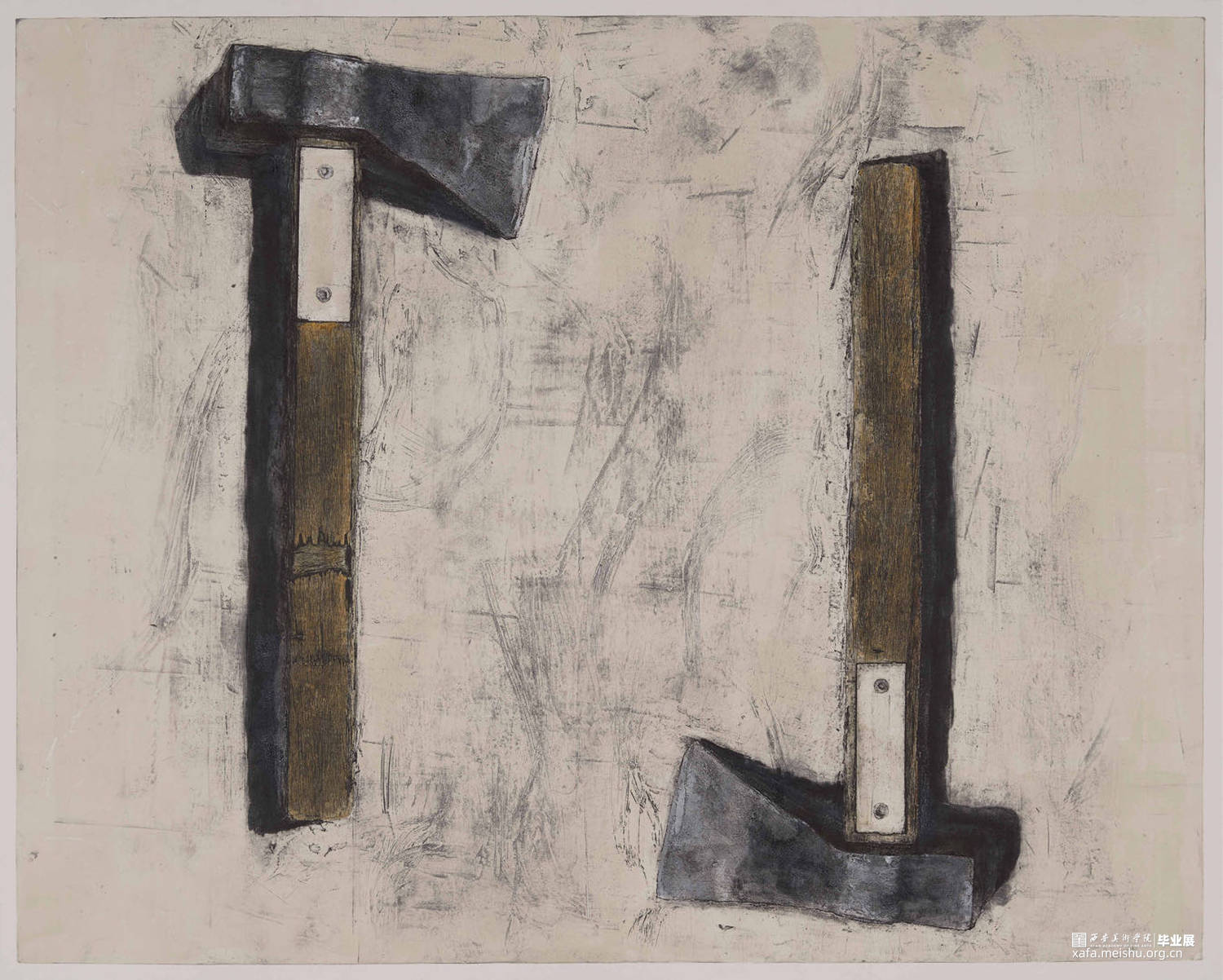 《筑城者》系列作品运用五个芳动工具来创作作品,用了综合材料版国胶砂技法与木板凹凸印技法完成作品。改革开放后中国大力发展经济,而人民群众则是发展的主力