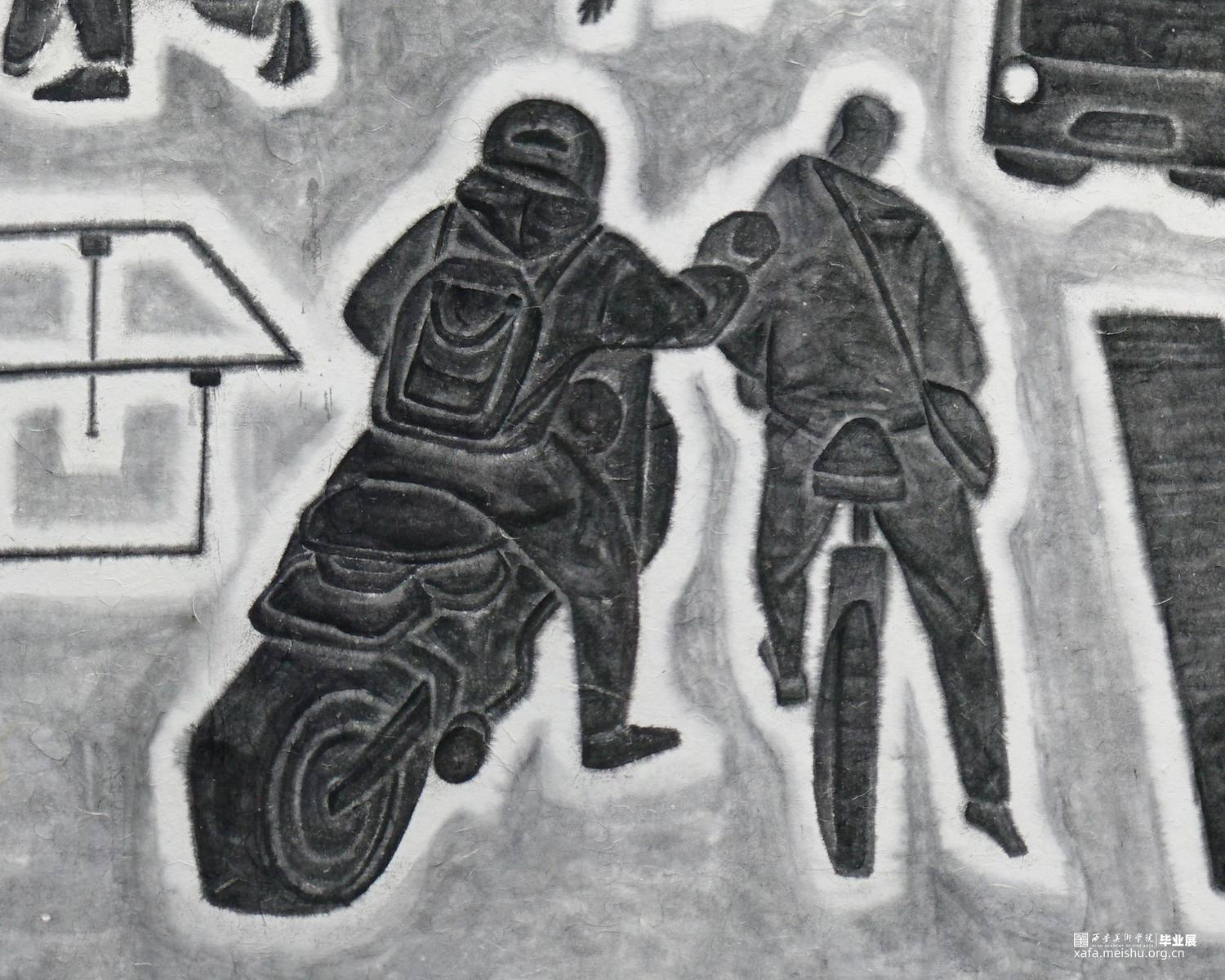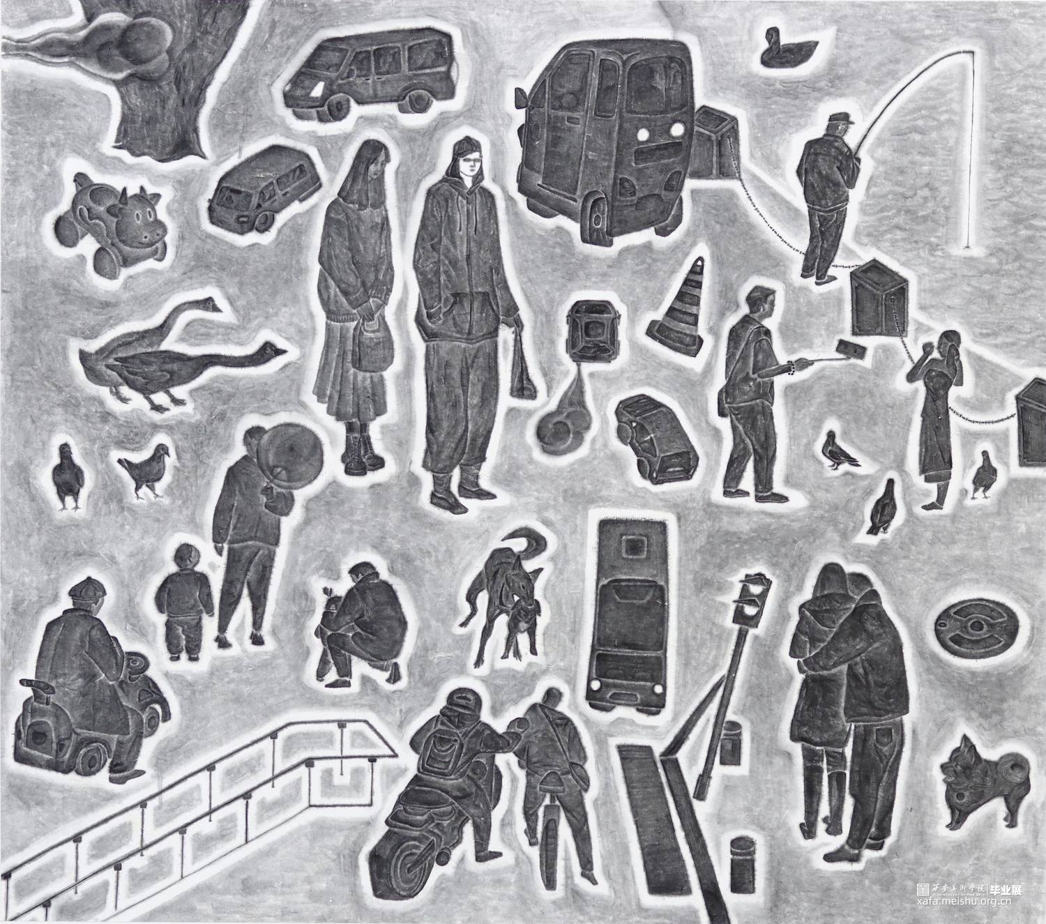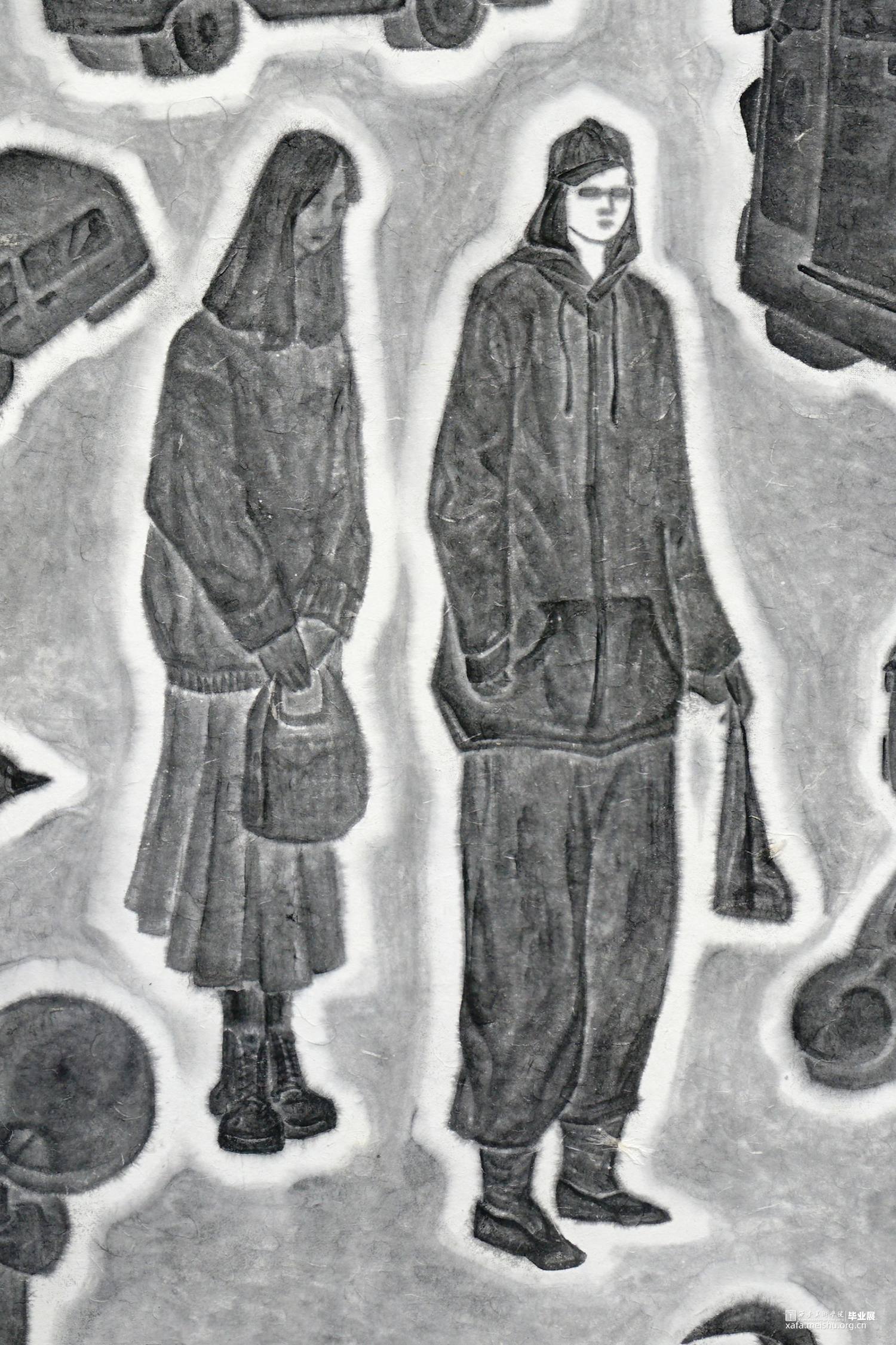 作品参照汉画像砖的布局,表现所见所闻所想的现实生活,将多个场景自由的安排在同一画面,突破传统焦点透视的局限,扩展图像的叙事性。