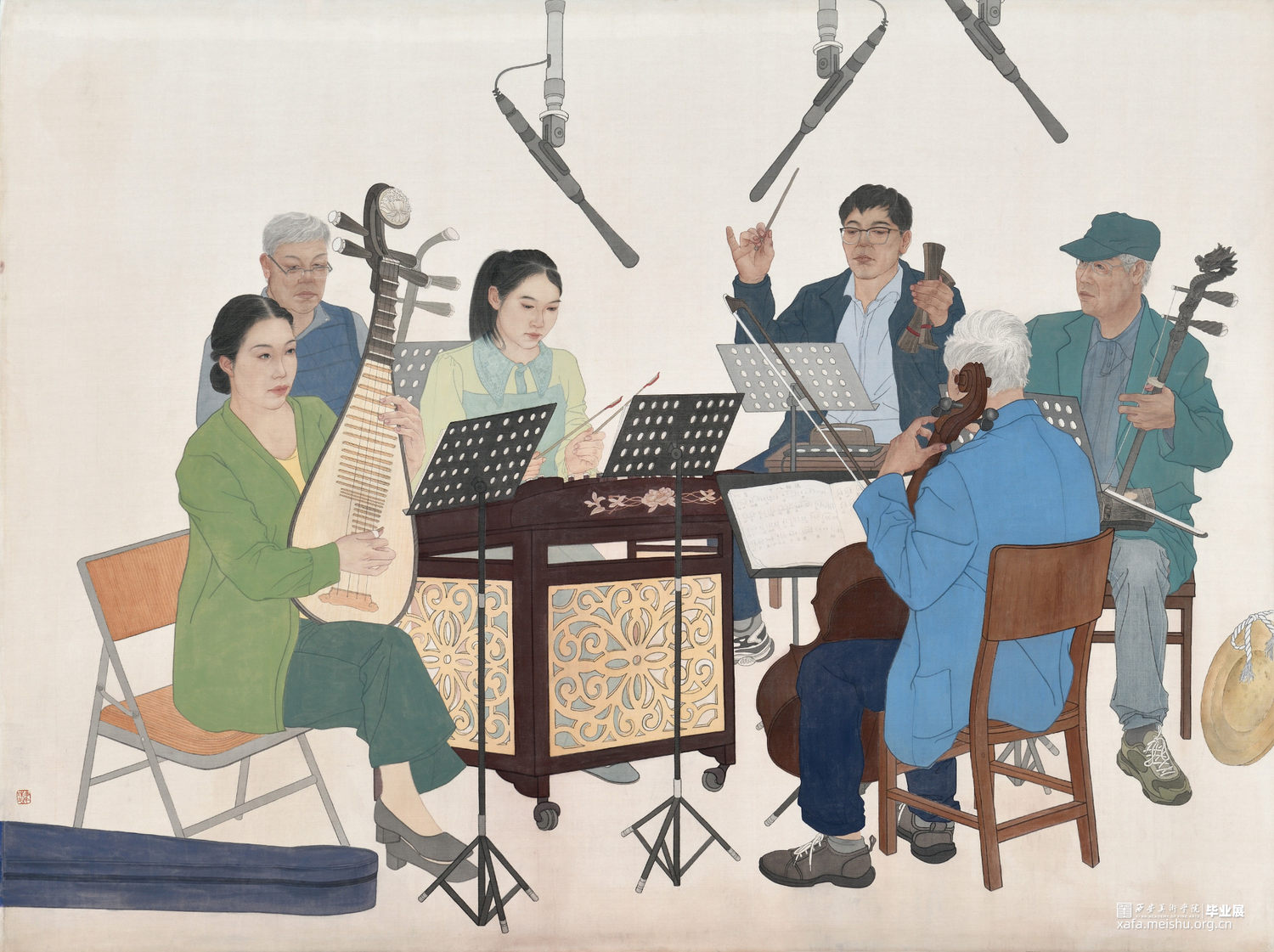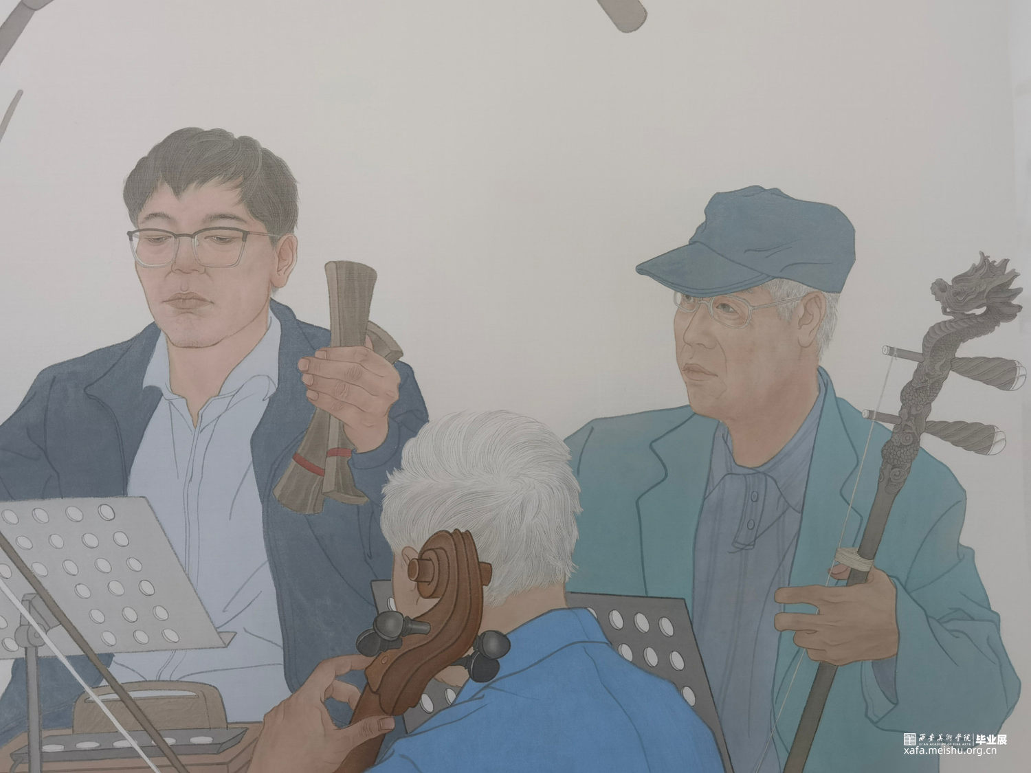 我描绘了瓜沥锦绣越剧团在哥德曼彩排室为尽情演奏的景象。从我记事以来,外公就一直在拉胡琴,这是他一生所爱,因此胡琴和越剧也伴随着我的成长。希望人们欣赏戏曲表演的时候,也可以偶尔看看在舞台一角的演奏者们,他们也在散发耀眼光芒哦~
