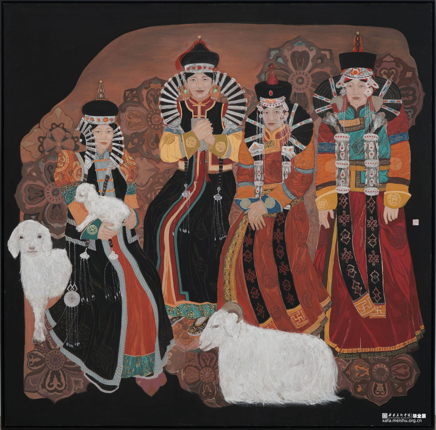 蒙语吉日嘎郎图直译汉语是幸福吉祥的人,契合本画画风,借蒙语谐音,凸显画中人与羊的幸福和谐。