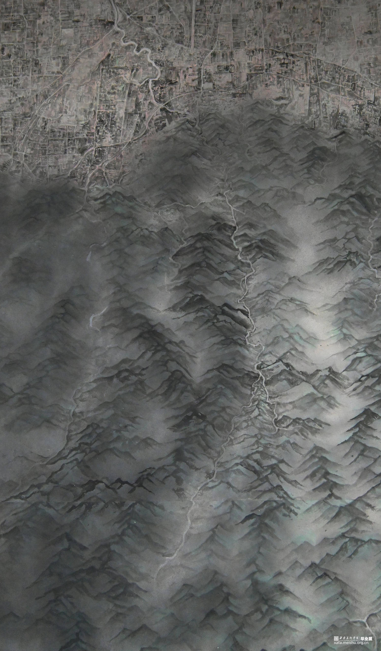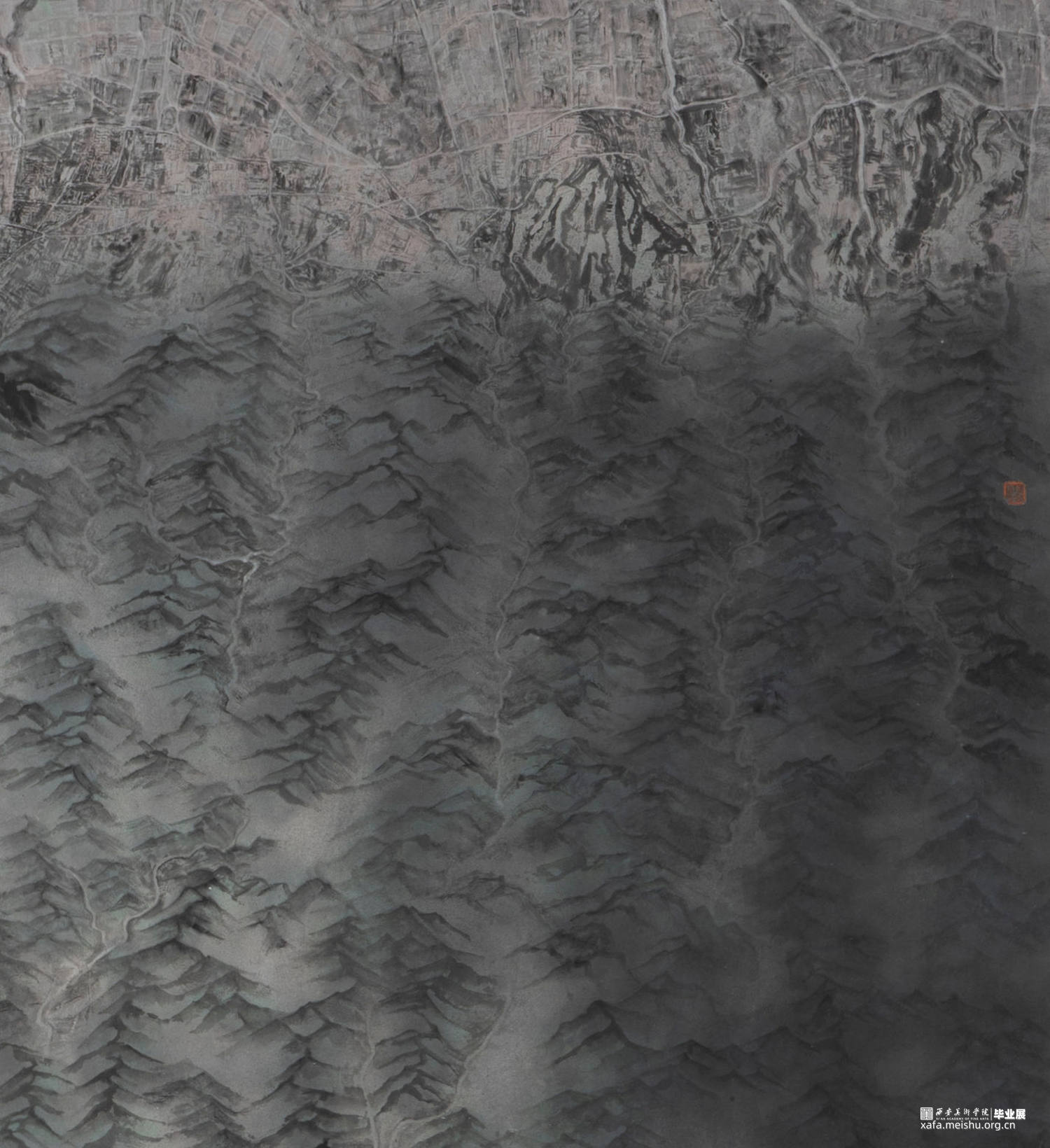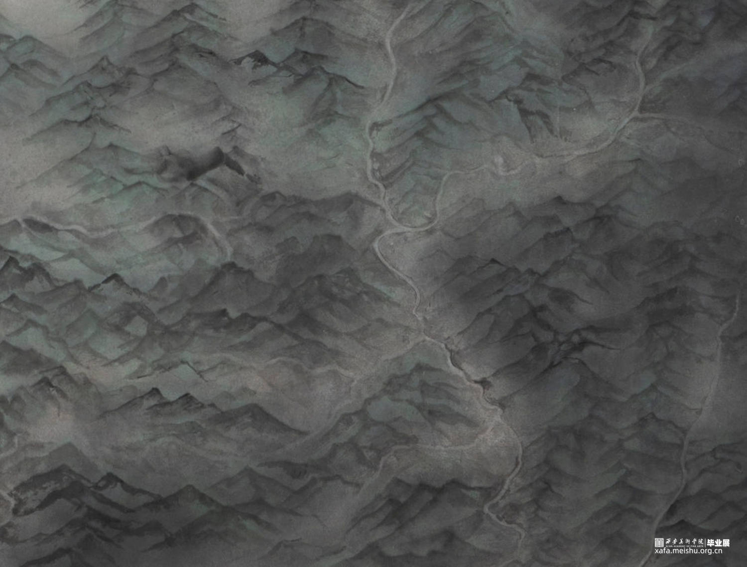 以高空俯瞰的视角描绘西安南部秦岭山脉,用大面积山脉重叠堆砌的形式表现出秦岭千山万壑,层峦叠嶂,连绵不绝的气象。从极高的视角俯瞰大地,城市和乡村在广阔的山峦之上显得格外遥远而渺小,河流如闪电将山脊劈开,层层褶皱的山间似乎支离破碎却又浑然一体,气势磅礴,不禁感叹大自然的鬼斧神工。