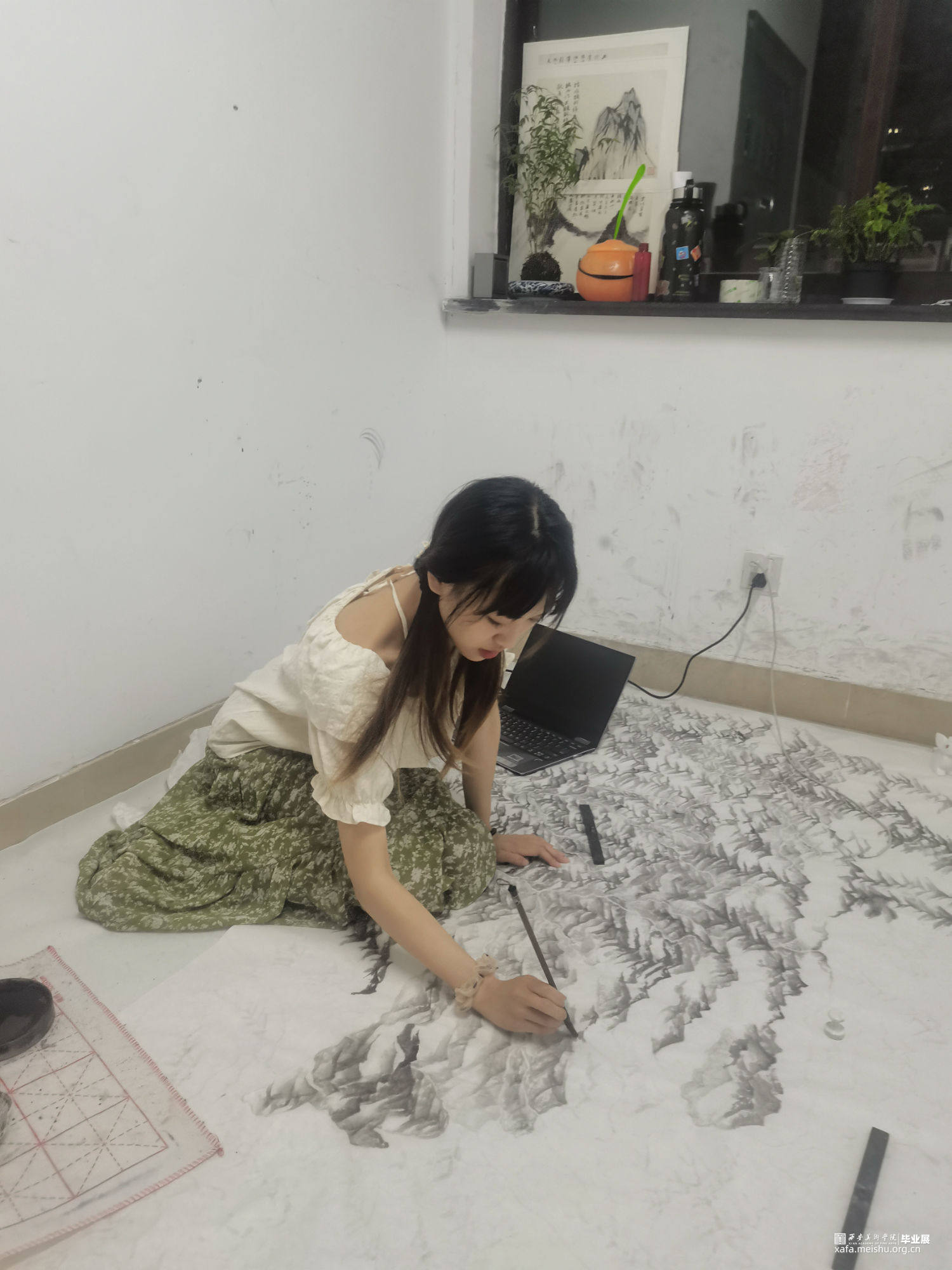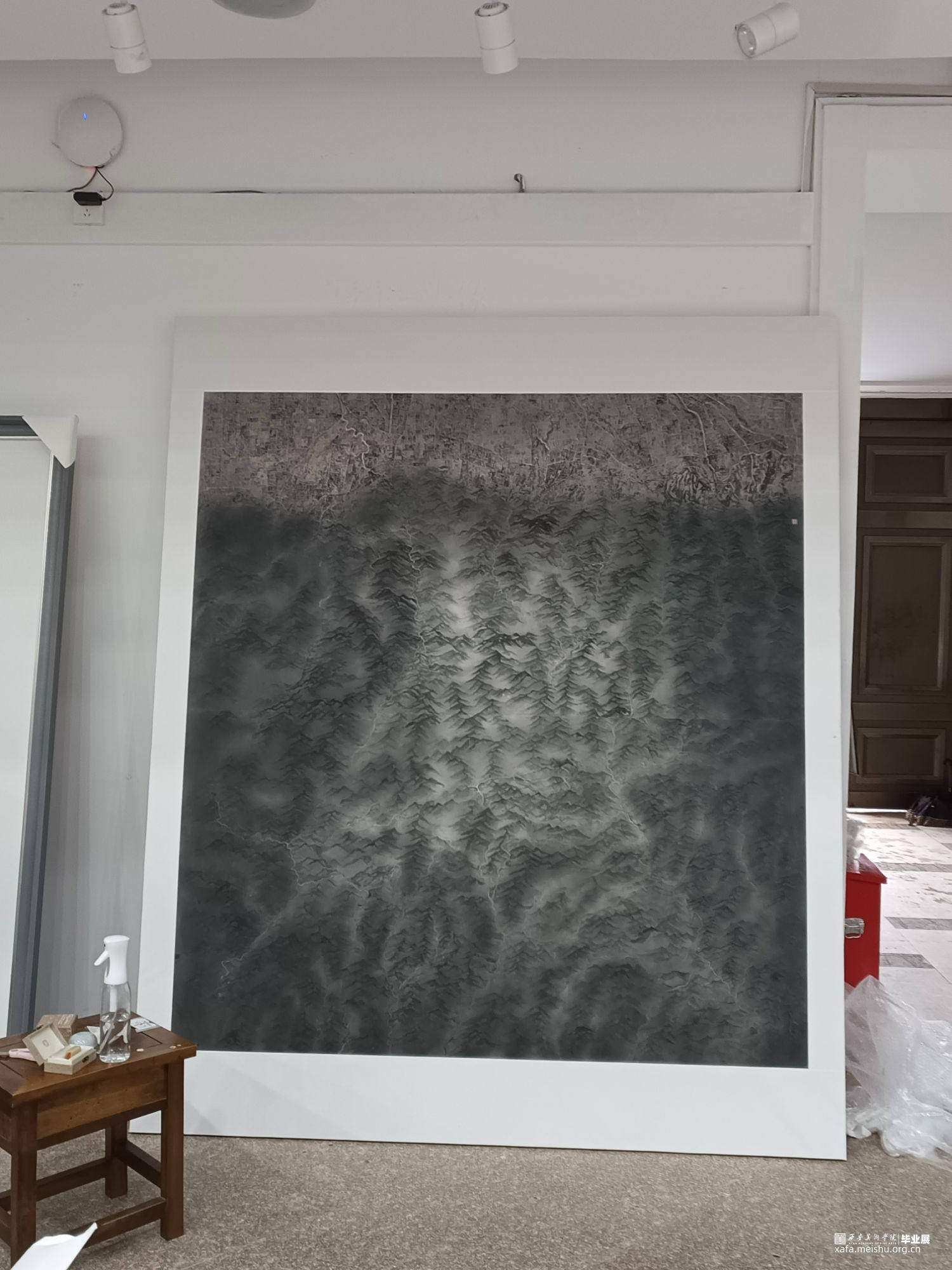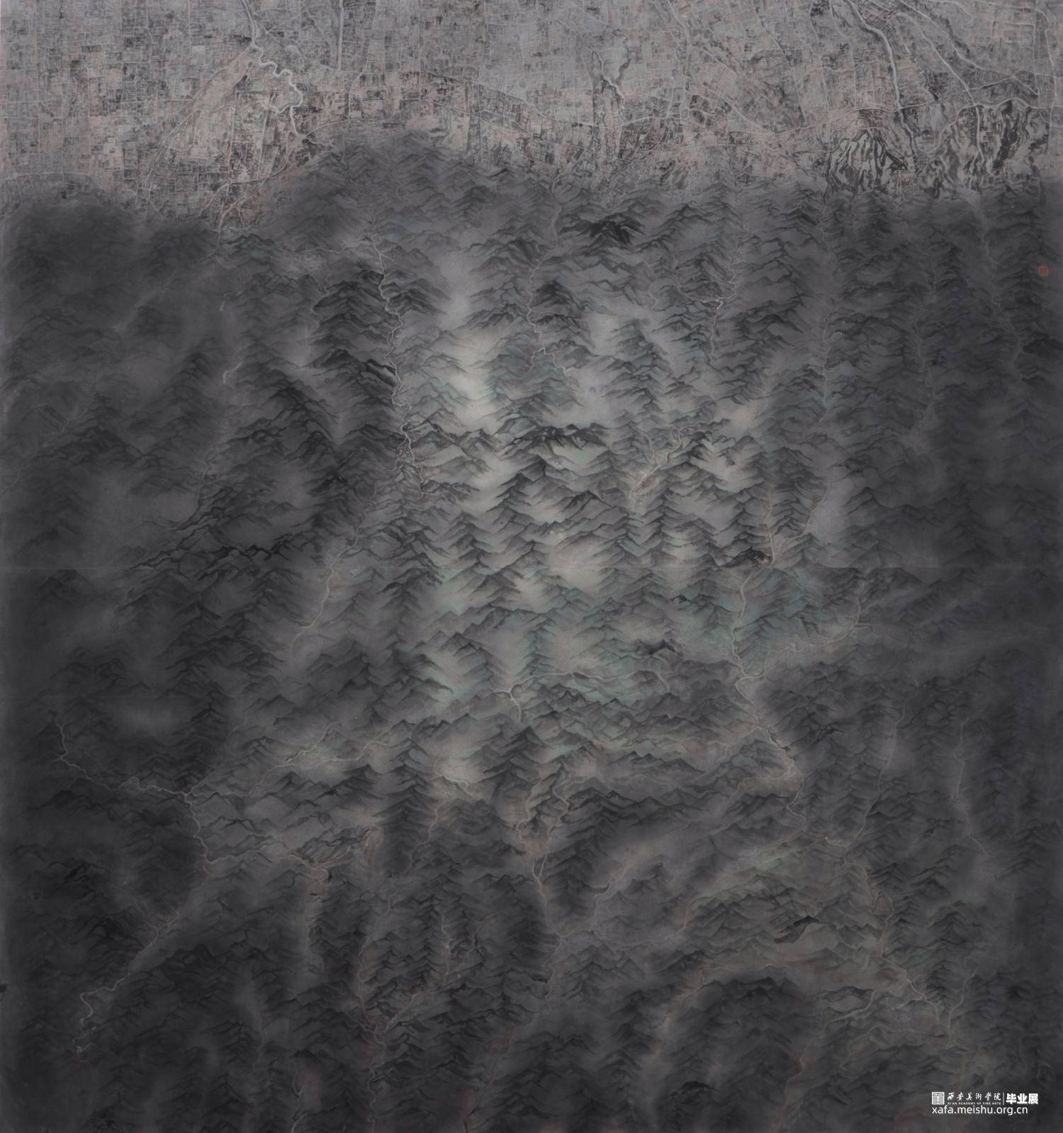 以高空俯瞰的视角描绘西安南部秦岭山脉,用大面积山脉重叠堆砌的形式表现出秦岭千山万壑,层峦叠嶂,连绵不绝的气象。从极高的视角俯瞰大地,城市和乡村在广阔的山峦之上显得格外遥远而渺小,河流如闪电将山脊劈开,层层褶皱的山间似乎支离破碎却又浑然一体,气势磅礴,不禁感叹大自然的鬼斧神工。