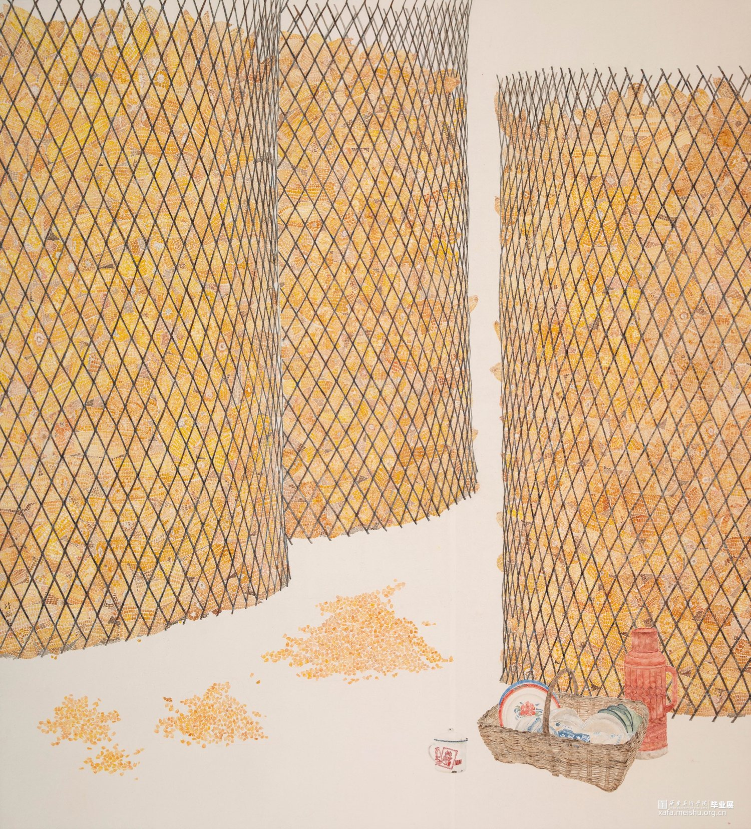 春安夏泰,秋稔冬祥。寒假期间在家乡陕西榆林岔河子乡灯笼滩村收集毕业创作素材,当地多喂养猪,羊,因此农作物以玉米为主,春种夏耕,秋收冬藏,玉米杆叶喂了猪和羊,玉米则囤起来等到来年春天卖出,辛劳了一年的农民收获了丰收的喜悦,一个个玉米垛立在旷野上,在阳光的照射下闪着金色的光。