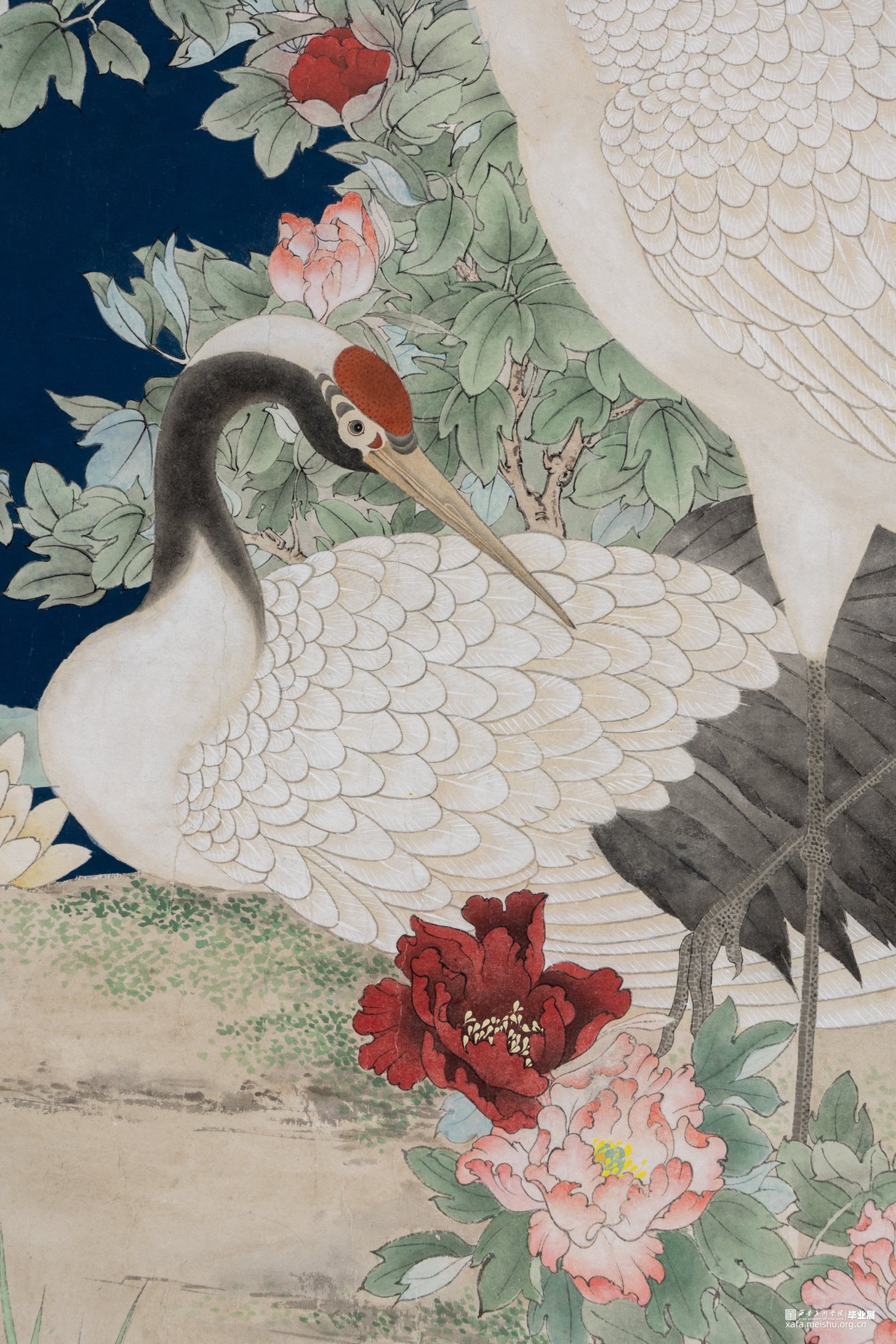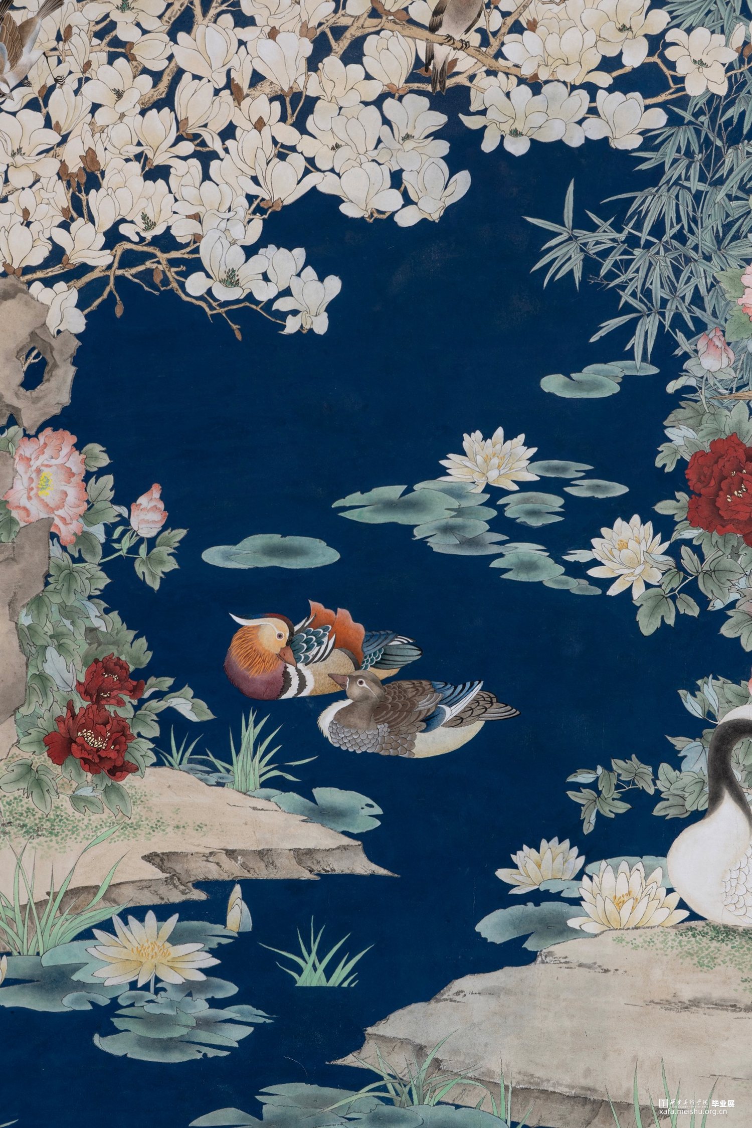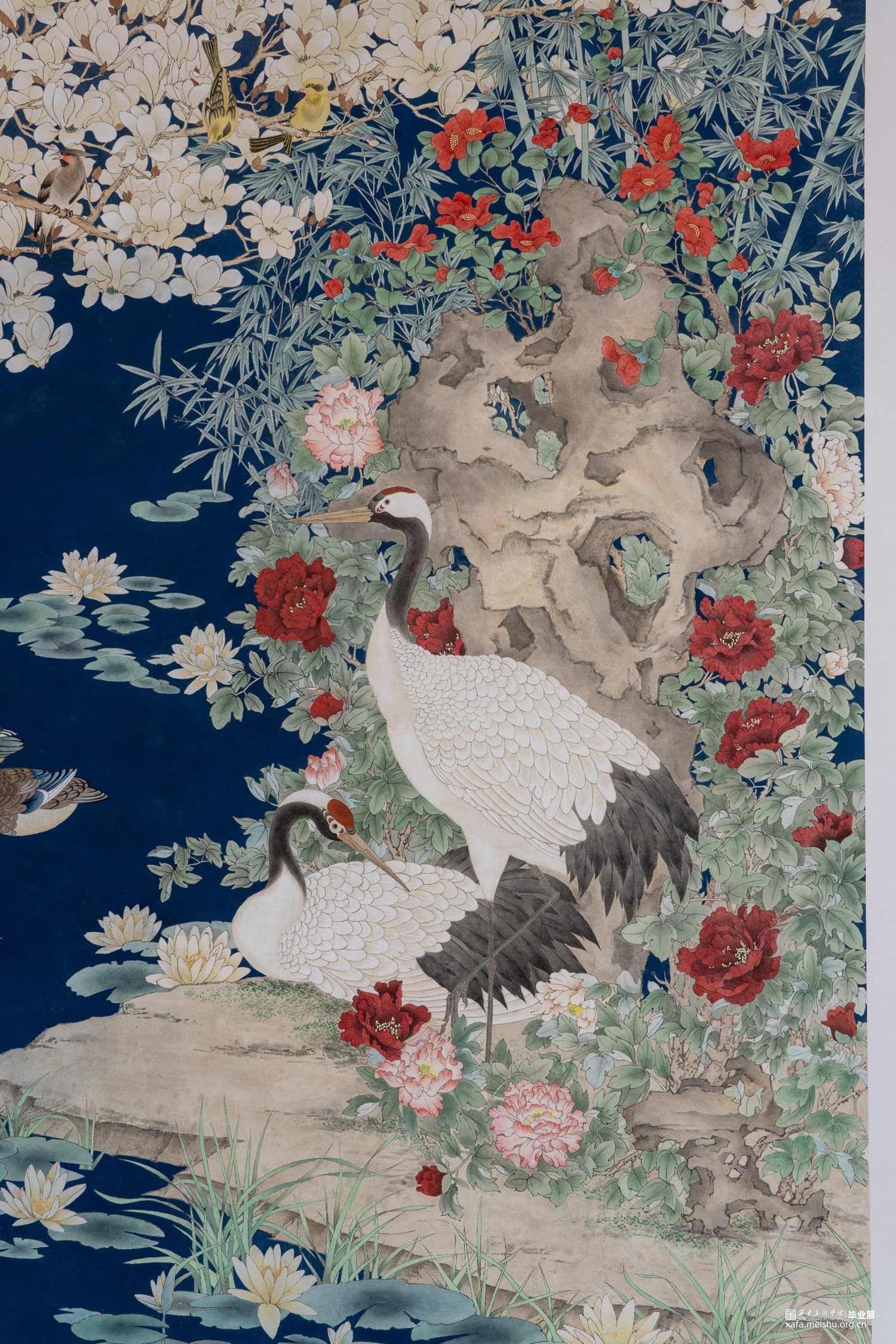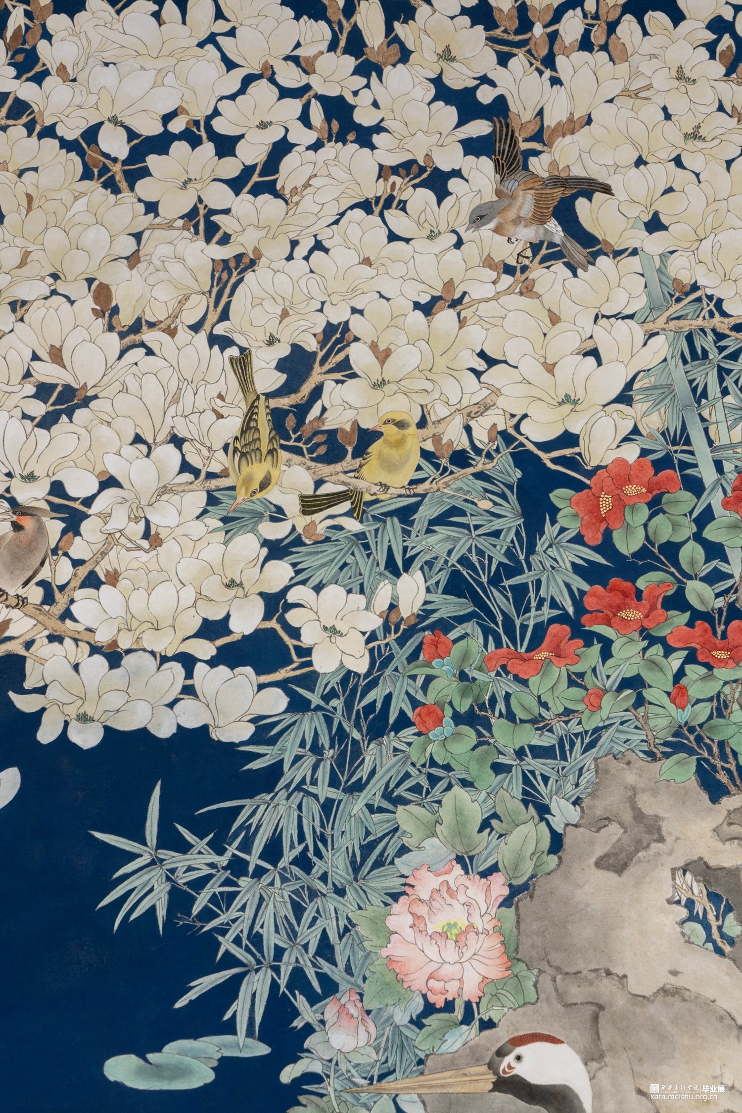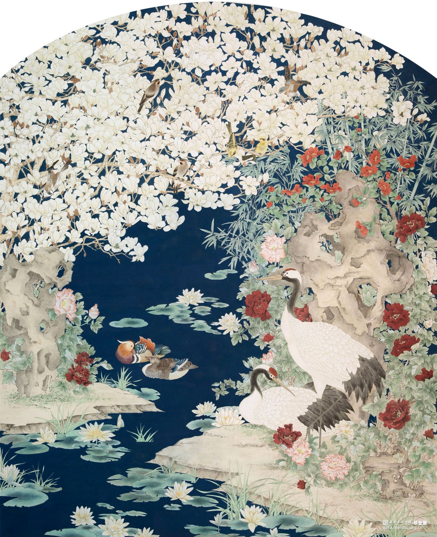 作品借鉴传统“铺殿画”的表现形式,描绘了一幅繁花似锦的盛世景象。于精微处诠释了花鸟画的内在精神,表现了自然造化的生机与天趣。同时,借由玉兰、牡丹、青竹,鸳鸯、仙鹤等物象的美好寓意,表达了对盛世中国的美好祝愿。