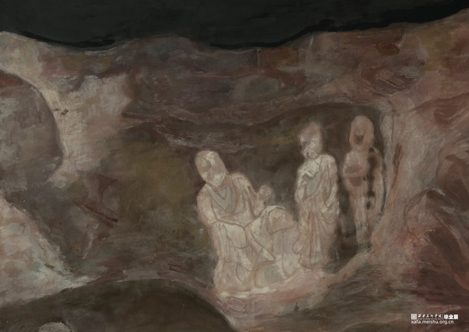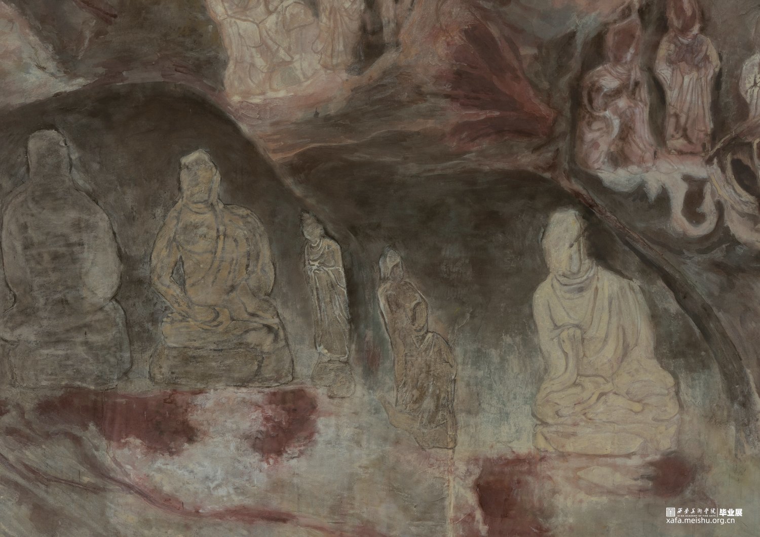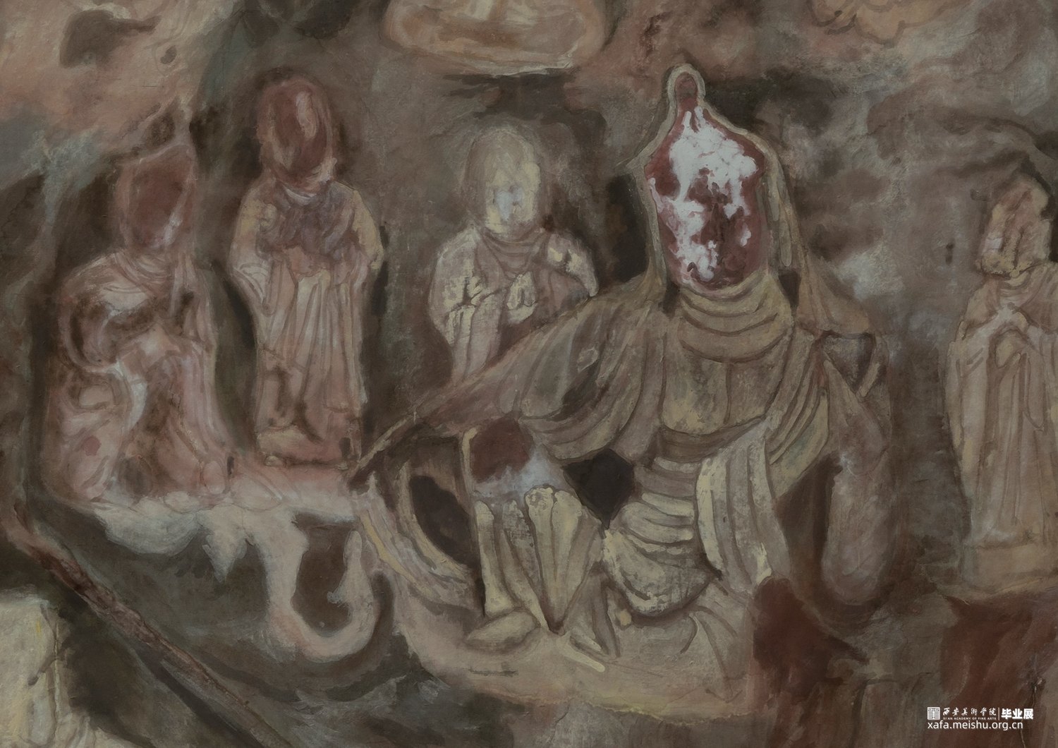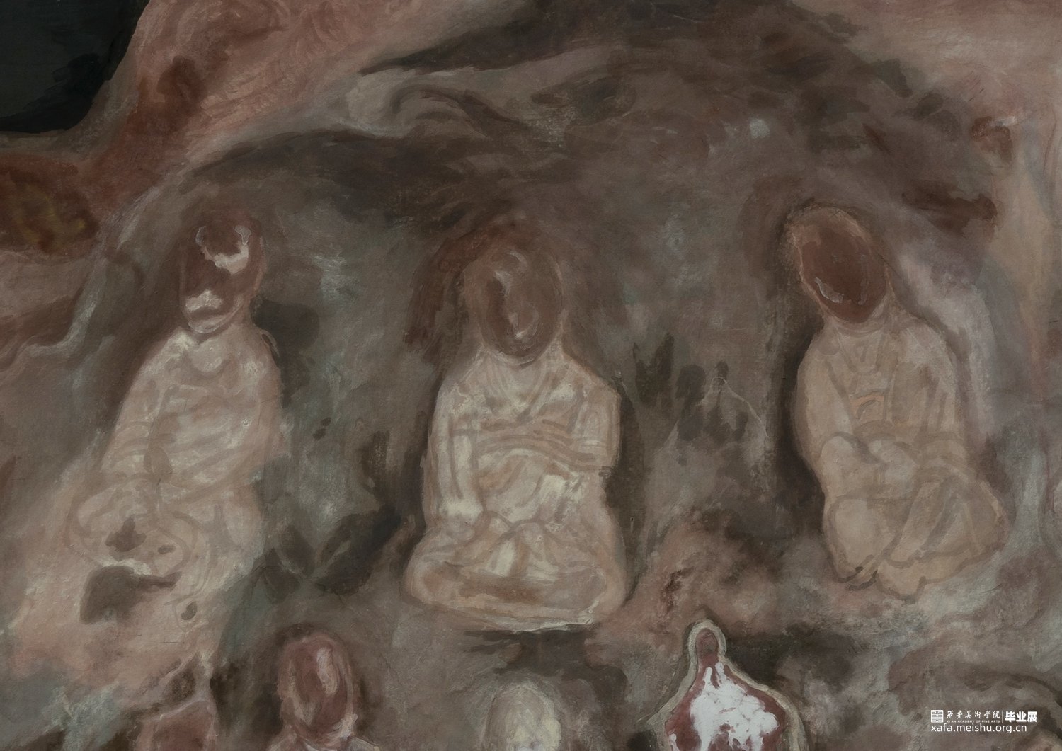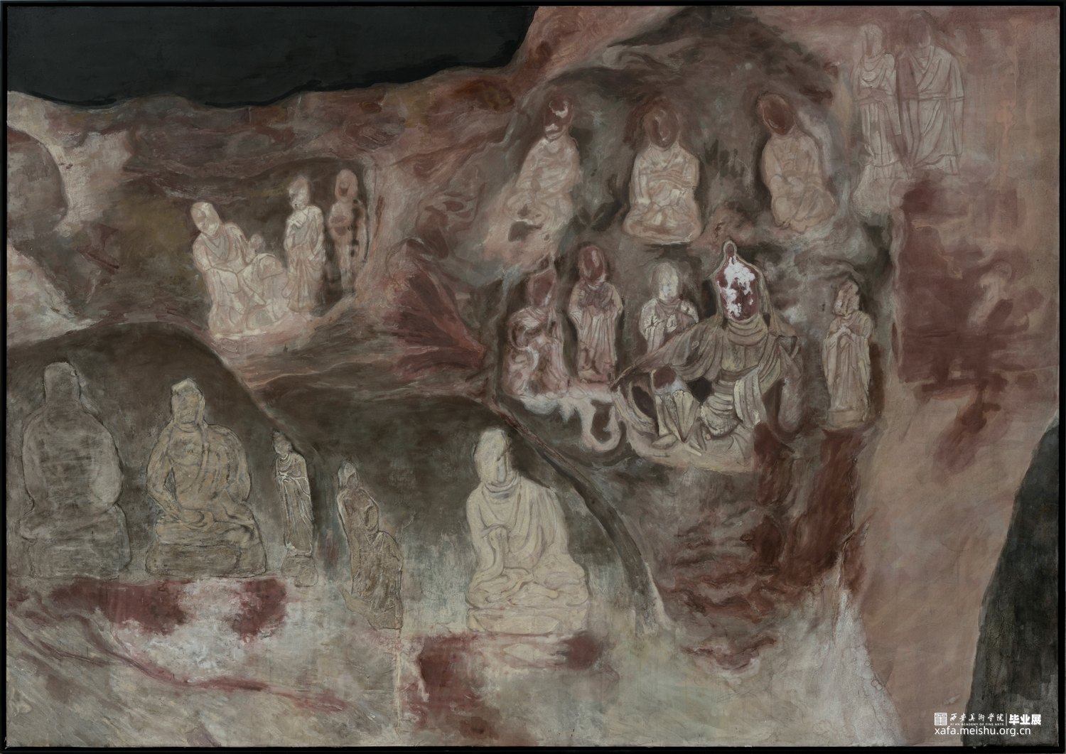 写生时站在那些已默默存在千年,看着那些人为破坏和自然侵蚀的伤痕,就想做点什么,所以选了普通无名的存于荒郊野外远离闹市的石窟群,想让更多的人能站在前面感受下历史沉淀,我的作品加上观看的你我的背影才是整幅作品的呈现。