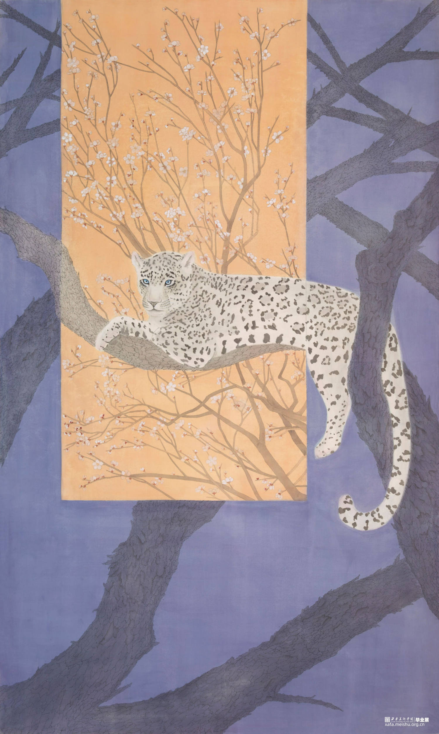 艺术创作源泉不仅仅是现实生活中的事物,也可以是存在脑海所想象之中的事物。存在于我们丰富的精神世界里,超越了自然生活的表象,走向了复杂深邃、多维立体的精神空间——作品《豹之境》的创作构思灵感来源于我对动物顽强生命力的崇拜与敬畏,对于豹子在严峻的自然环境中还能存活的欣赏与敬佩。在构图上采用了空间想象与画面拼接的主观性构思。动物的原始生命力与大自然的力量生生不息,同栖共生。我的创作选择了对在自然中敏捷矫健,速度飞,外形有美感的雪豹,和一身傲骨的梅花,苍劲的树枝作为绘画题材。蓝紫色的幽深丛林象征着动物严峻残酷的生