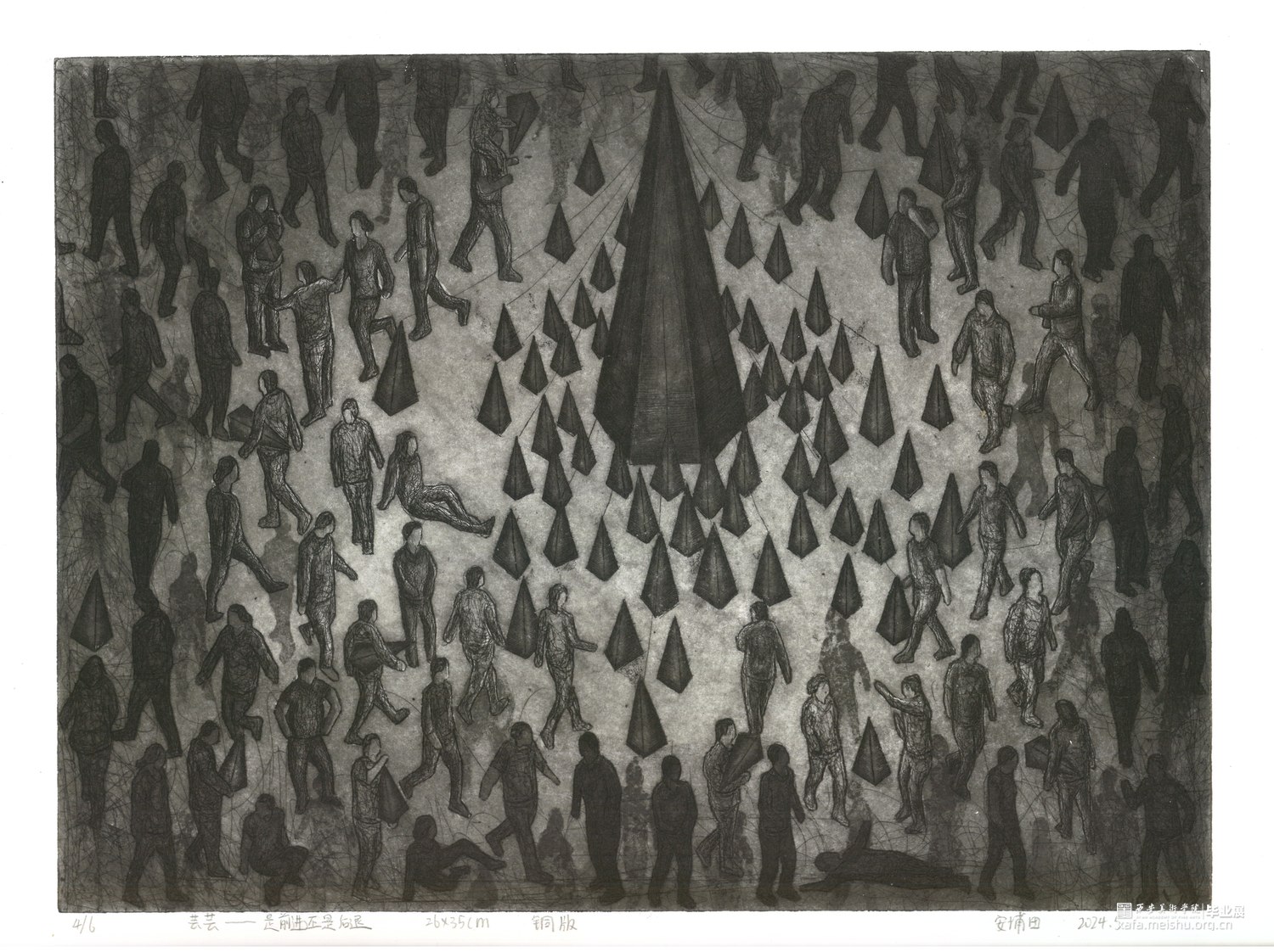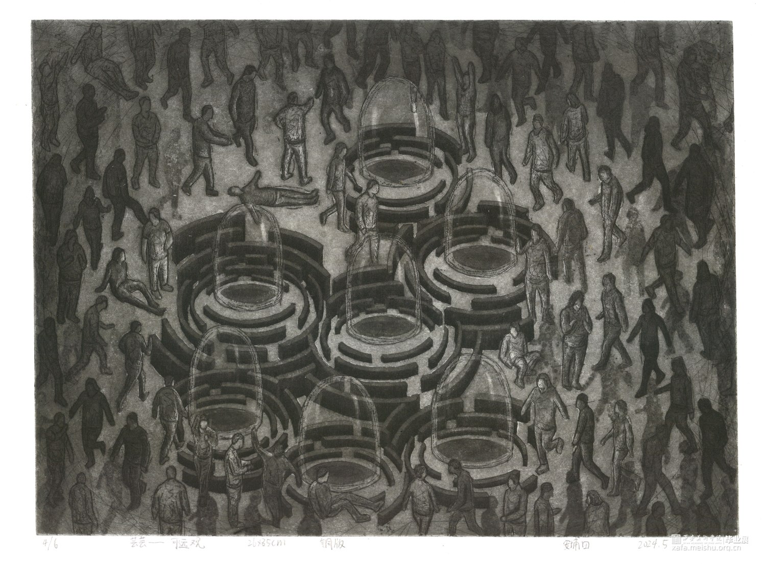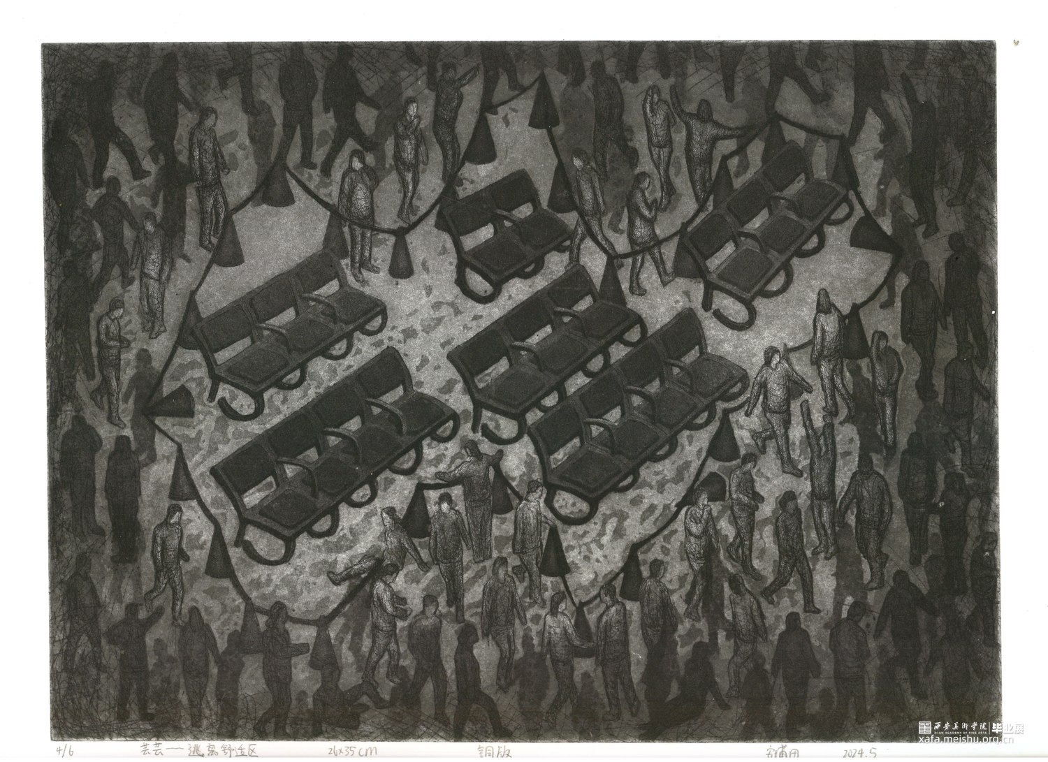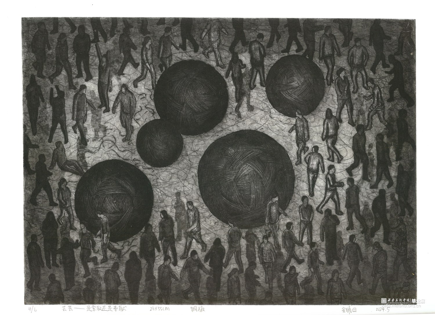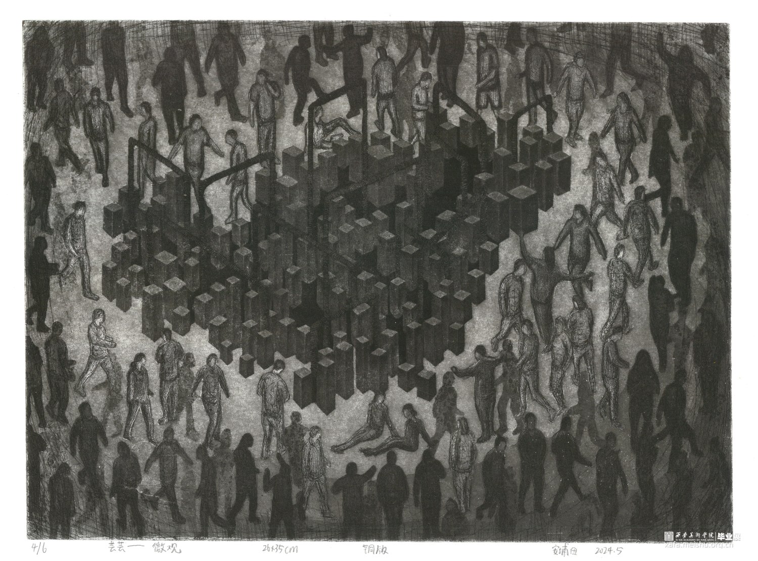 这一系列作品我命名为《芸芸系列》,选取了一些简单物像与抽象几何体来进行分解重构,让这些物体与人群之间产生联系,画面中主要以人群、一些日常物品与几何图形进行组合建立联系。在小尺幅作品中,通过人物与凳子、线团、几何体、棉花等等这些物品进行组合,以脱离事实的组合方式组织画面,用来表现内心莫名情绪的突然出现与消失,也试图探究人这一奇怪群体背后的真正逻辑,试图理解人的复杂性,多变性,以及人对周围的影响。