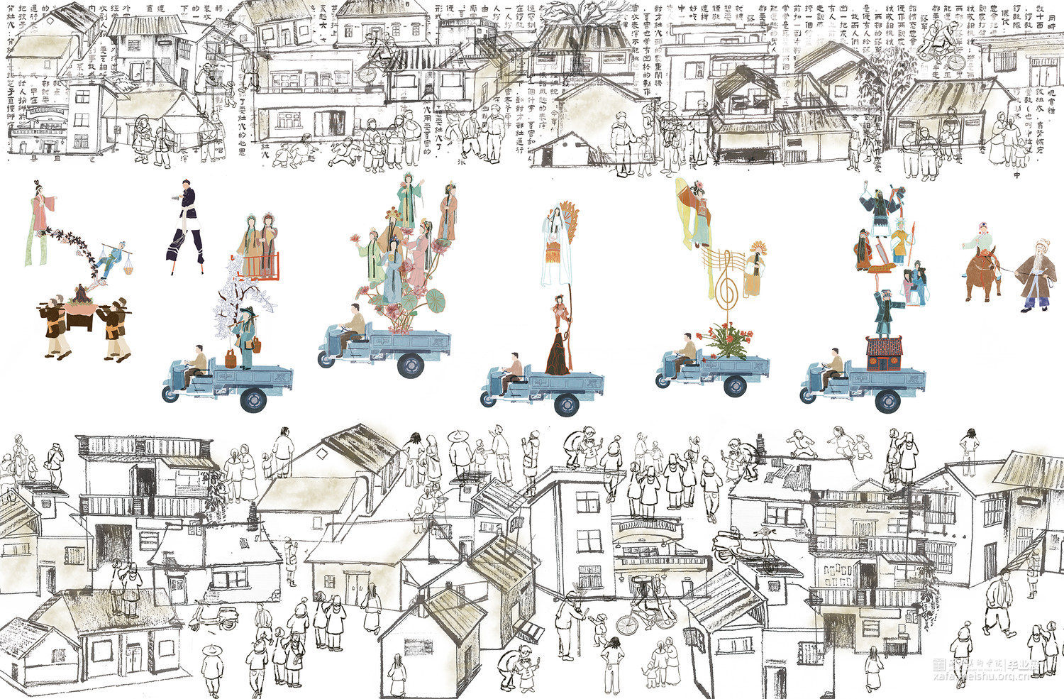 户县社火的历史发展十分悠久,几乎贯穿了整个中国古代的各个时期。但现如今户县社火的知名度并不高,很多年轻人并不了解户县社火中都有些什么,也不能到现场身临其境的现场观看。本人在相关调研资料准备前提下,以丝网印刷技法作为陕西户县社火情景重现的方式。本文根据对陕西户县社火的探索,从陕西户县社火的程序流程入手,结合图像信息的研究使更多的人了解到该非物质文化遗产从而达到一定的宣传、科普、保护和传承的作用。