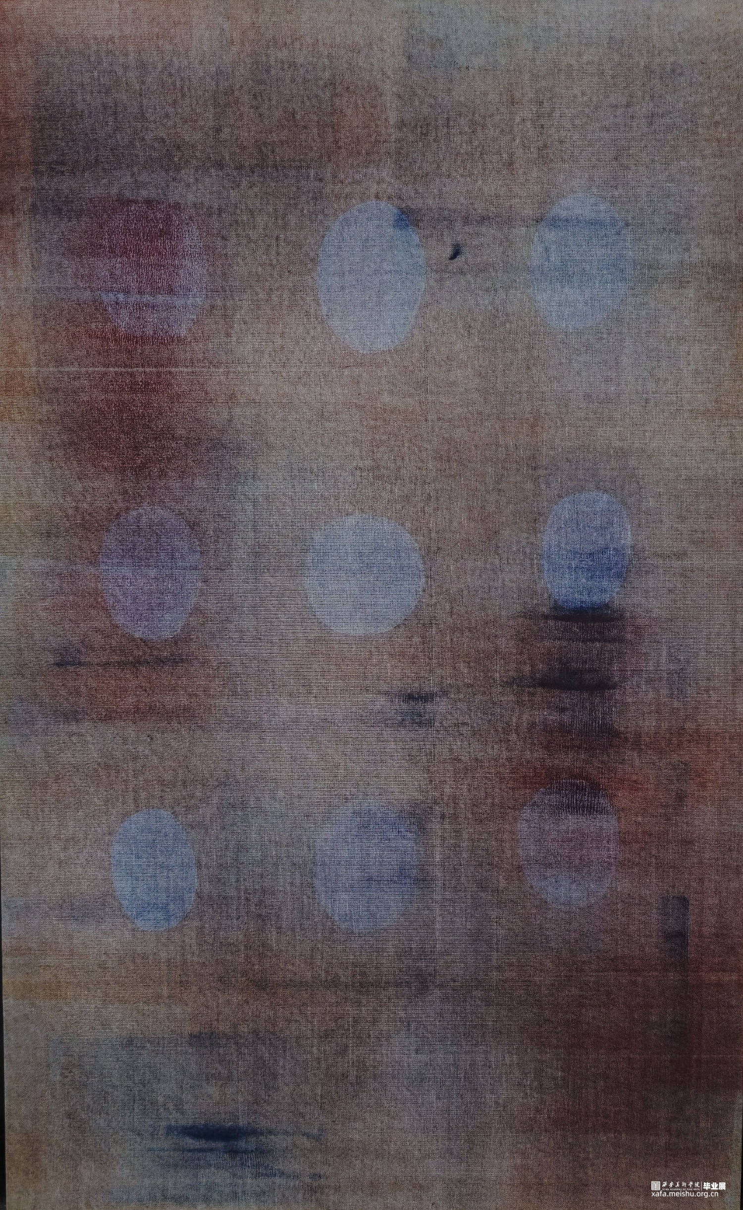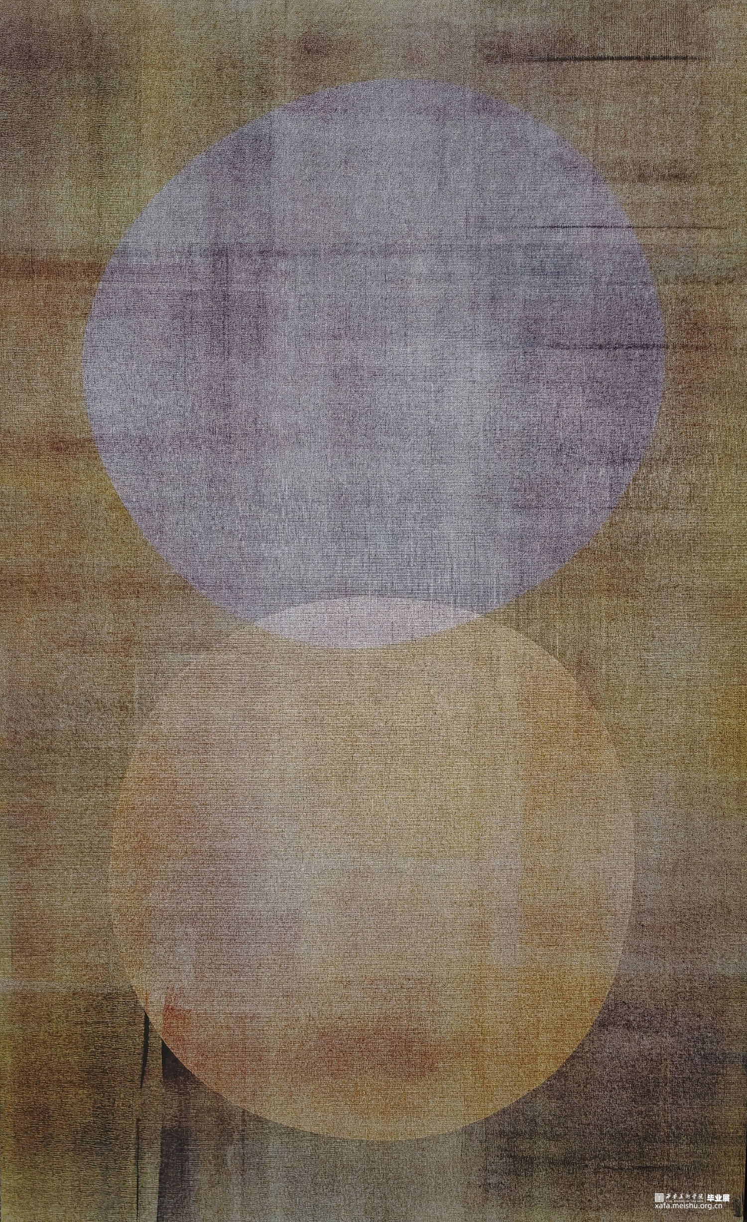 作品采用布面综合材料叠印,以各种不规则的圆形排列组合或者叠加形成三联画,主要通过使用大量均匀的彩色点阵列,悄悄地将一个颜色流到另一个颜色阵列中。每一种颜色,或者说是色点的无形组合,都表达了源自某些原型---梦或神话中出现的一种天生的心理结构,当观众凝视着这些排列时,沉浸在周围空间中的一种半冥想的溶解状态中,仿佛被转移到了梦境或神话的空间中。对每种颜色的感知都是一种错觉……我们看不到颜色的本来面目。在我们的感知中,颜色会相互改变。