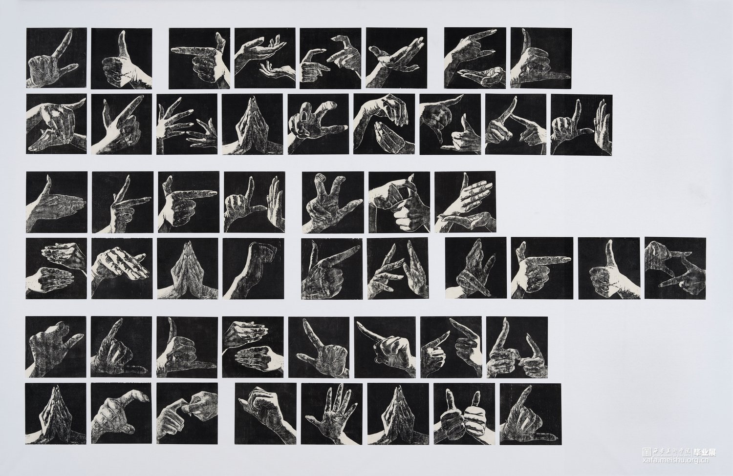 这件作品选取基础入门的手语教学“你好,很高兴认识你”这句话作为主要创作素材来进行延伸。因为听障人群是通过肢体动作把自己脑中的画面描绘出来,他们比手语的逻辑和通常的语言逻辑稍有出入,很多时候并不遵循主谓宾的语序,所以把他们比出的意思想象成一副画面比组成一句话更有助于理解。我将写好的文字转换为手语相对应的动作,逐帧分解,最后再加以排列,最终呈现这幅作品的效果。