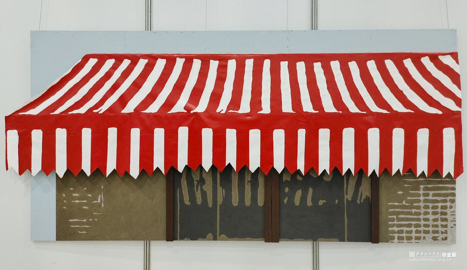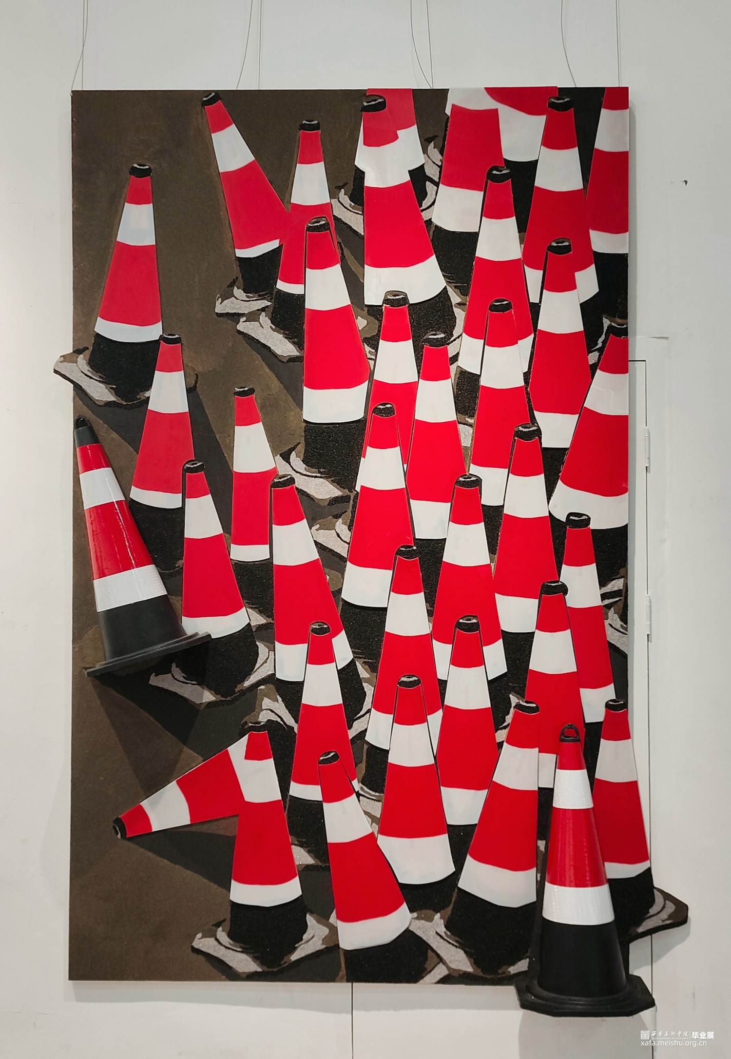 该作品名叫《红白印象》,灵感来源于小时候,存在于记忆深处中的红白色事物并结合现实生活中出现日常的物品进行创作。第一张作品以红白色的安全隔离锥为主题,构图采用从右下角向左边逐渐递减的形式。材料选用了丝网版画和综合材料拼贴结合的方式,使简单的数字图像,更加具有层次感。画面以大面积的红白色为主要颜色,并用黑灰色加以调和,色彩对比强烈,给人以强烈的视觉冲击,从而表达出红白色强烈对比下所具有的警示作用。第二张作品以红白色的遮雨棚为主题,构图采用大面积的色块分割方式,以红白色为主要颜色,并用低饱和度的颜色加以调和,色彩对比丰富,给人以强烈的视觉印象,使人回忆起曾经在有红白色遮雨棚的地方,吃到的好吃的,遇见的有趣的人,所发生的美好的故事,从而引起甜蜜的回忆。该作品所想表达的是在红白色强烈的视觉对比下,出现在不同的事物上所赋予的意义也不一样,除了出现在能带给人甜蜜的地方,也会给人以警示警醒的作用。