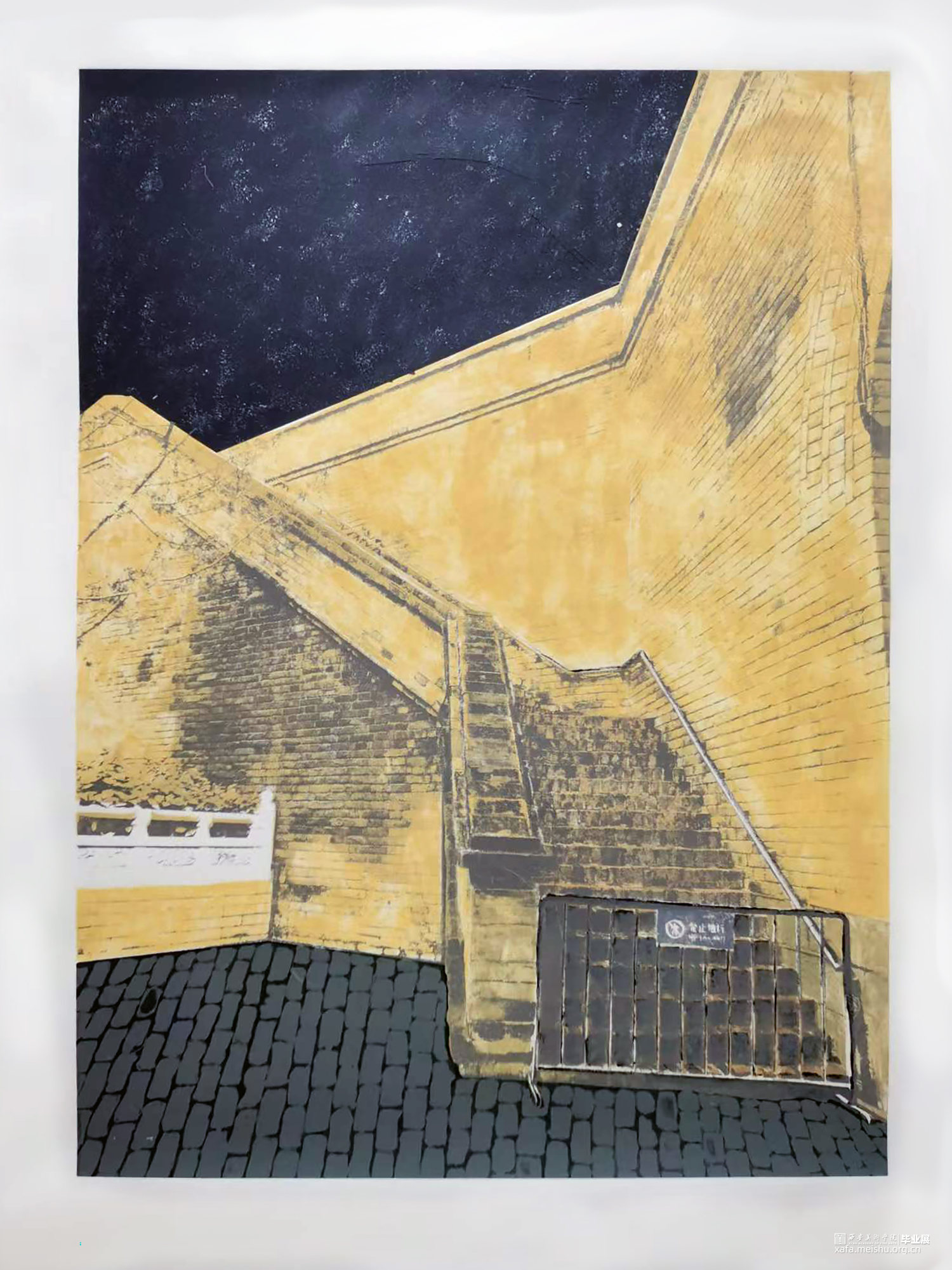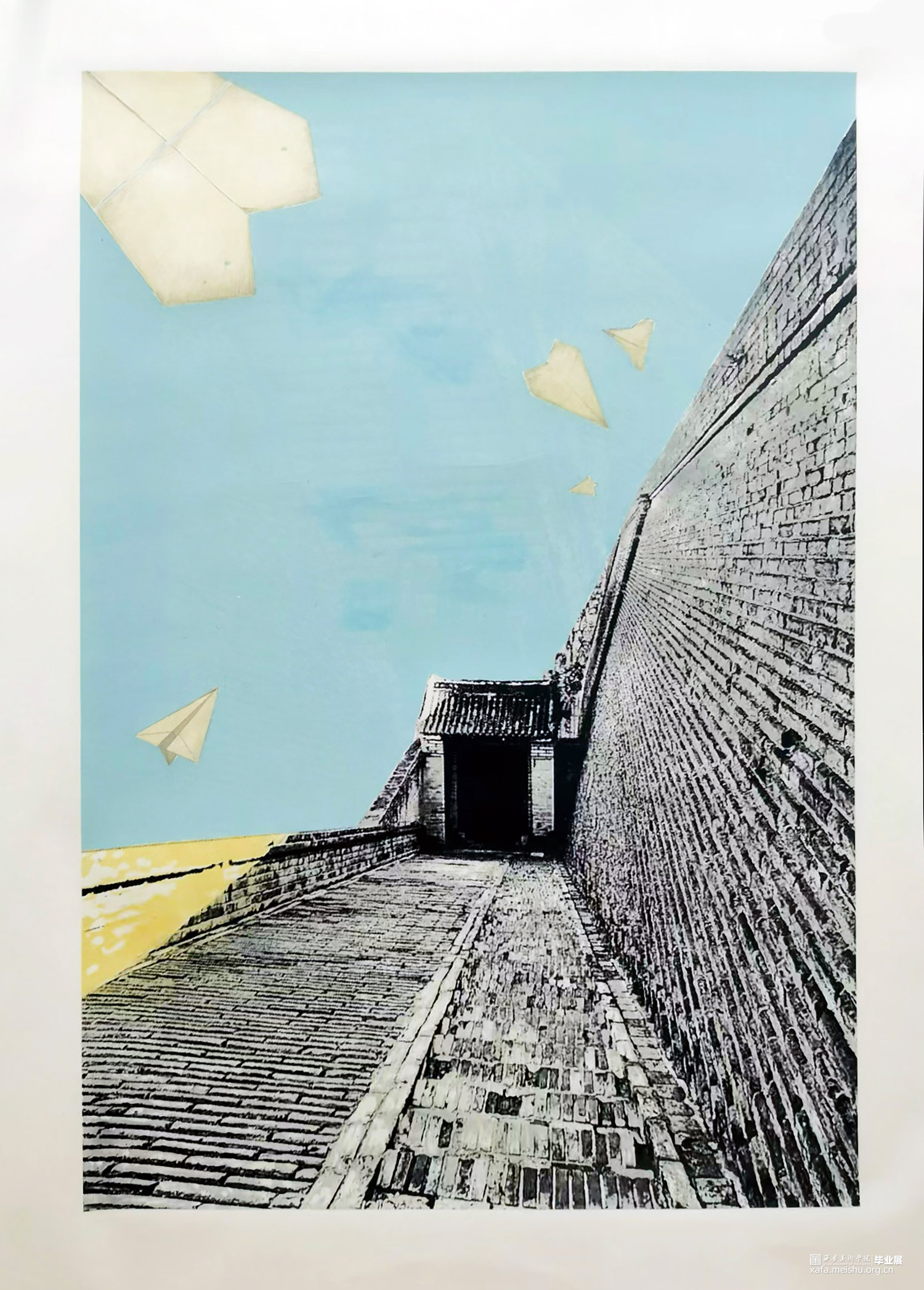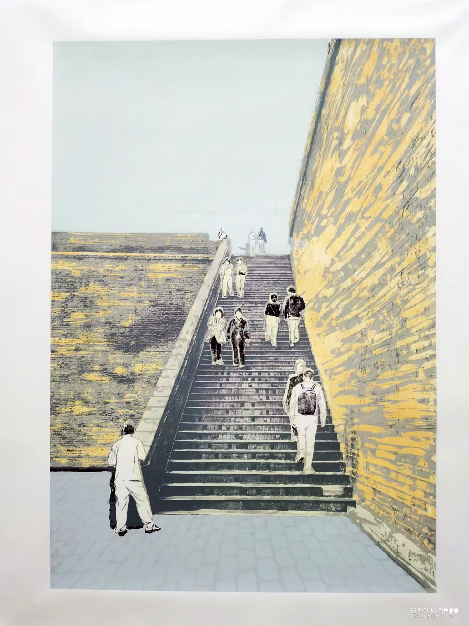 《观城》运用凸漏版两种版种进行制作,重点讨论版画技法中凸版与漏版的结合应用,以丝网和木刻技法为实践方式进行创作、以凸漏结合的方式表现画面,突出作品主题。城墙作为历史痕迹的一部分,它见证了西安的古往今来.《观城》立足于当下,展现出当今时代人们对过去的回顾和对未来的展望。