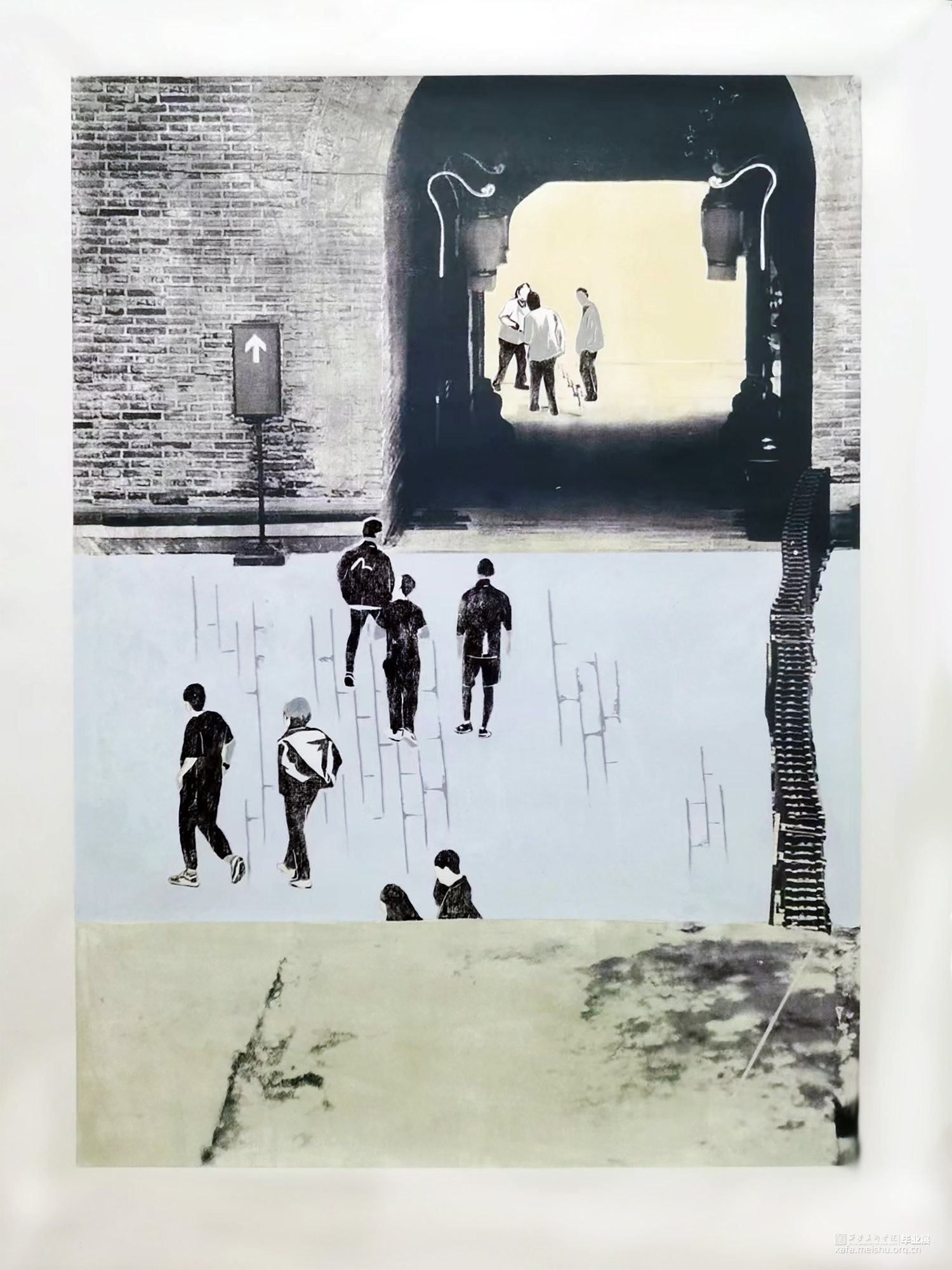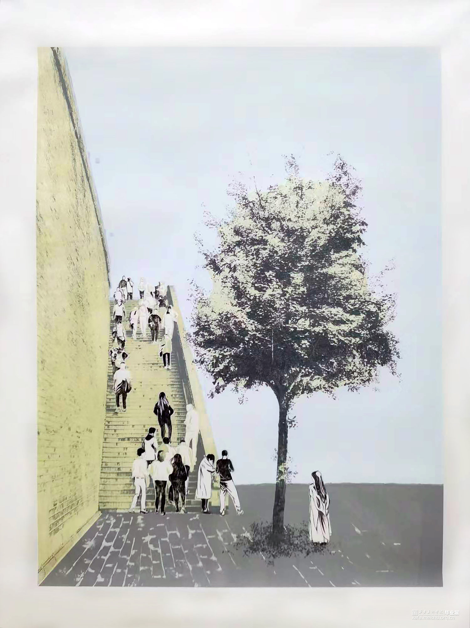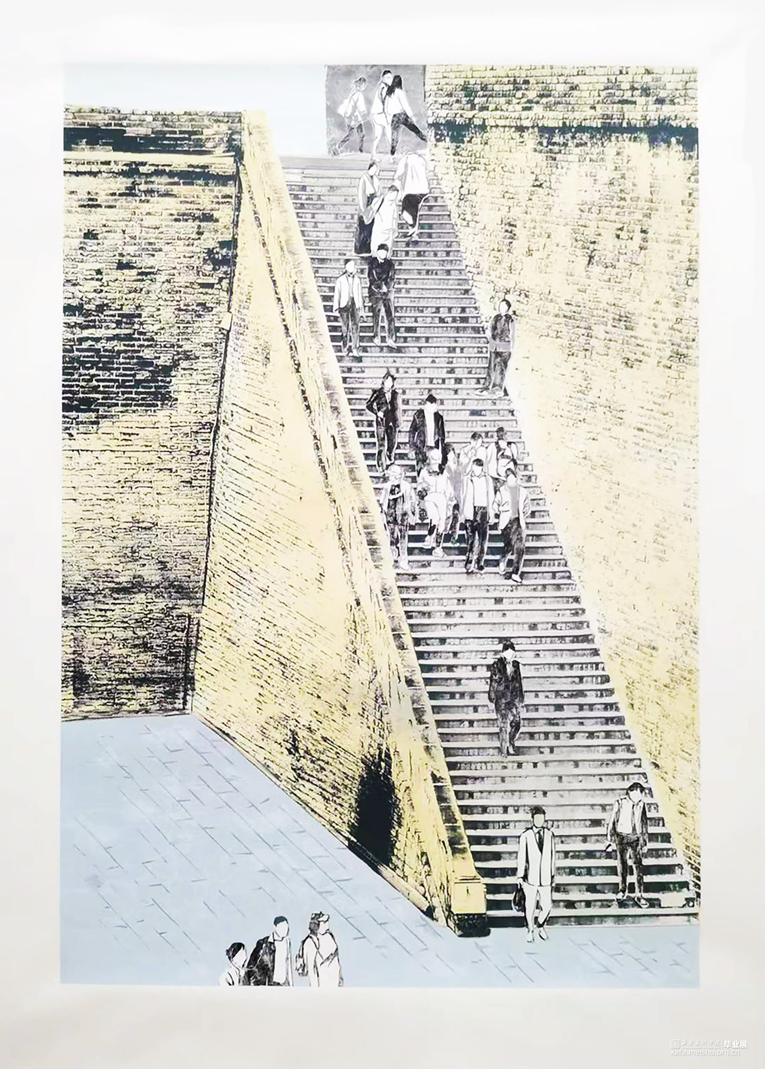 《观城》运用凸漏版两种版种进行制作,重点讨论版画技法中凸版与漏版的结合应用,以丝网和木刻技法为实践方式进行创作、以凸漏结合的方式表现画面,突出作品主题。城墙作为历史痕迹的一部分,它见证了西安的古往今来.《观城》立足于当下,展现出当今时代人们对过去的回顾和对未来的展望。