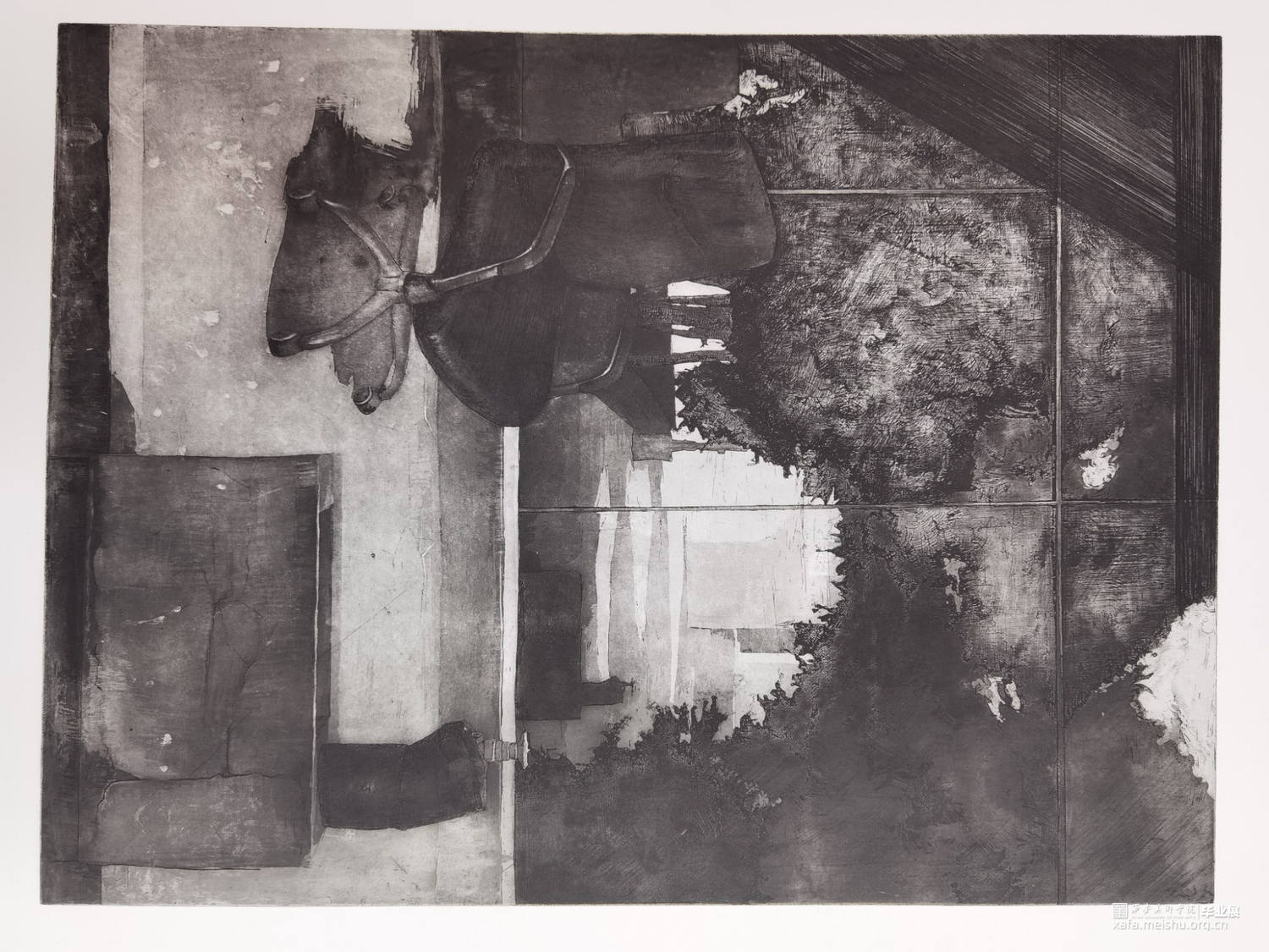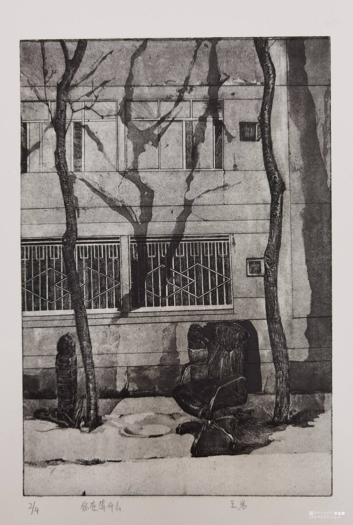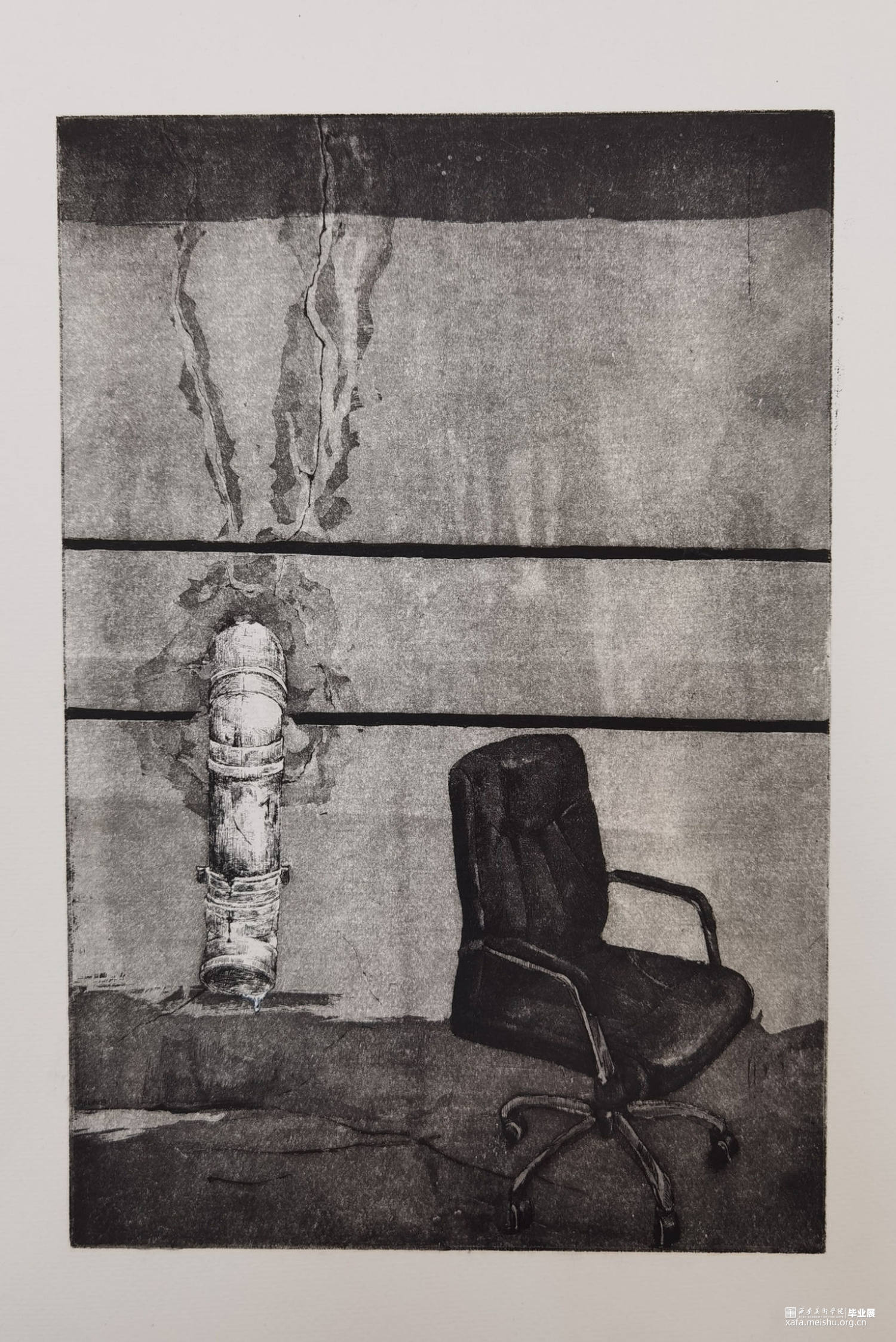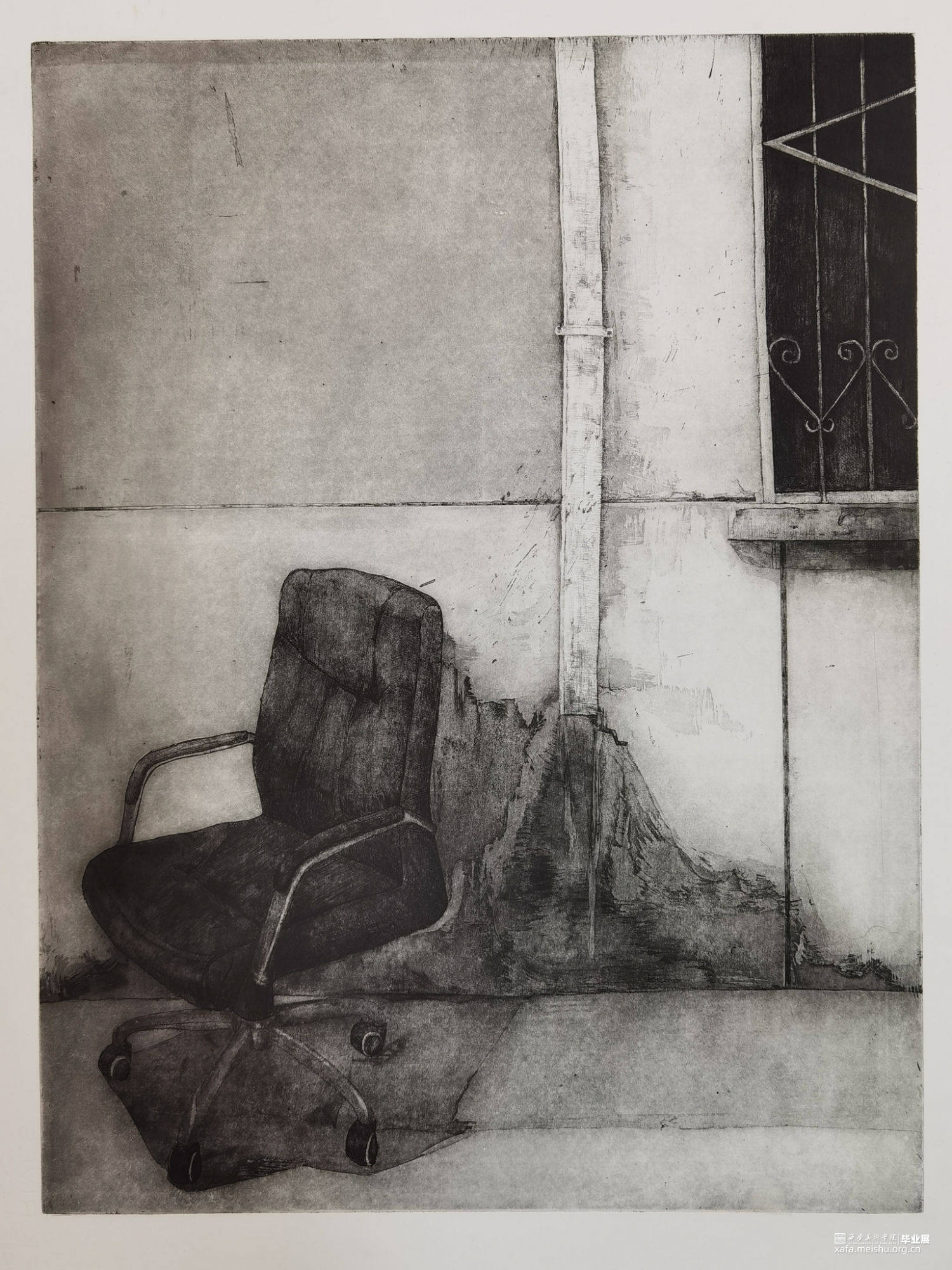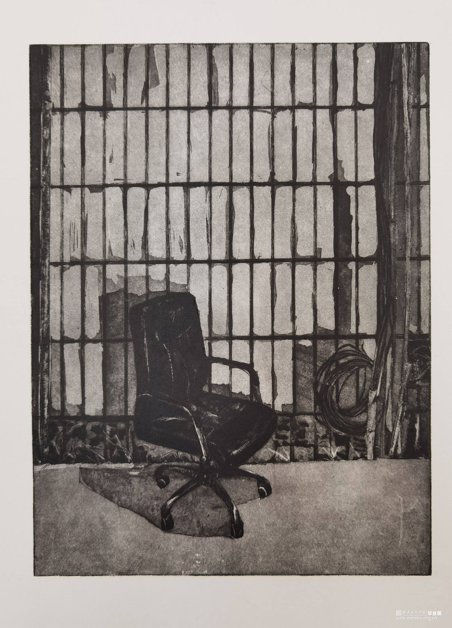 《你在等什么》系列铜版画作品 表现了一把椅子在不同时间,不同背景下的状态,椅子一直是处于前方但又不是重要的位置,主要采用线刻、干刻与飞尘技法,呈现出一种安静与杂乱相共存但又不该处于一个空间的矛盾性。