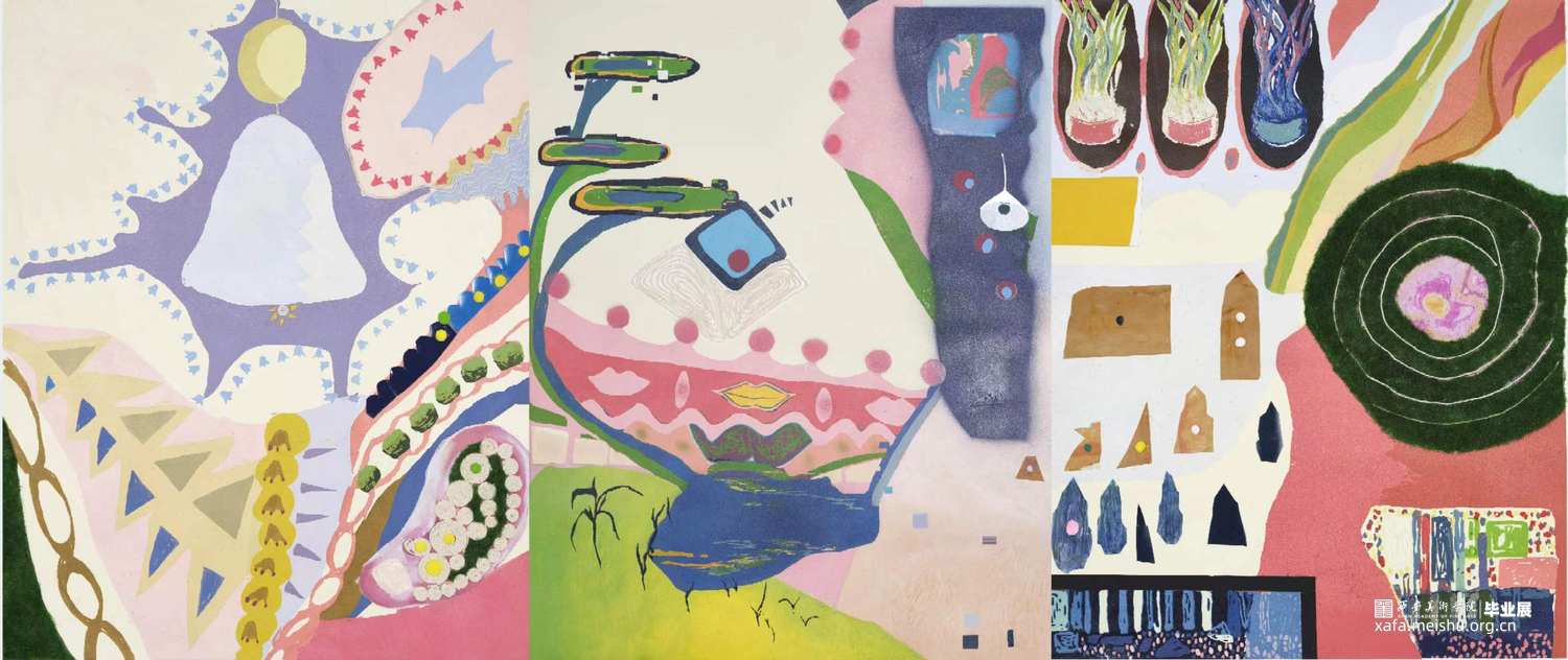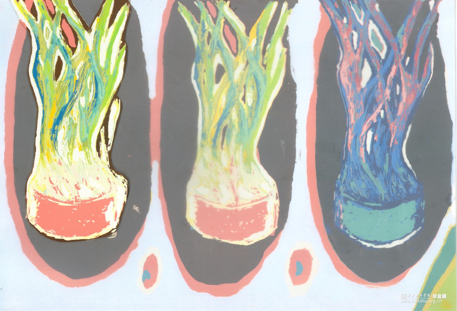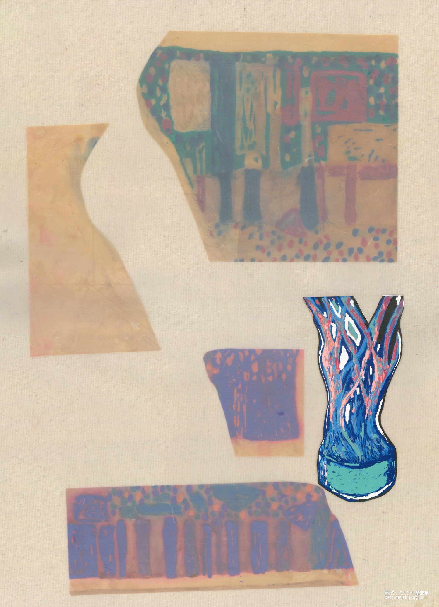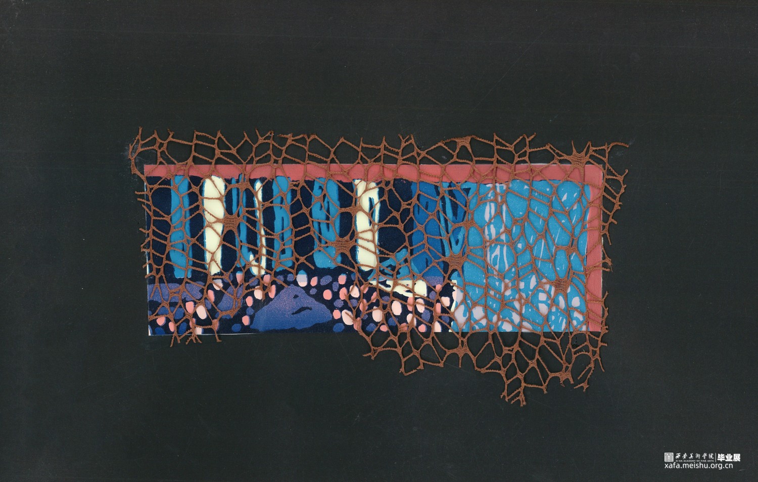 通过网上制版、不同材料堵网、手绘、菲林片叠加以及拼贴等方法,重点剖析使用不同的材料对丝网版画画面的影响,突显出每种材料都有其独特的性能和特点,并且在其影响下丝网版画画面会呈现出不同的效果,深入了解丝网版画的创作过程和技法,通过对不同材料和技法的探索和运用,创造出丰富多样的视觉效果和肌理语言,大大提升作品的艺术表现力和感染力,使作品更加具有观赏性和艺术性,画作试图在抽象的形式中表达现实世界的某种情感、状态或场景。通过非具象的线条、色彩和形状,展现现实世界的一些方面,如自然、社会等。画面不规则构图,打破传统的对称和平衡,以表达现实世界的多样性和不确定性。同时运用曲折、流畅的线条和形状,形成独特的图案和纹理,增强画面的动感和张力。画面主要以粉色和蓝色调为主,象征天空、海洋或宁静的思考而另一方面也象征着梦幻虚幻的另一个世界。同时,运用多种色彩进行对比和呼应,如红色、黄色或黑色和绿色,再通过综合材料的拼贴,以表达复杂多变的现实感受。