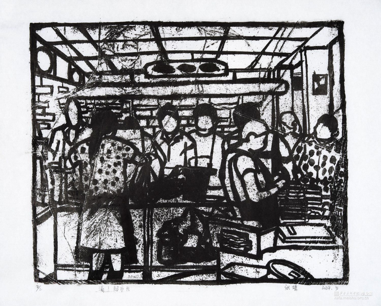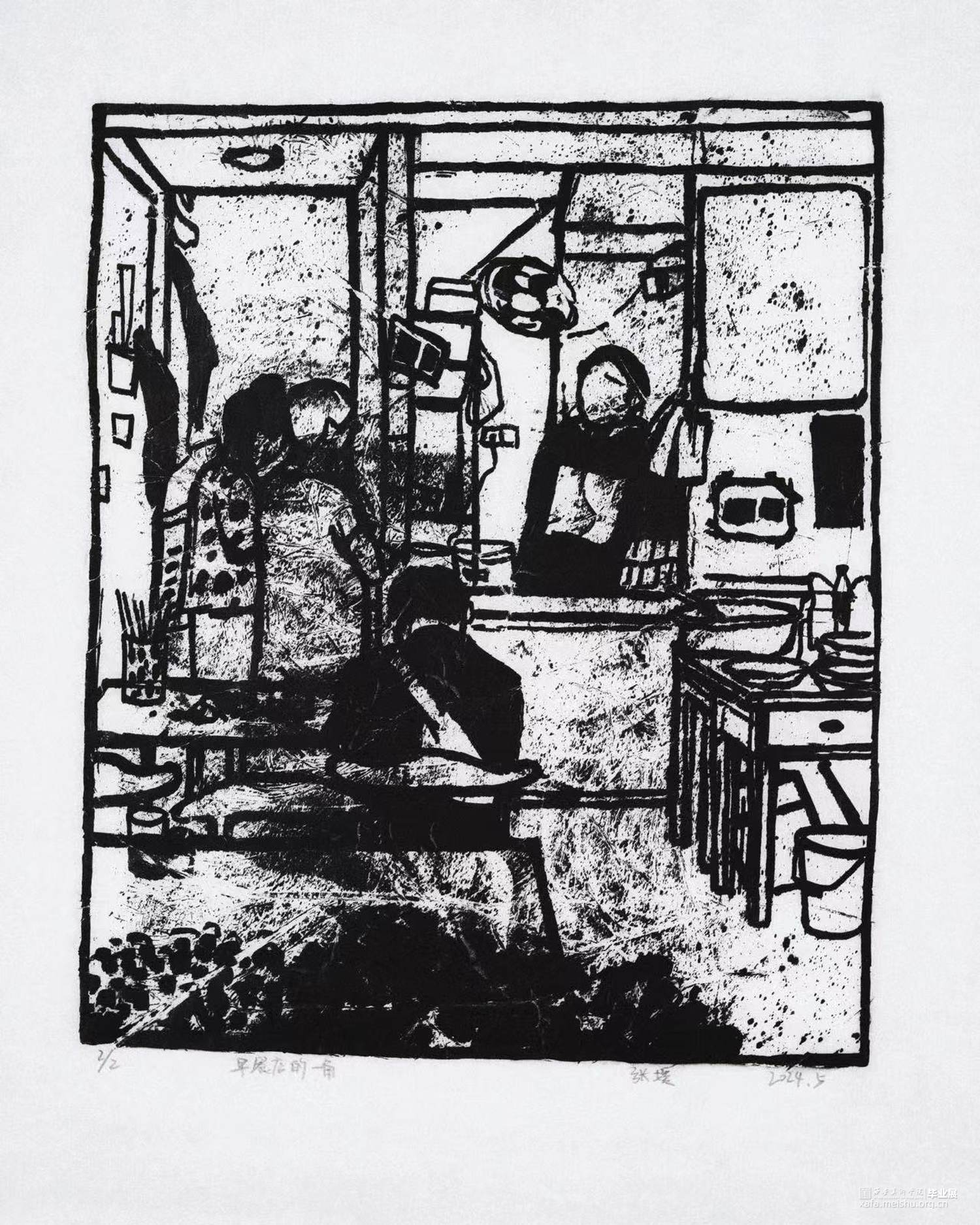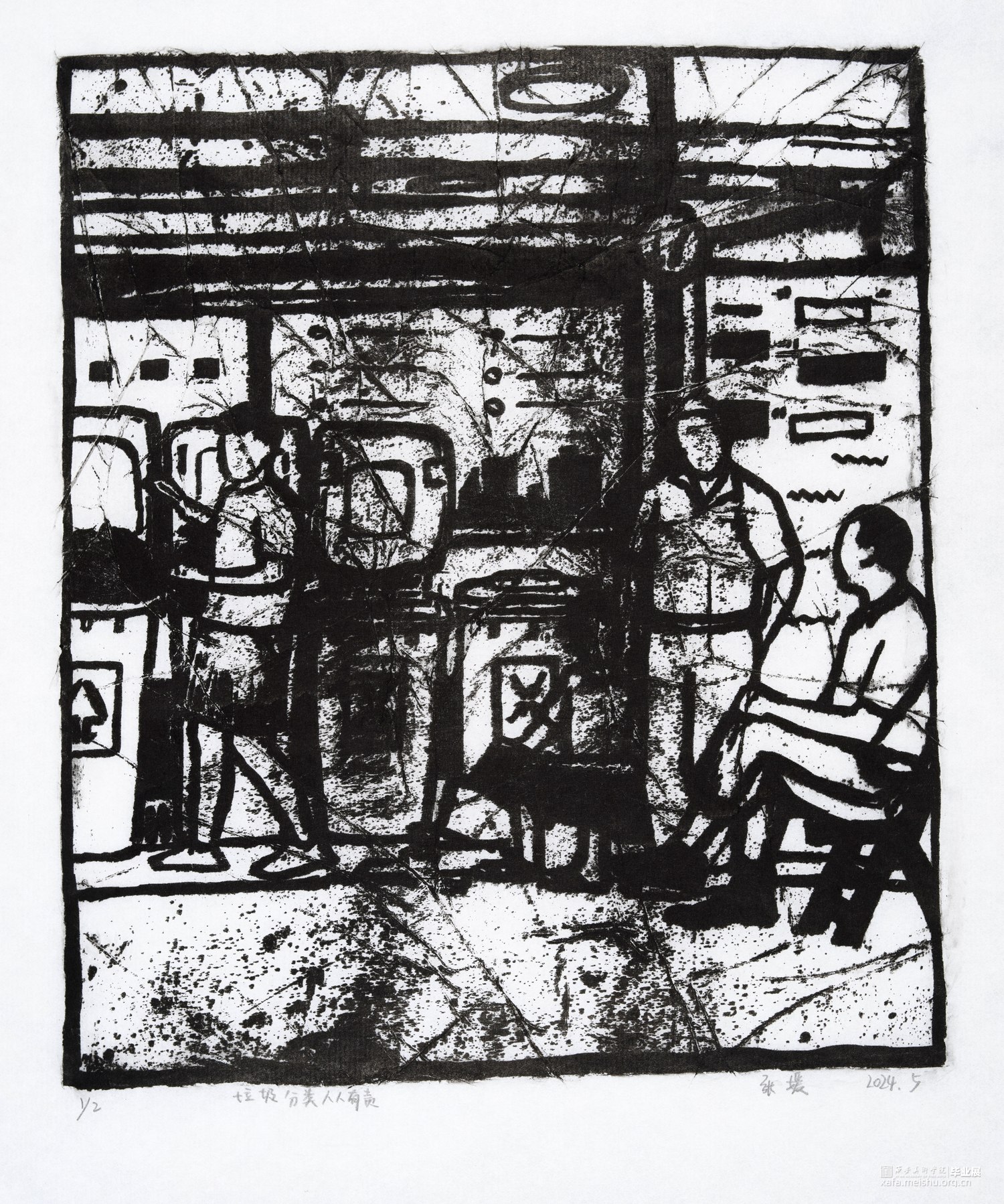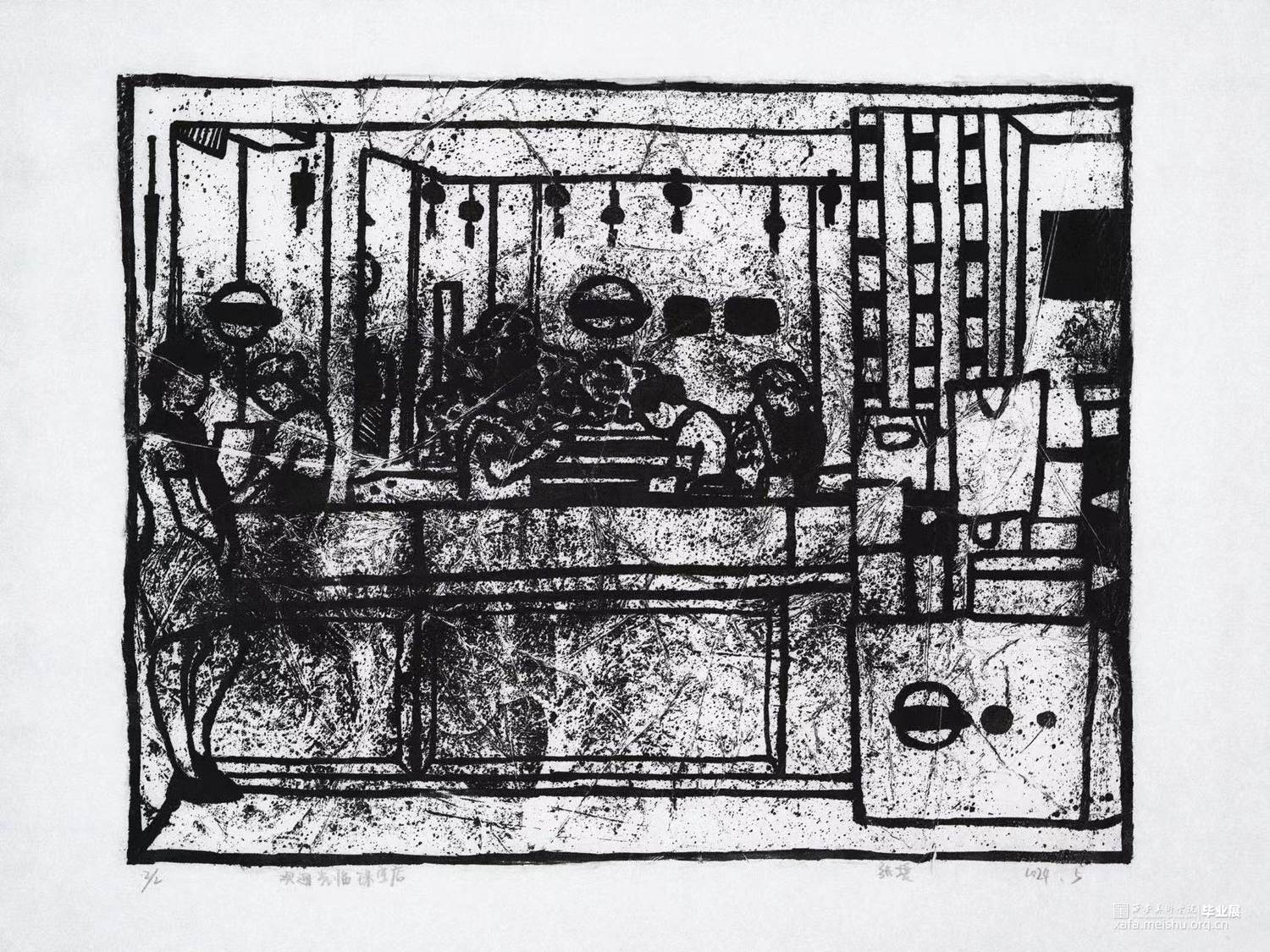 我从童年就生长在这里,这里的一切都非常的熟悉,幼儿园和杂货店除了翻新其他没有改变,一如即往的人们生活在我的周围,因为太过熟悉也常常忽略,于是为了记住这个从童年就存在的地方,我用画把他们记住。用一种特殊的绘画方式,把在人间的他们都生长在我的画里,在社会中寻找自我,我和他们一样存在于人间。我的大学环境同样让我喜爱,大学知识的积累和思想的洗礼对我个人的成长非常重要,所以我也把这些展现在画面中。总的来说,这套版画作品以我自身的成长环境为创作主线,通过细腻入微的肌理展现了很多的生活场景,生动地记录了在人间的人们。