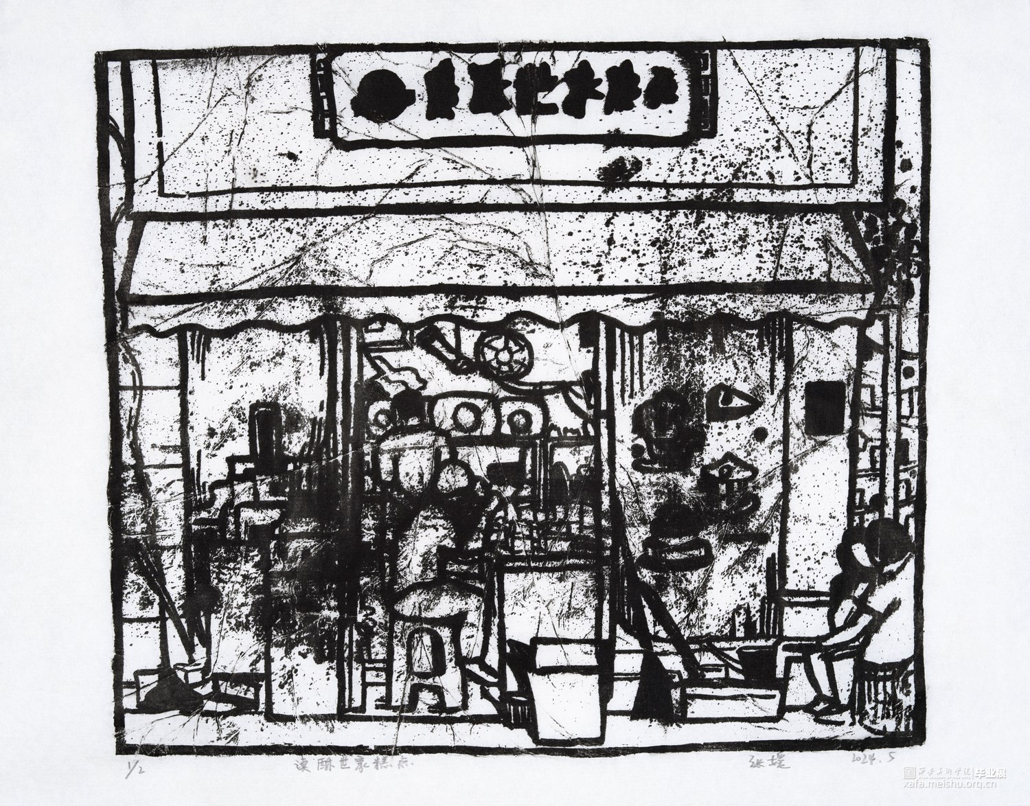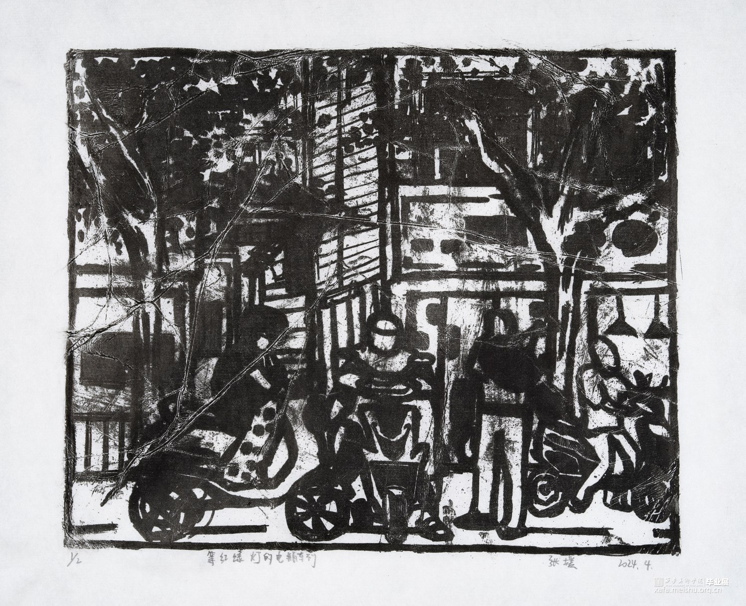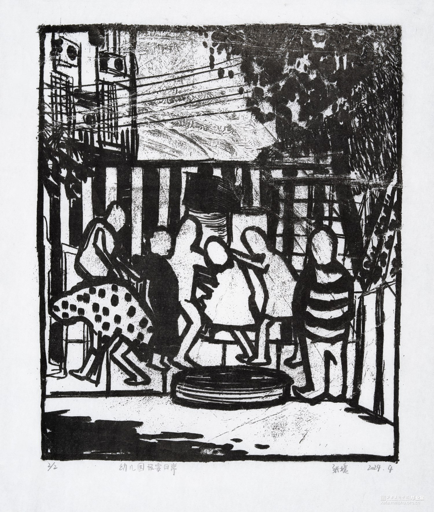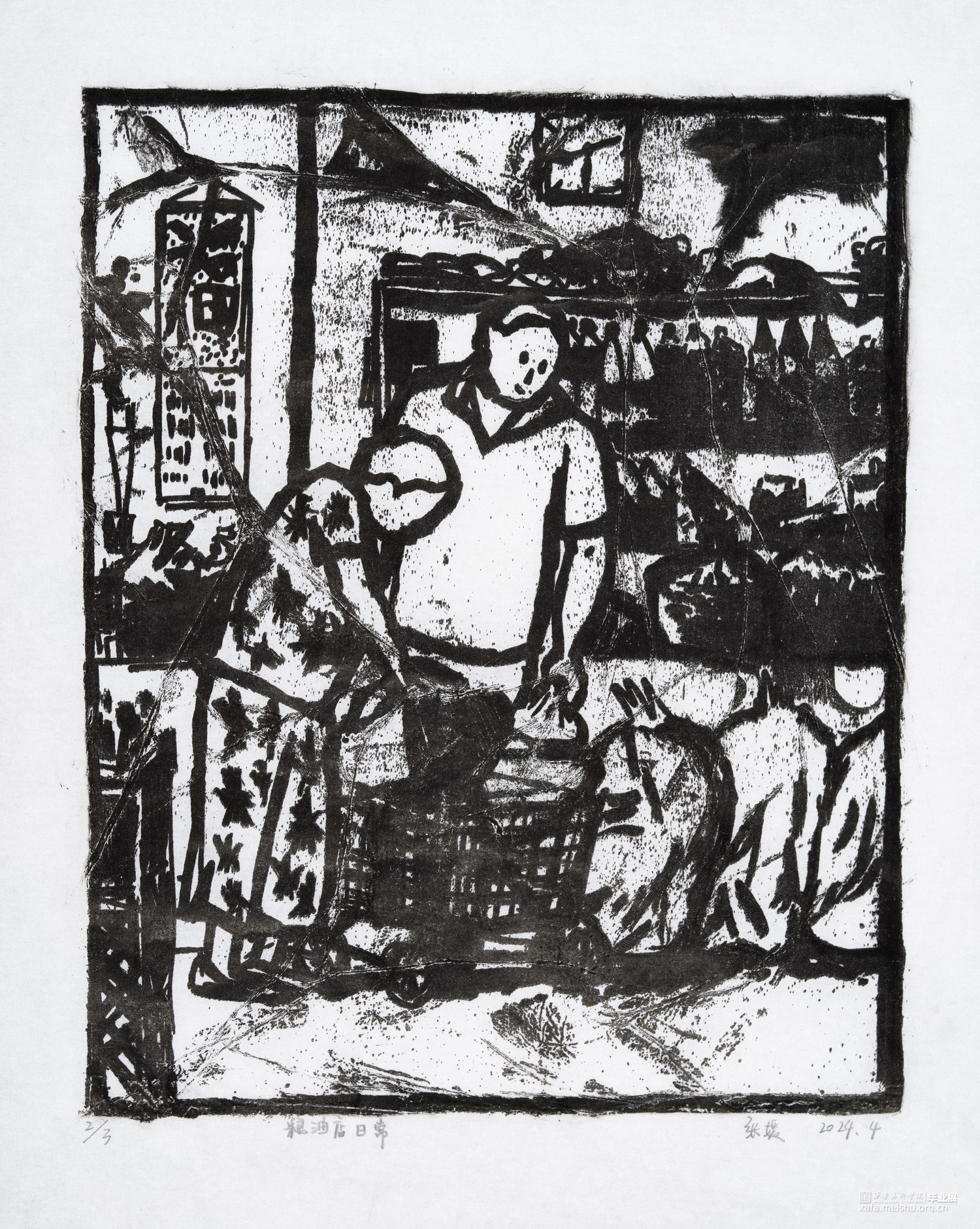 我从童年就生长在这里,这里的一切都非常的熟悉,幼儿园和杂货店除了翻新其他没有改变,一如即往的人们生活在我的周围,因为太过熟悉也常常忽略,于是为了记住这个从童年就存在的地方,我用画把他们记住。用一种特殊的绘画方式,把在人间的他们都生长在我的画里,在社会中寻找自我,我和他们一样存在于人间。我的大学环境同样让我喜爱,大学知识的积累和思想的洗礼对我个人的成长非常重要,所以我也把这些展现在画面中。总的来说,这套版画作品以我自身的成长环境为创作主线,通过细腻入微的肌理展现了很多的生活场景,生动地记录了在人间的人们。