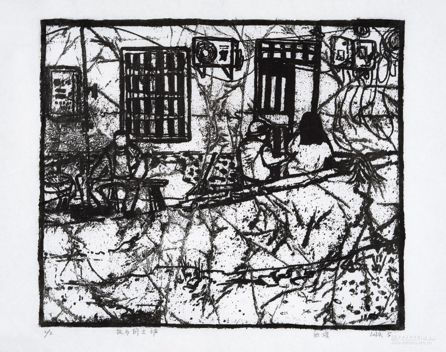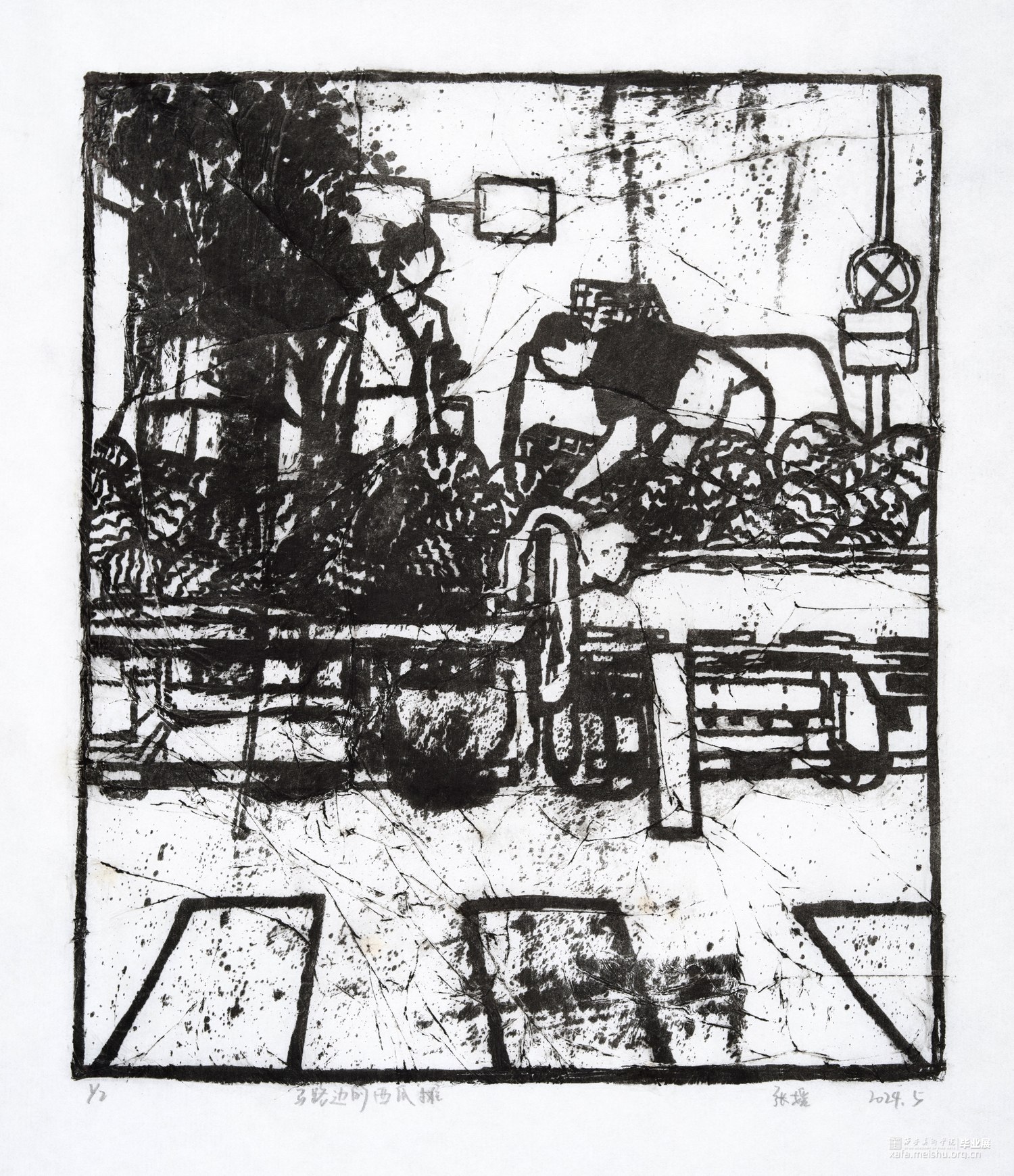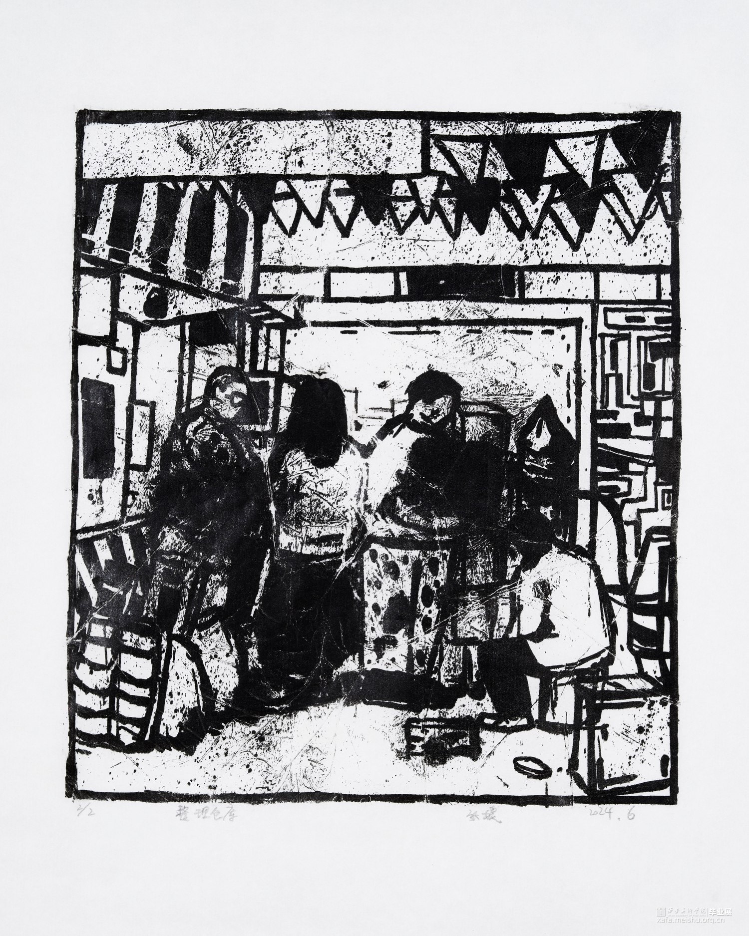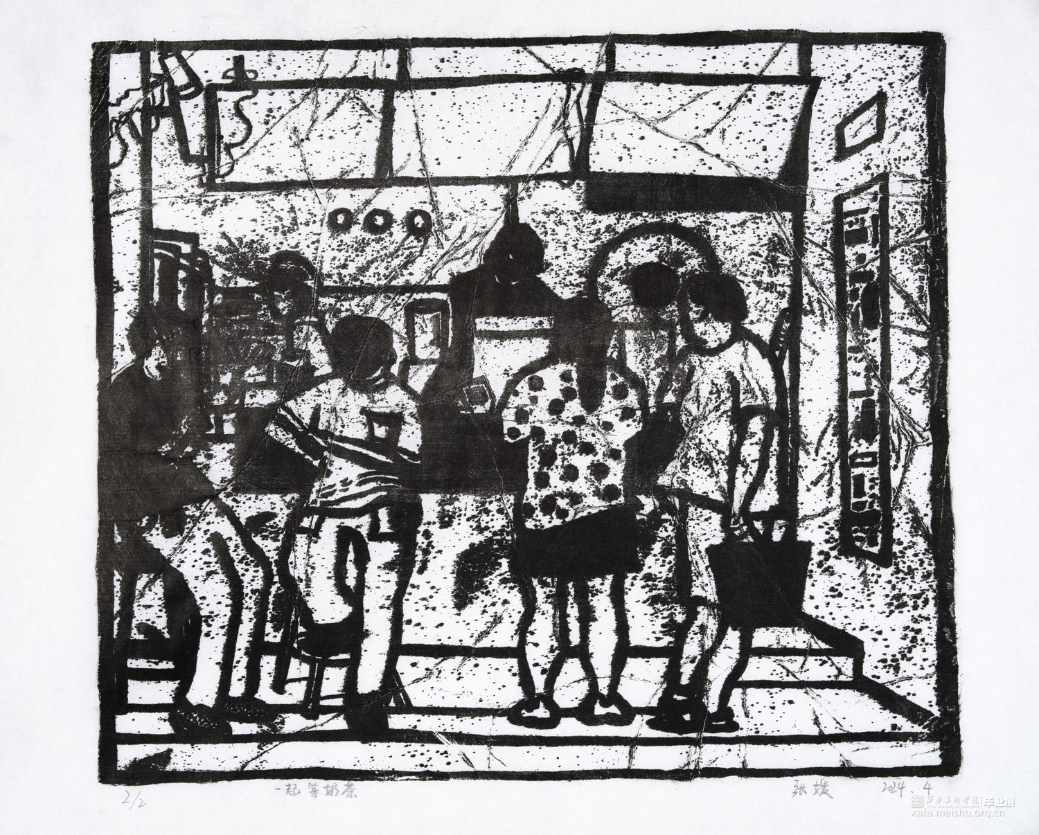我从童年就生长在这里,这里的一切都非常的熟悉,幼儿园和杂货店除了翻新其他没有改变,一如即往的人们生活在我的周围,因为太过熟悉也常常忽略,于是为了记住这个从童年就存在的地方,我用画把他们记住。用一种特殊的绘画方式,把在人间的他们都生长在我的画里,在社会中寻找自我,我和他们一样存在于人间。我的大学环境同样让我喜爱,大学知识的积累和思想的洗礼对我个人的成长非常重要,所以我也把这些展现在画面中。总的来说,这套版画作品以我自身的成长环境为创作主线,通过细腻入微的肌理展现了很多的生活场景,生动地记录了在人间的人们。