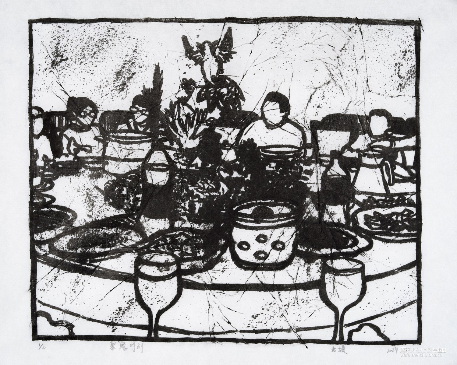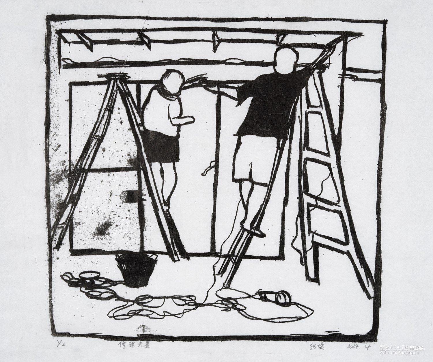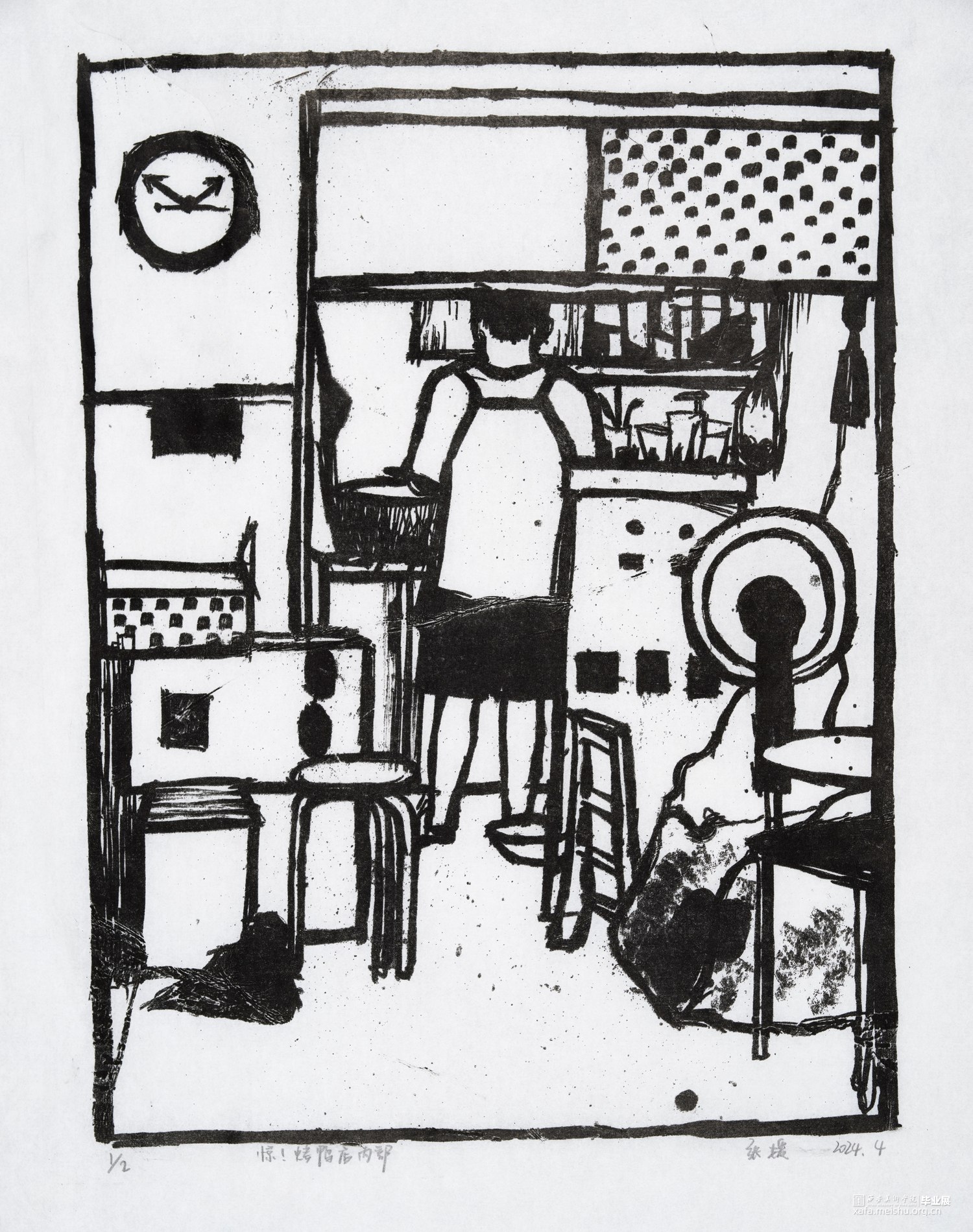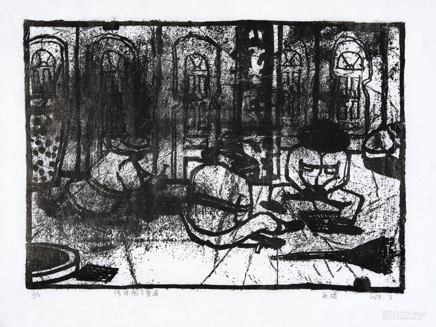 我从童年就生长在这里,这里的一切都非常的熟悉,幼儿园和杂货店除了翻新其他没有改变,一如即往的人们生活在我的周围,因为太过熟悉也常常忽略,于是为了记住这个从童年就存在的地方,我用画把他们记住。用一种特殊的绘画方式,把在人间的他们都生长在我的画里,在社会中寻找自我,我和他们一样存在于人间。我的大学环境同样让我喜爱,大学知识的积累和思想的洗礼对我个人的成长非常重要,所以我也把这些展现在画面中。总的来说,这套版画作品以我自身的成长环境为创作主线,通过细腻入微的肌理展现了很多的生活场景,生动地记录了在人间的人们。