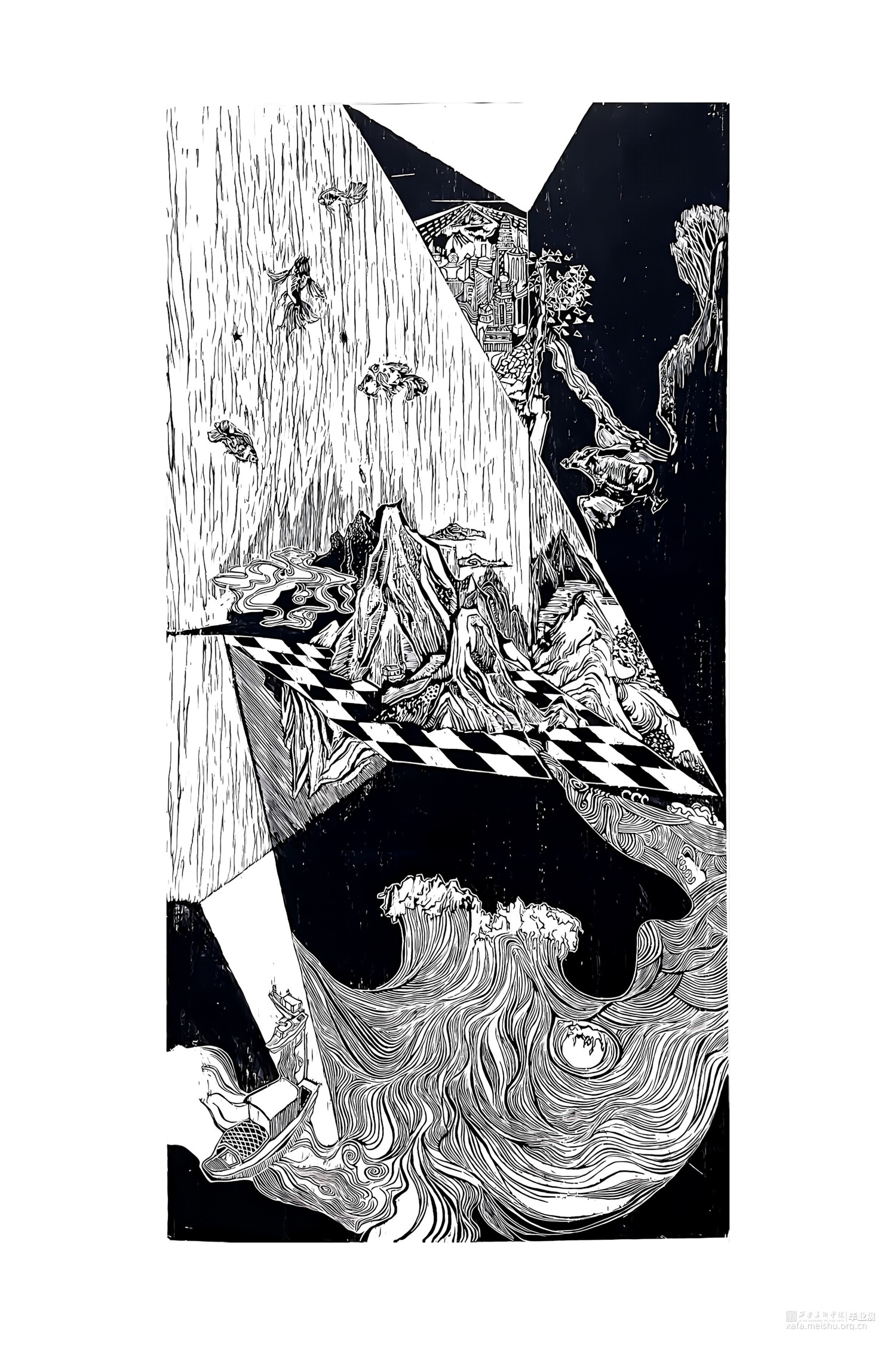 《一池芳华印物华》系列作品的第一幅作品以棋盘和山峦为核心元素,通过细腻入微的木刻线条,精心勾勒出一幅山水相映、物华天宝的瑰丽画卷。山石嶙峋,草木华滋,画面中的每一笔、每一划都充满了生命力与活力。这幅作品不仅展现了古韵山水的静谧与深邃,还巧妙地融入了现代建筑的元素,形成了一幅既具国画神韵,又富含现代感的视觉盛宴。