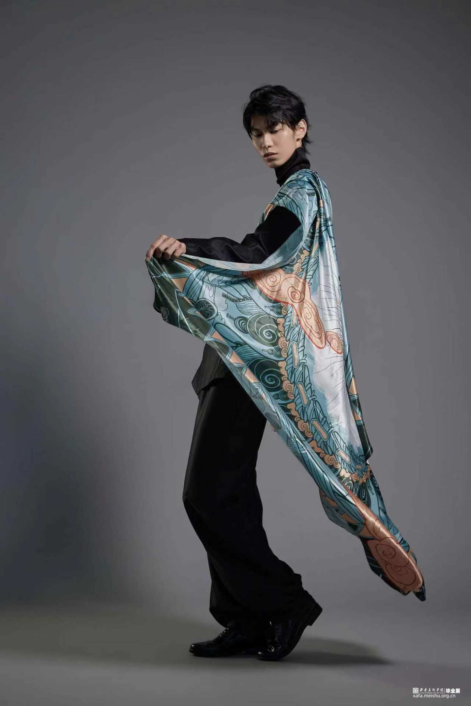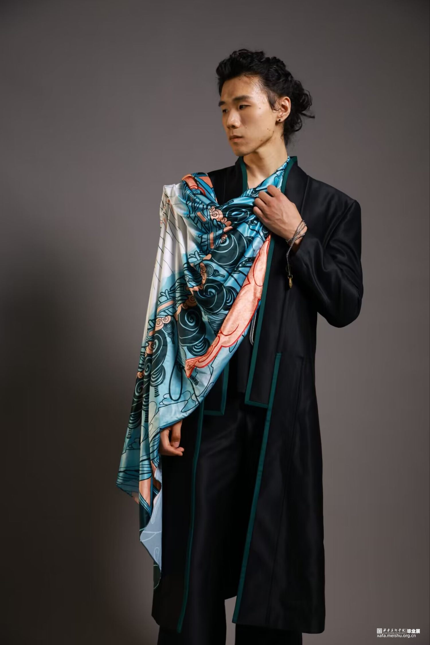 这个系列的服装设计,采用了西装搭配丝巾的方案,西装造型上加入了一些汉服结构,丝巾的绘制上则掺杂了对迷幻摇滚的感受。