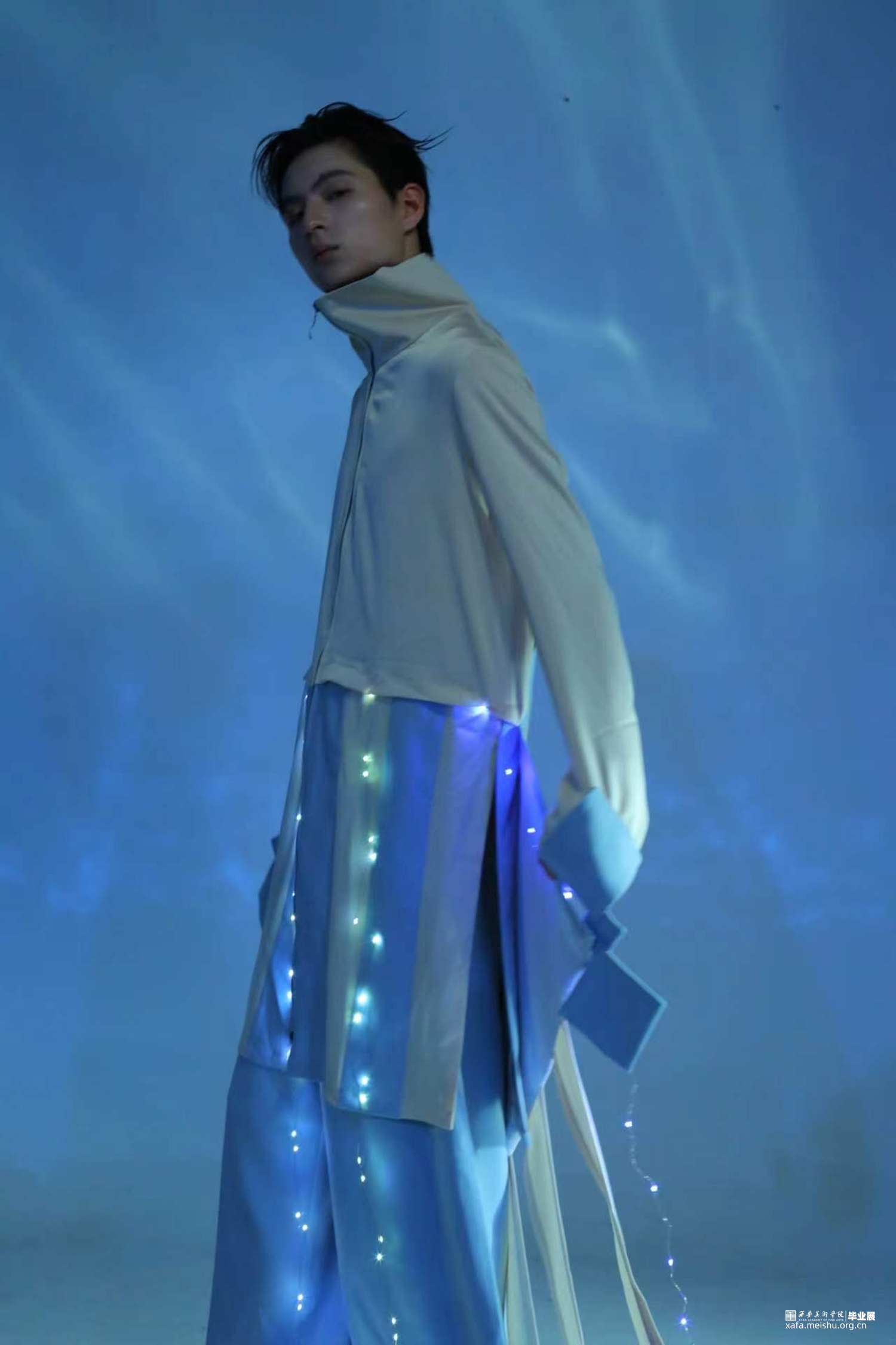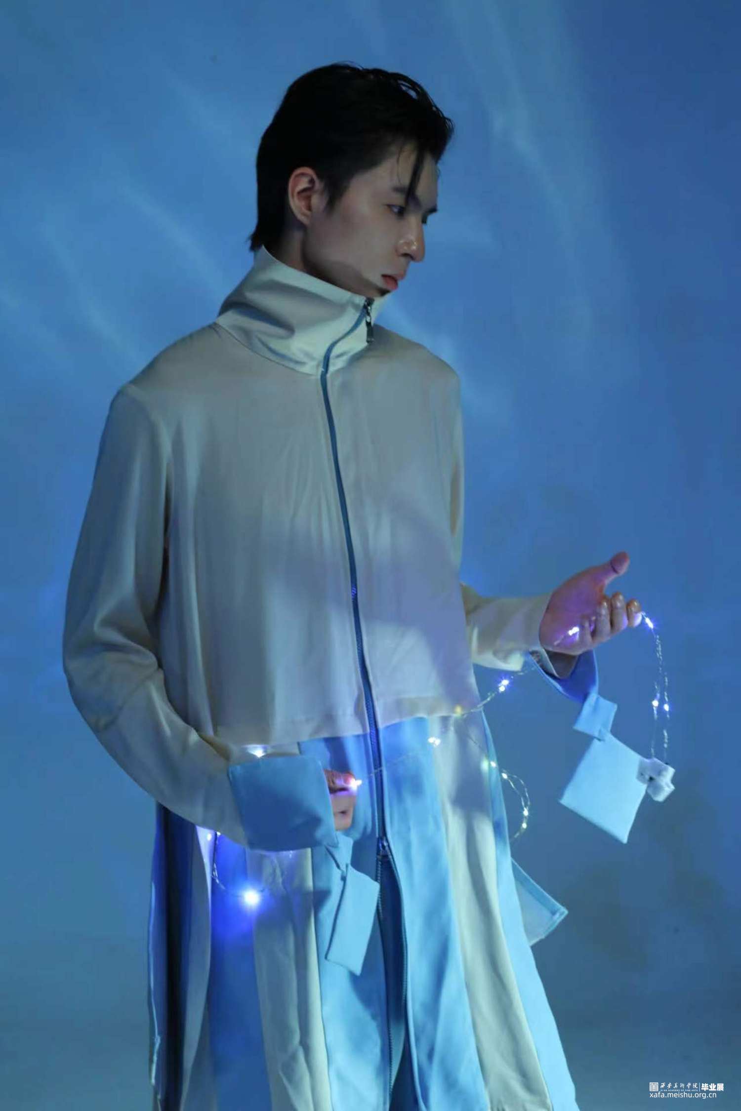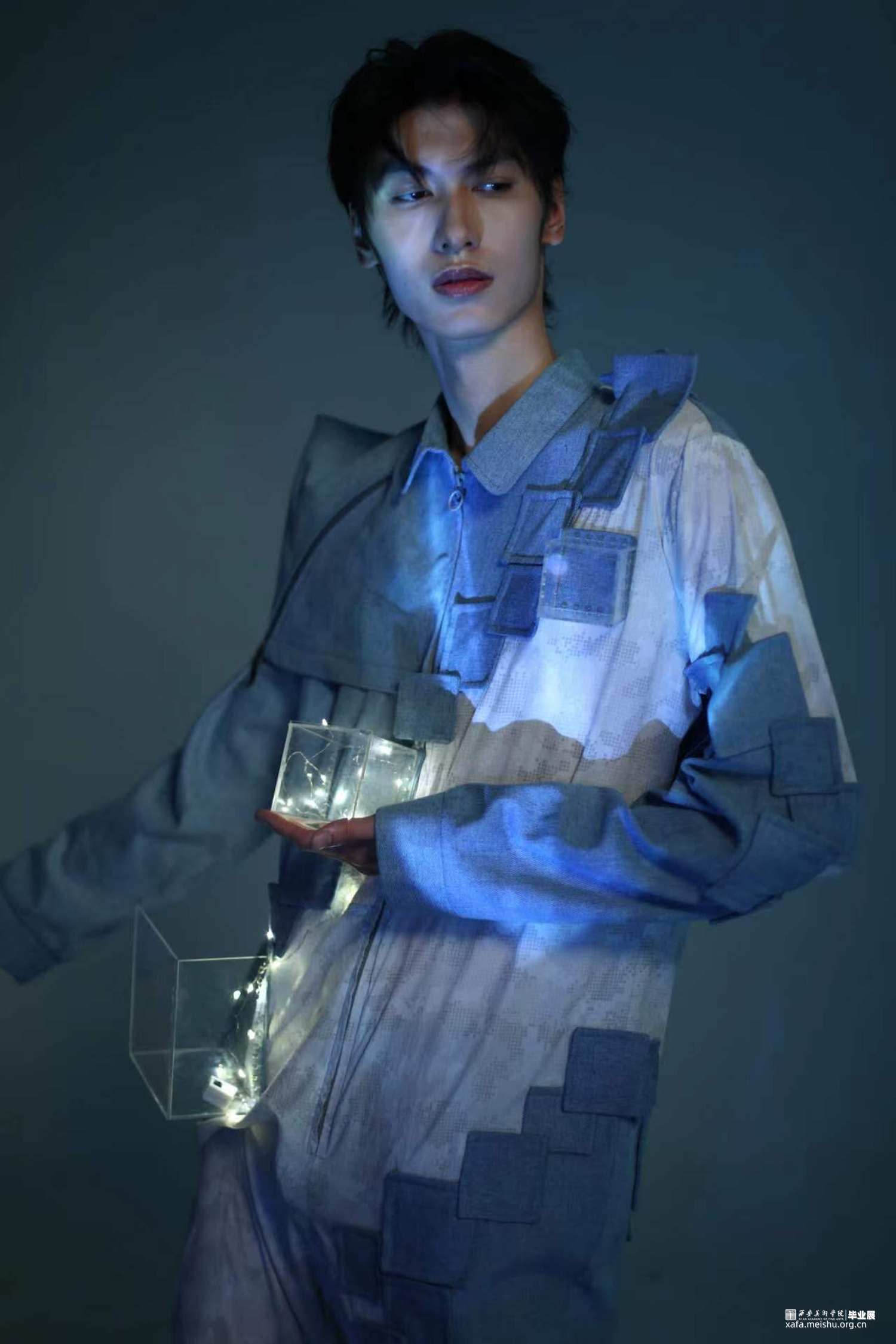 设计遵循了由碎片化到整体的设计理念。在服装的构造上,采用了分片裁剪的方法,这些碎片化的部分象征着加载过程中的不同阶段和元素。通过精心设计的剪裁和拼接,碎片最终组合成一件完整且富有层次感的服装,这一过程正是对“正在加载”这一概念的具象化表达。这种设计思路不仅展现了服装的动态美感,也寓意着个人或事物在成长过程中由分散到整合、由不完美到完美的转变。