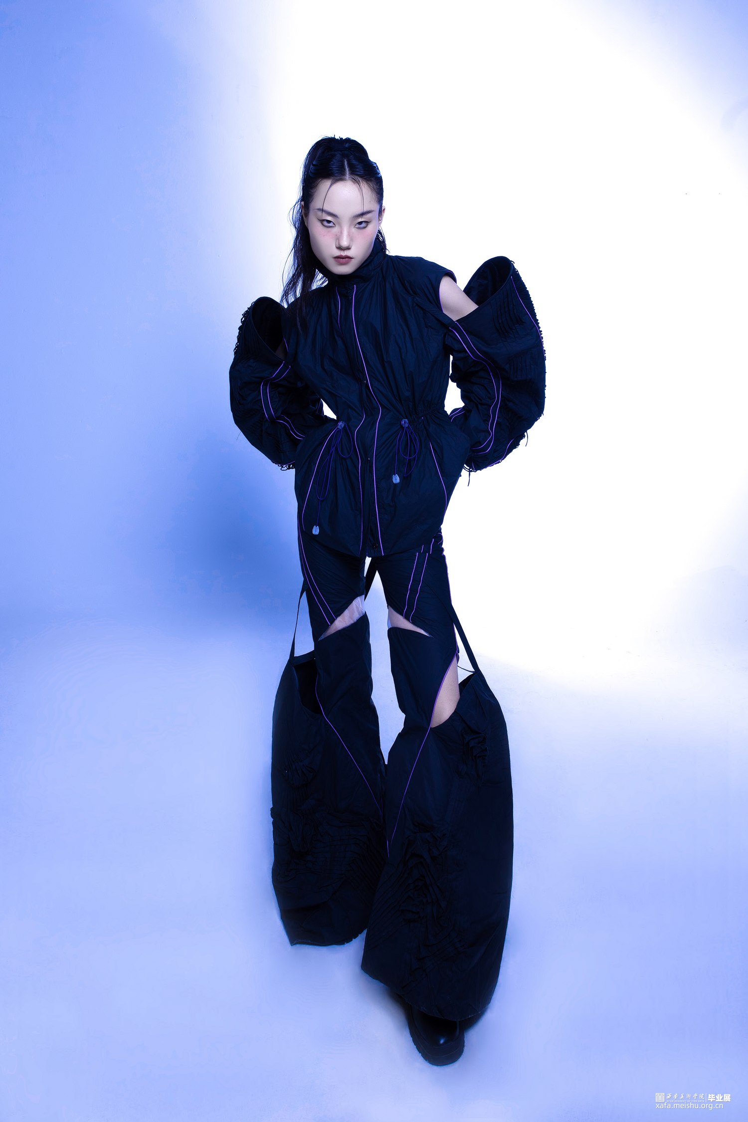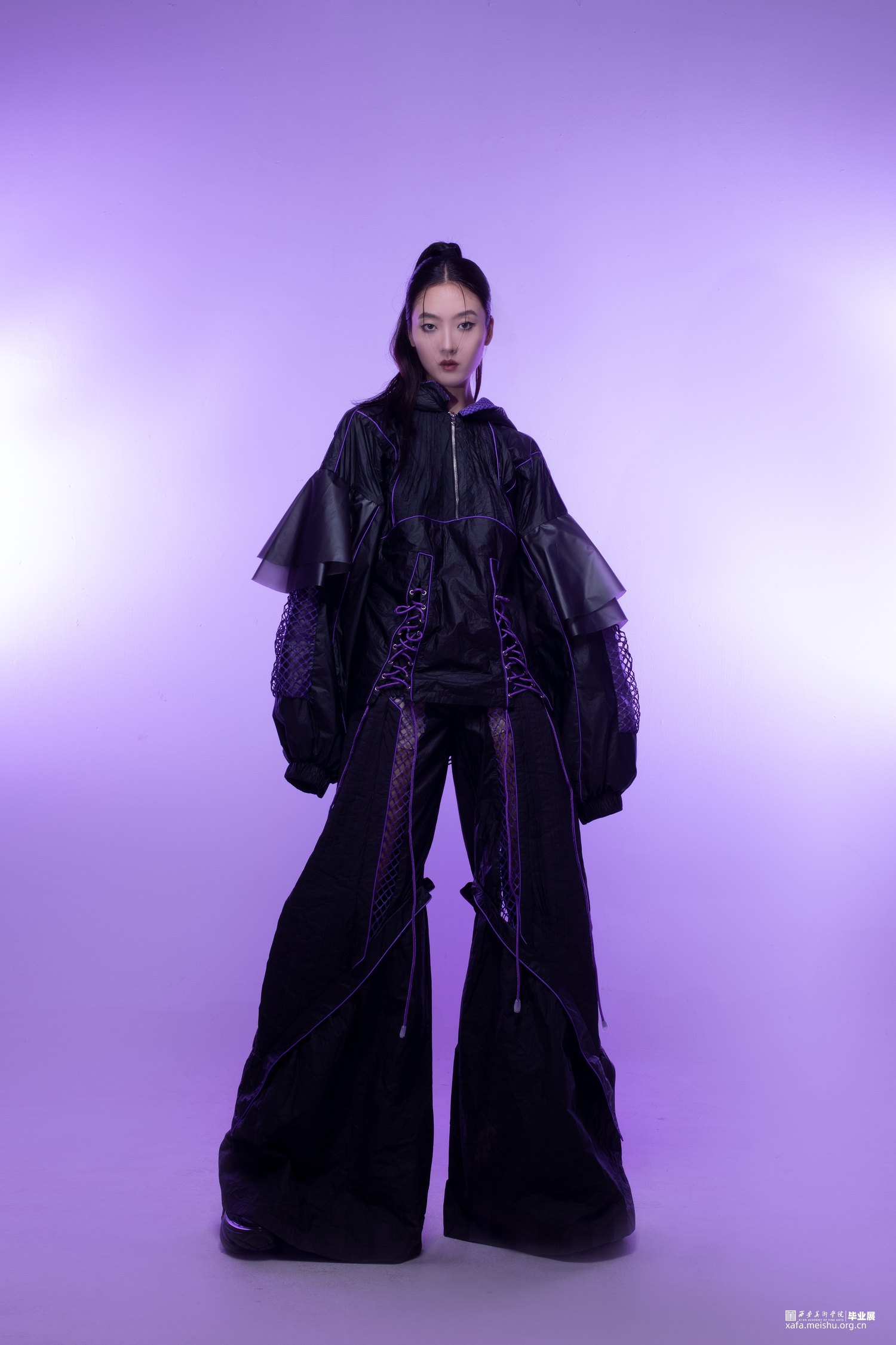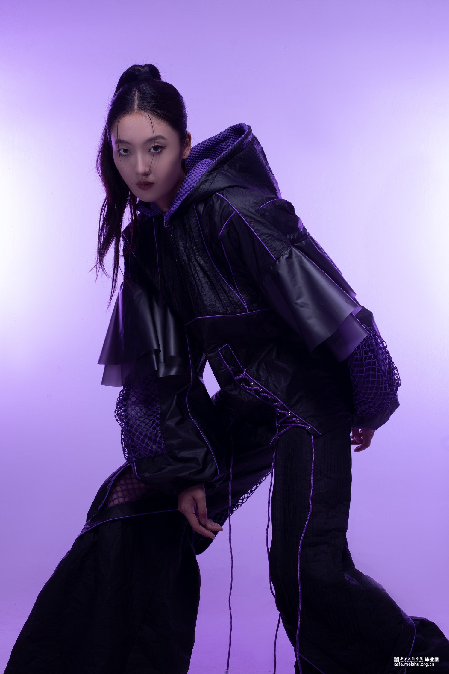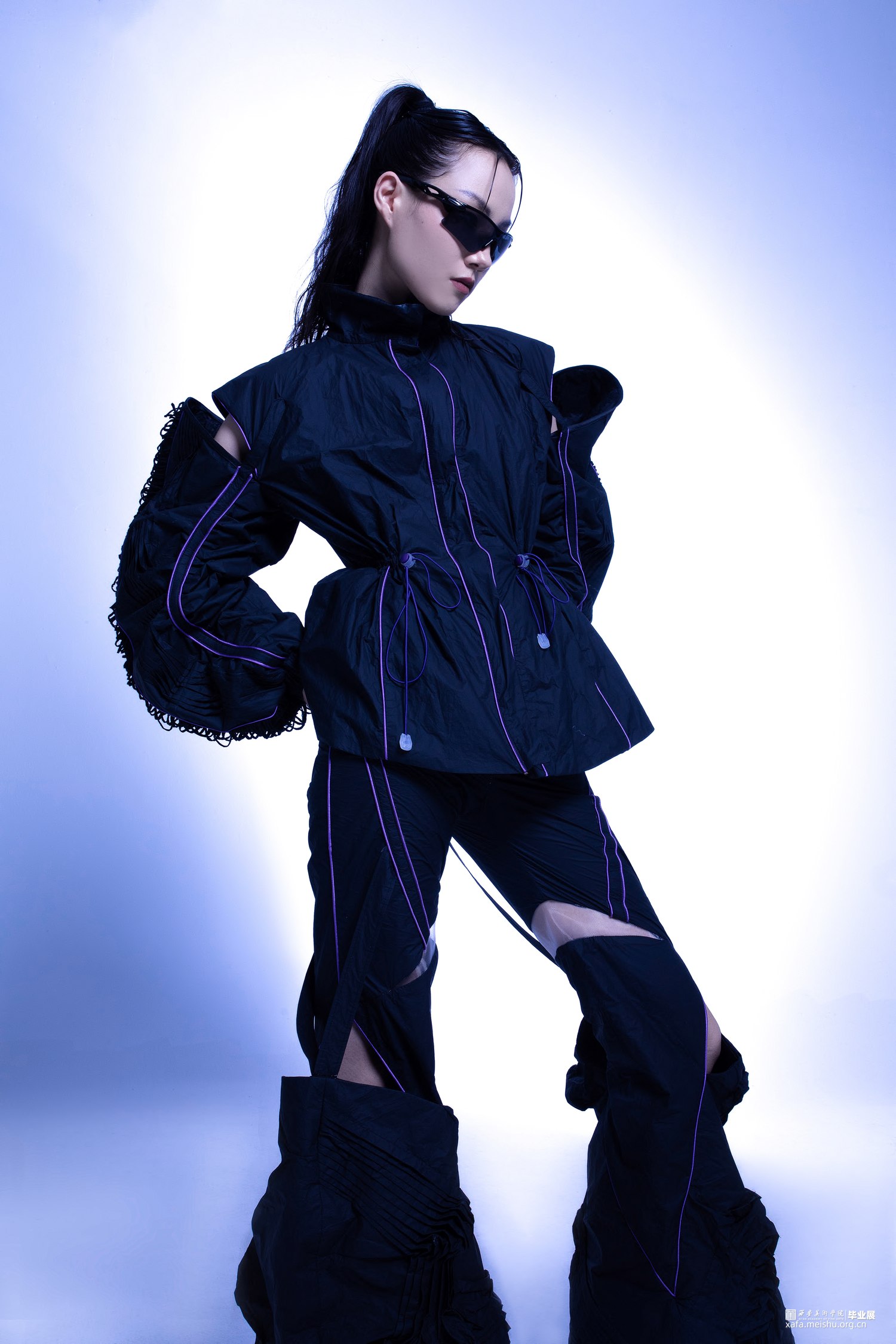 该作品以《静噪交织》为作品名称,以“噪音污染”为主题进行设计,将噪音进行可视化设计,运用一些能够表达和传递这些噪音的图案、色彩及材料等设计要素。通过巧妙地结合将这些要素融入服装设计中,以创造出独特的视觉效果和艺术风格。