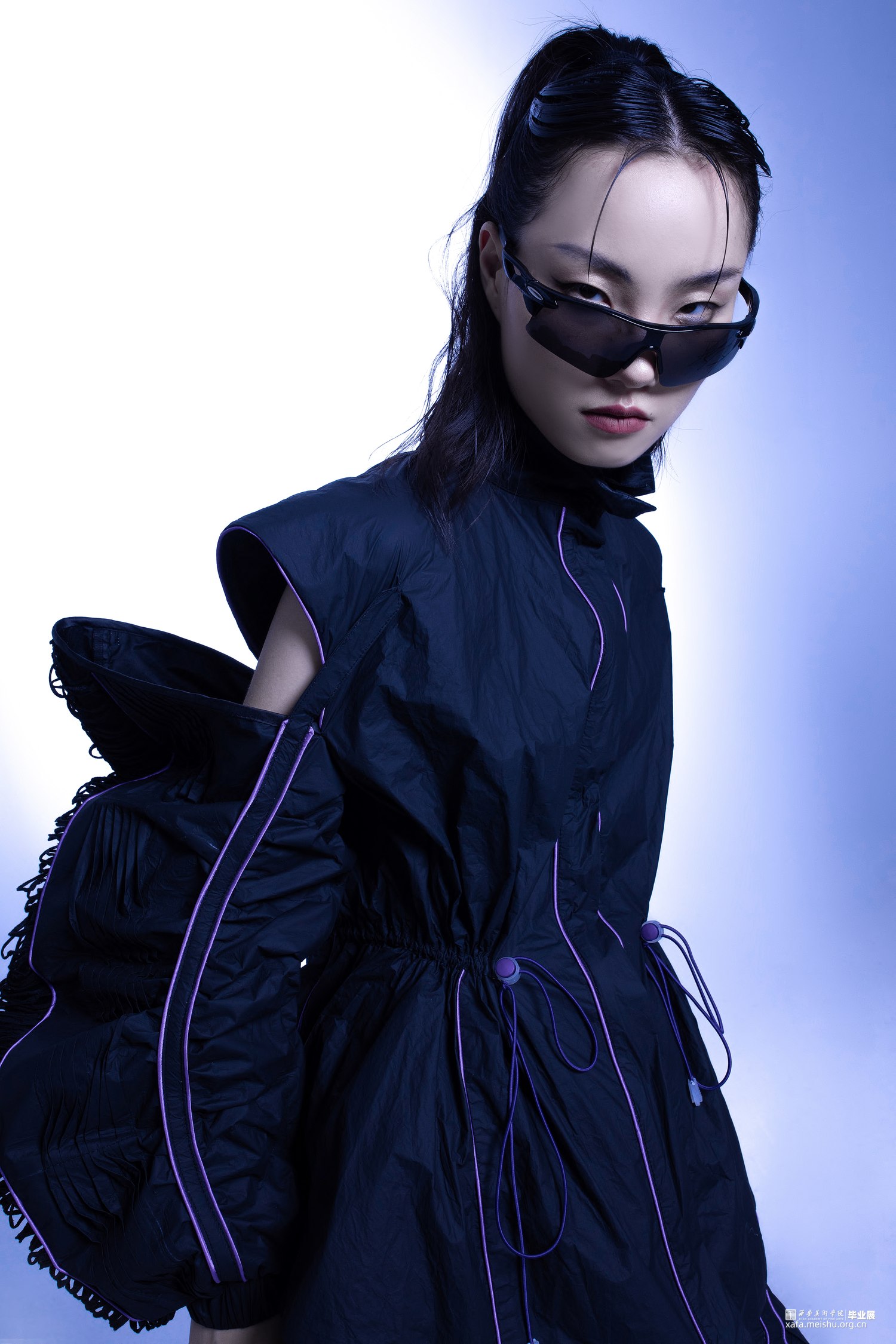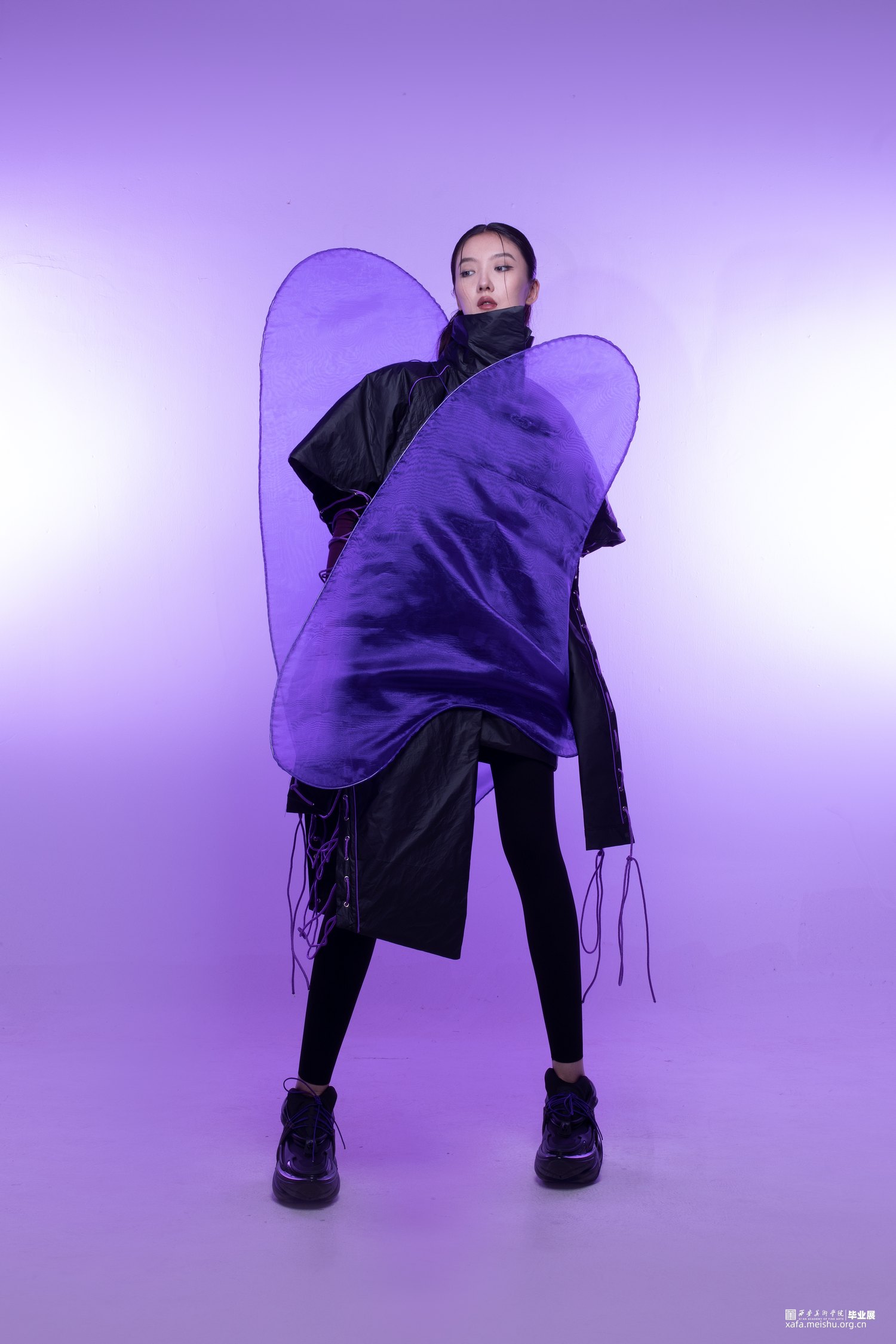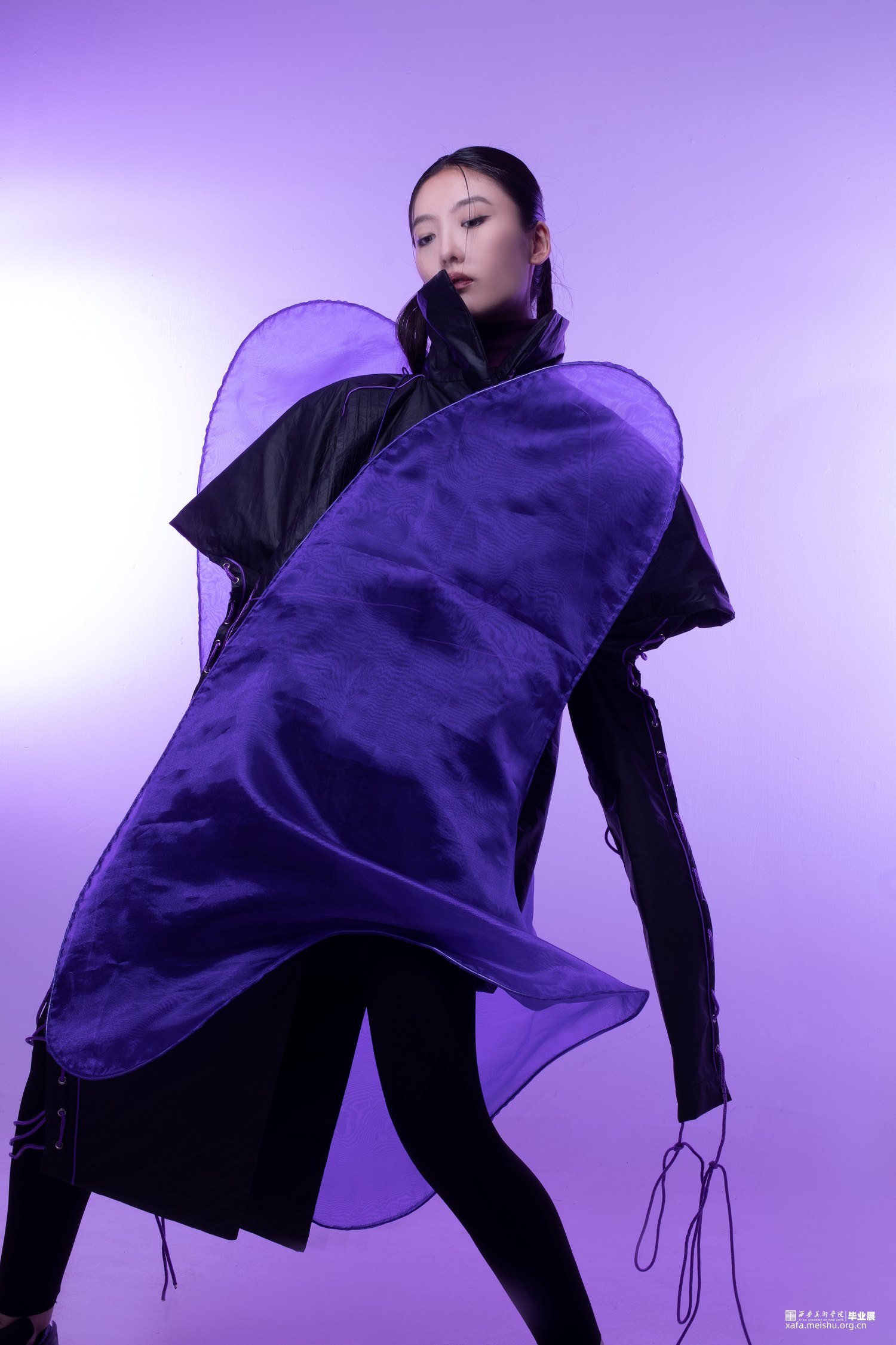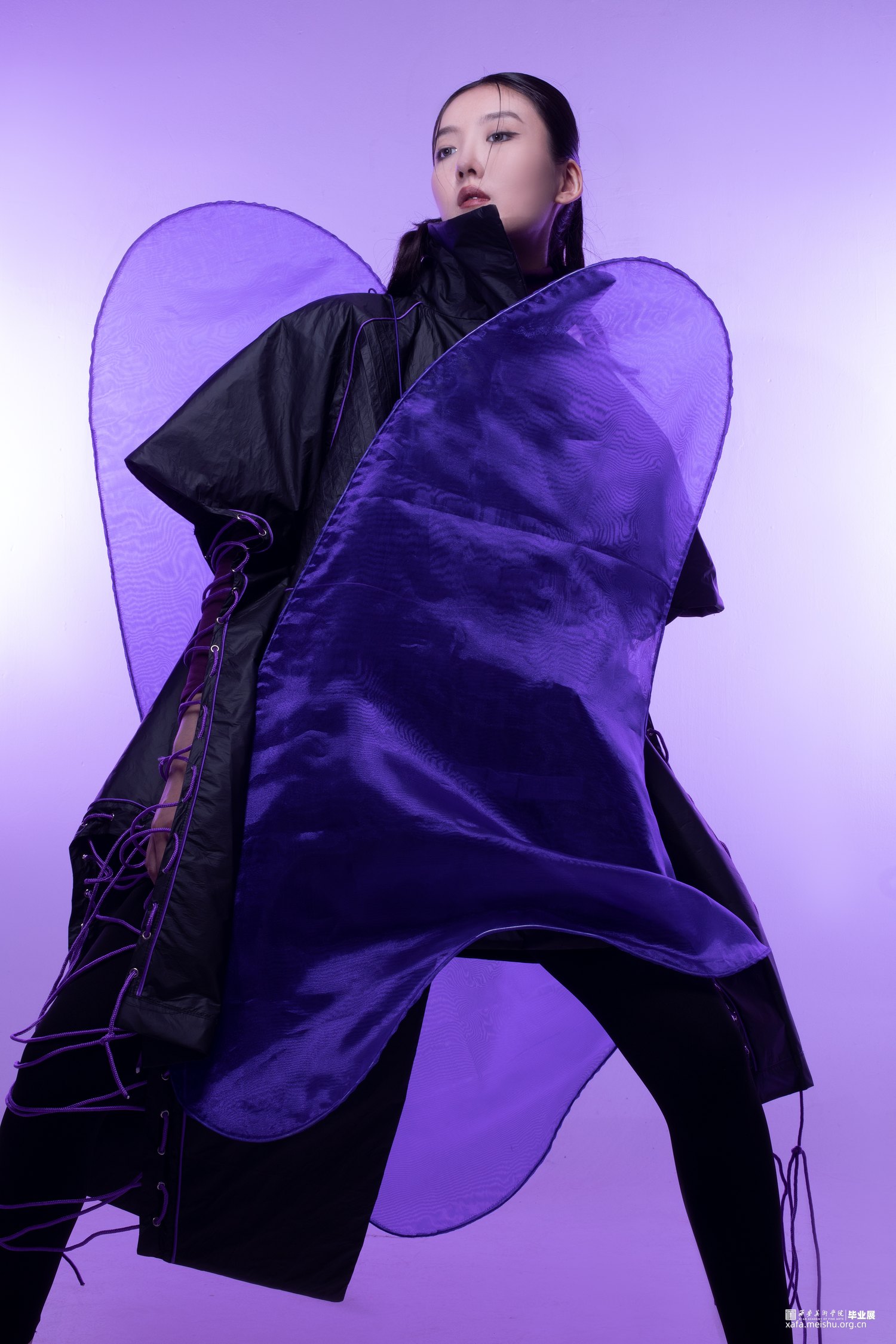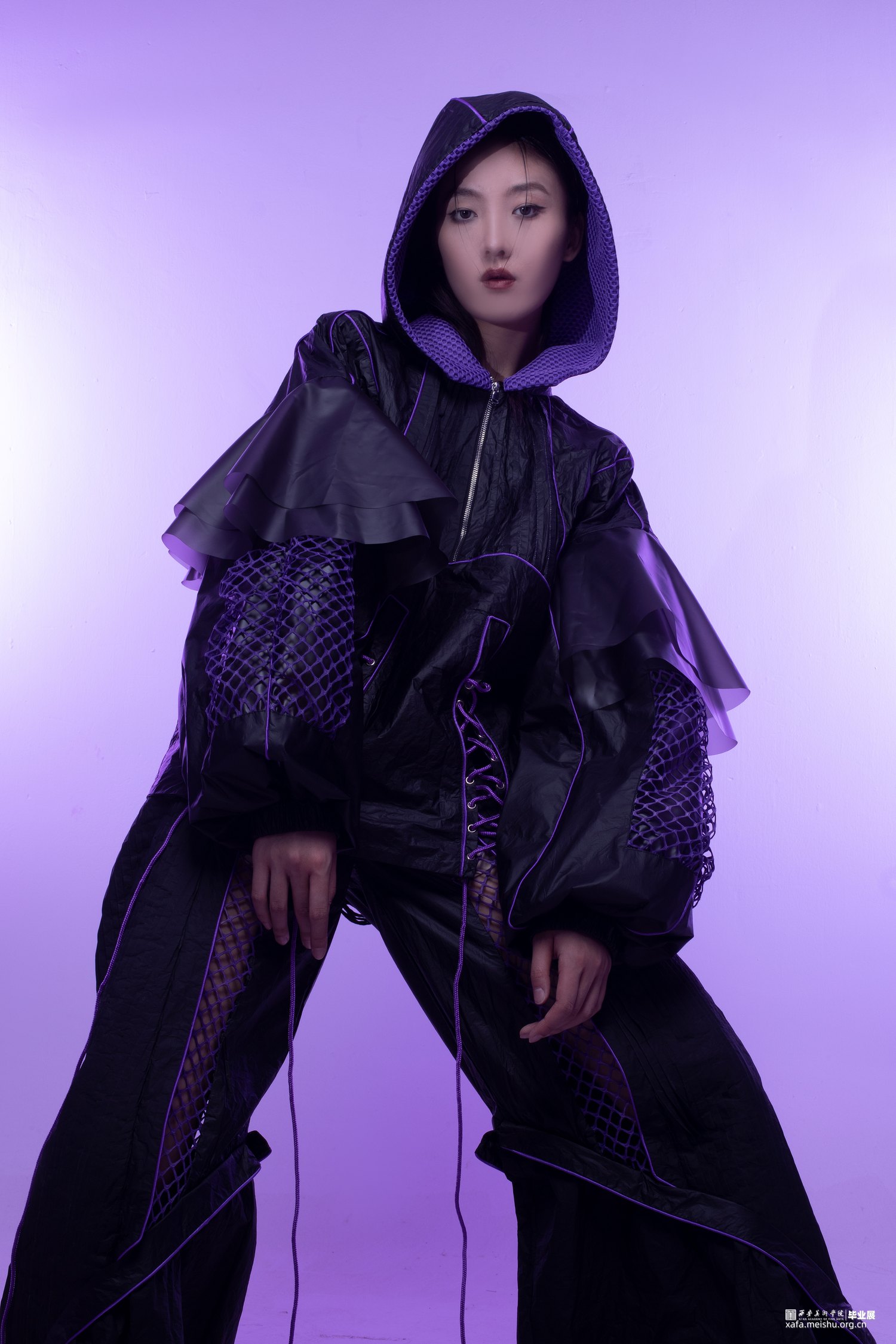 该作品以《静噪交织》为作品名称,以“噪音污染”为主题进行设计,将噪音进行可视化设计,运用一些能够表达和传递这些噪音的图案、色彩及材料等设计要素。通过巧妙地结合将这些要素融入服装设计中,以创造出独特的视觉效果和艺术风格。