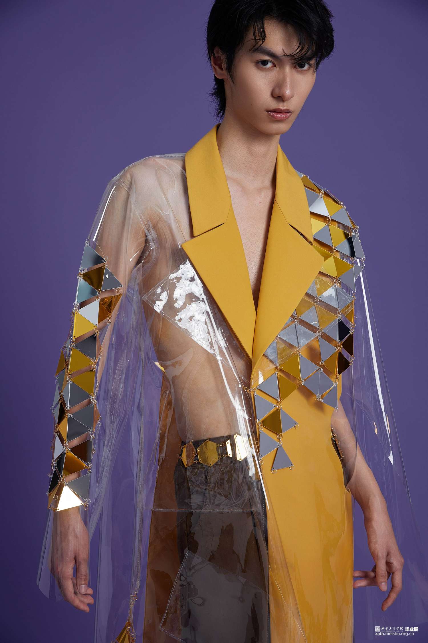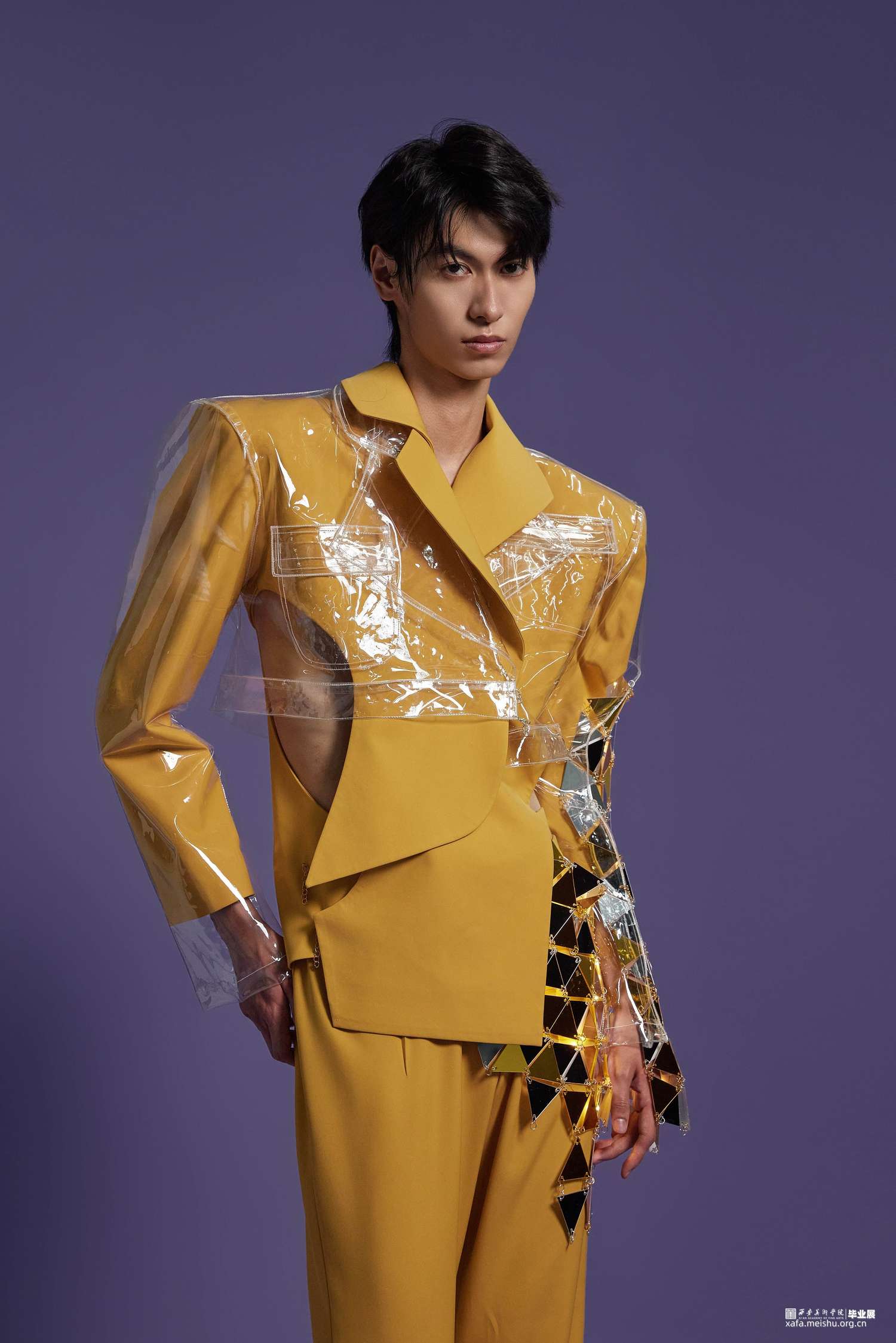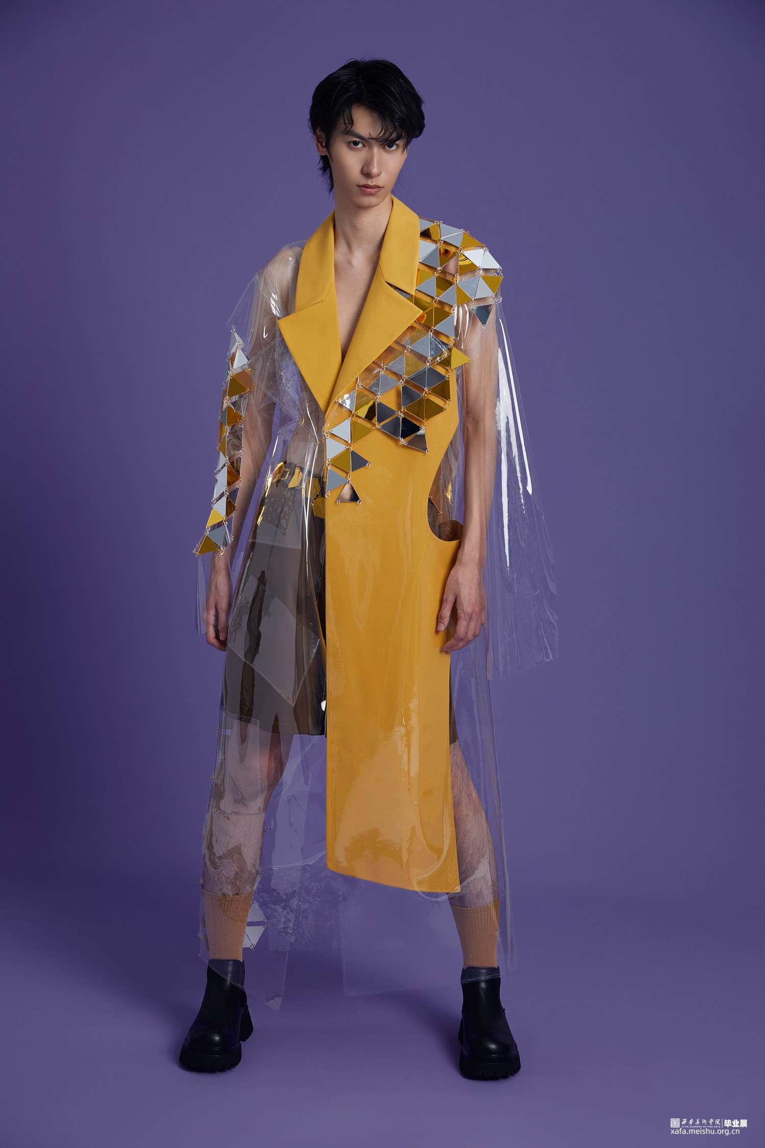 在本次设计中选用了传统的服装面料和PVC材料相结合,同时还使用了一些亚克力材质编织而成的面料并加入了灯光元素,更具科技感,PVC作为环保材料的一种,具有可回收的特点,也表达了环保可持续理念的设计理念。在色彩设计上,选择黄色作为主色调,黄色有着代表自然生态,代表田园光景的色彩语言内涵,同时也代表了可持续。自然界的万物也都要经历由绿转黄的阶段,当他们生命走到尽头时,还能够发挥其他作用,一些植物纤维,例如稻草棉麻等,甚至也可以作为面料使用。本次男装设计分为三件,有长款、短款、西装、大衣、裙子,整体廓形在原有的基础上进行了加宽加大处理,尤其是在肩部进行了夸张化设计,能够更加体现男性生理结构特点。整体运用解构主义的手法进行设计,在前后片,腰部、口袋等部位采用非对称式设计,同时运用曲线元素进行解构分割,使其更富有设计感。