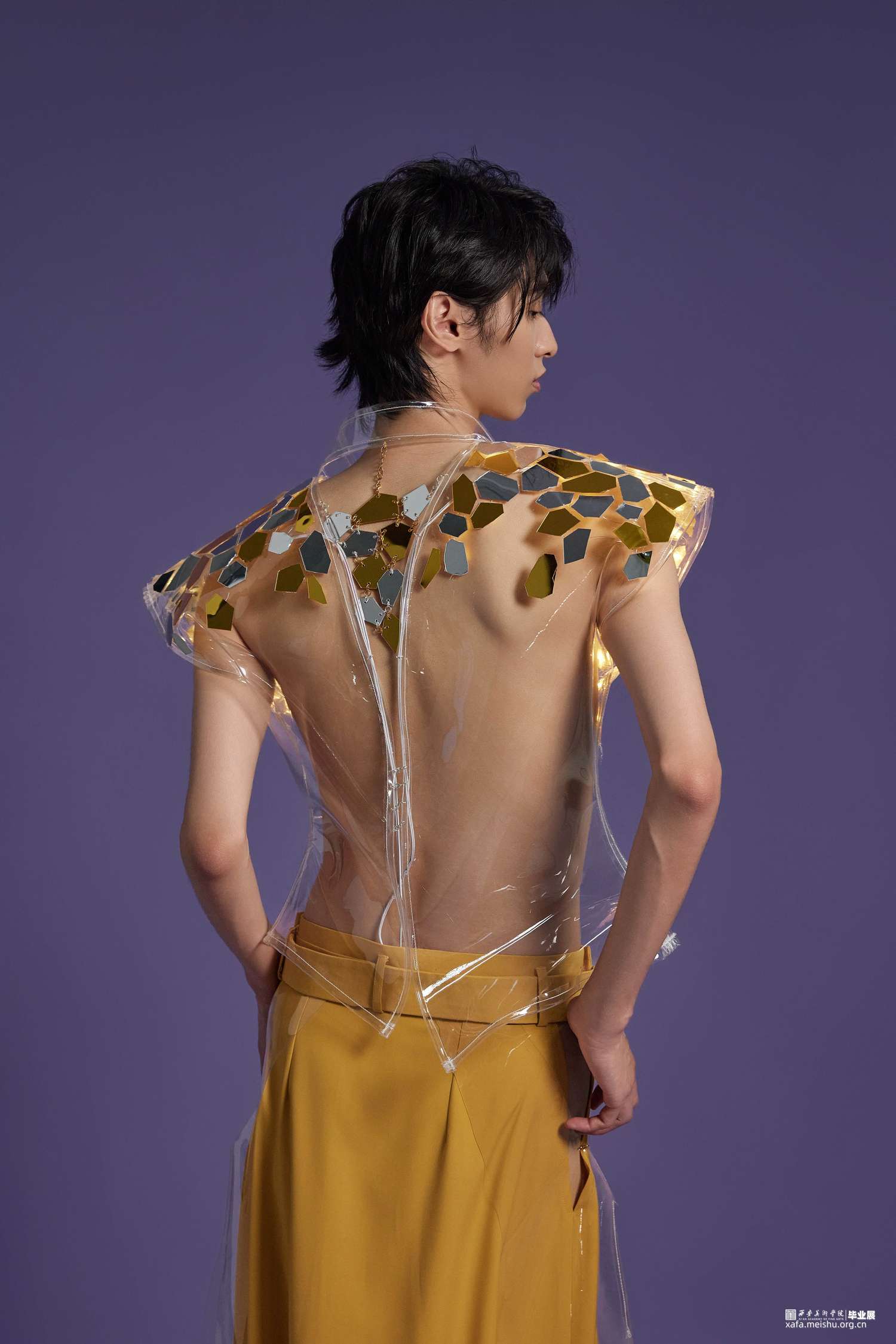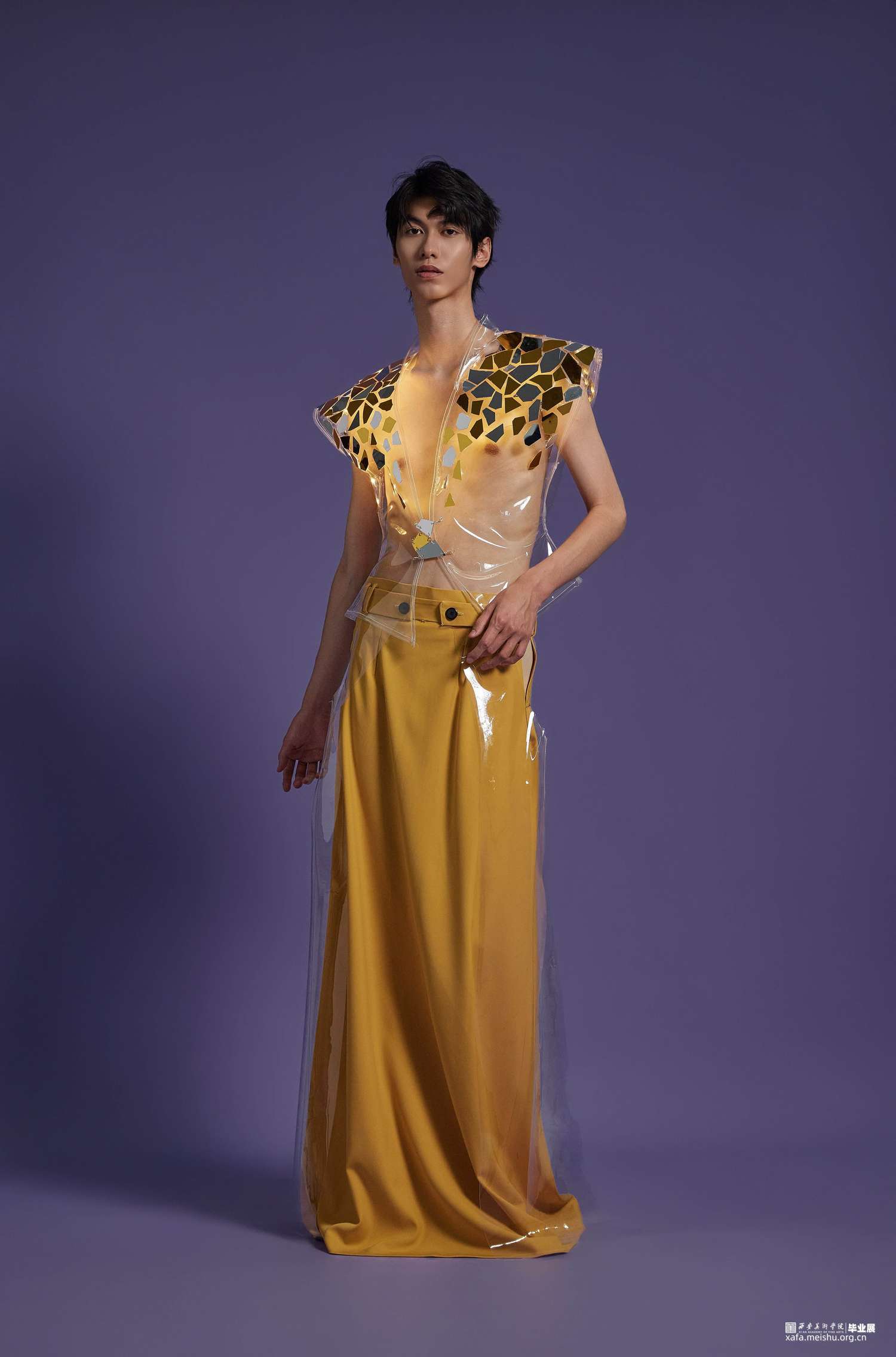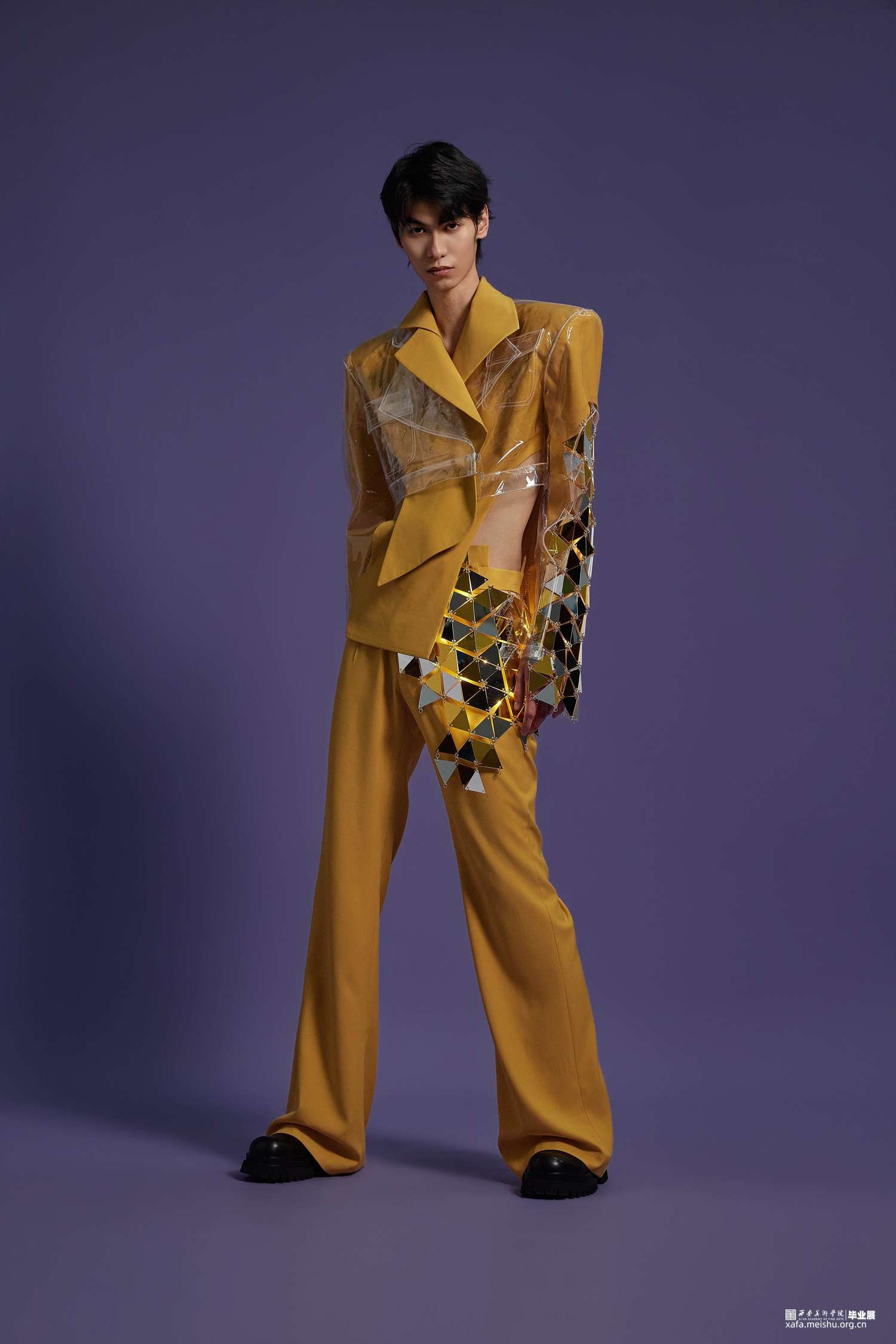 在本次设计中选用了传统的服装面料和PVC材料相结合,同时还使用了一些亚克力材质编织而成的面料并加入了灯光元素,更具科技感,PVC作为环保材料的一种,具有可回收的特点,也表达了环保可持续理念的设计理念。在色彩设计上,选择黄色作为主色调,黄色有着代表自然生态,代表田园光景的色彩语言内涵,同时也代表了可持续。自然界的万物也都要经历由绿转黄的阶段,当他们生命走到尽头时,还能够发挥其他作用,一些植物纤维,例如稻草棉麻等,甚至也可以作为面料使用。本次男装设计分为三件,有长款、短款、西装、大衣、裙子,整体廓形在原有的基础上进行了加宽加大处理,尤其是在肩部进行了夸张化设计,能够更加体现男性生理结构特点。整体运用解构主义的手法进行设计,在前后片,腰部、口袋等部位采用非对称式设计,同时运用曲线元素进行解构分割,使其更富有设计感。