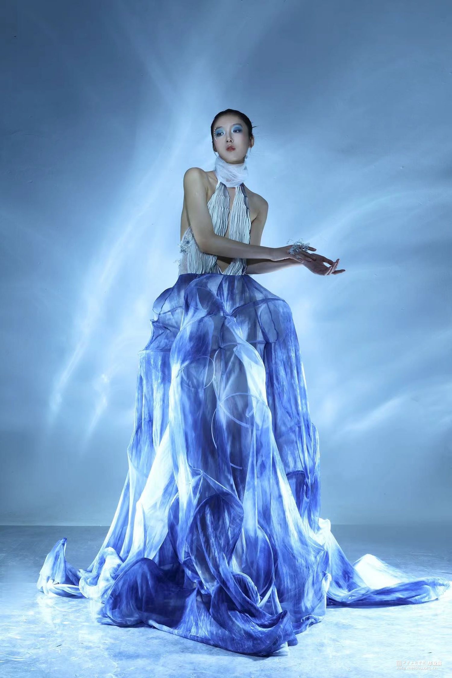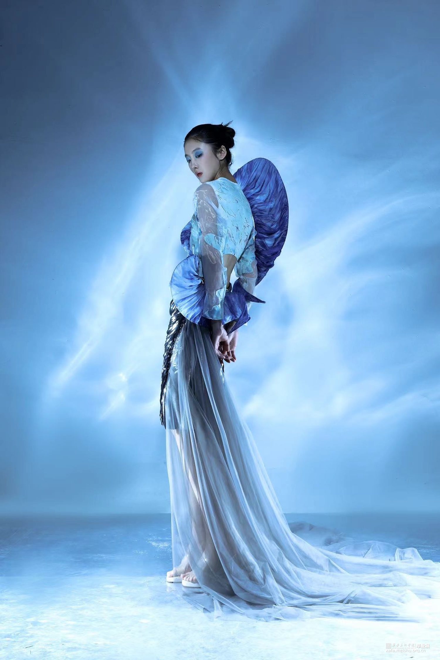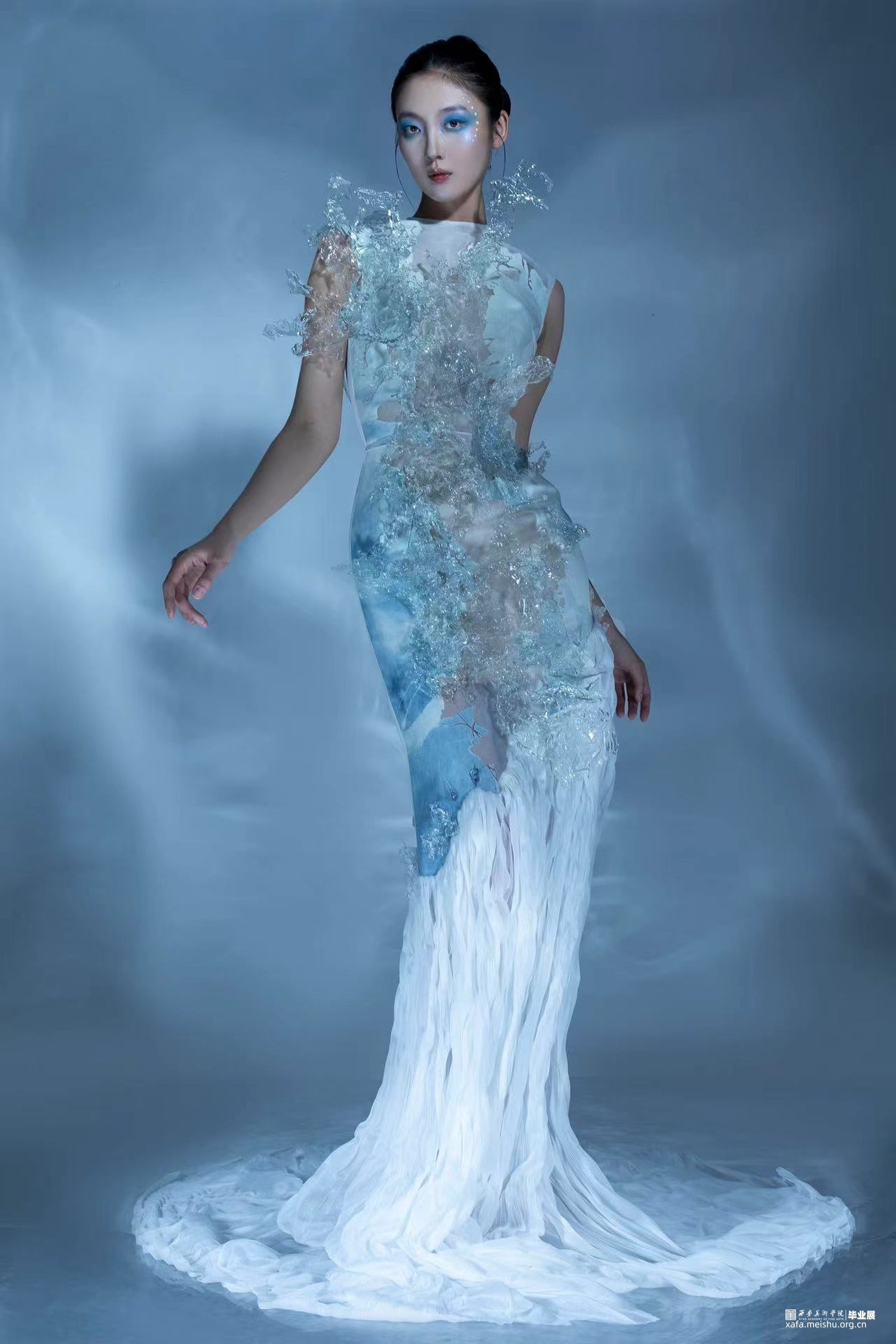 作品简要介绍:选题通过海洋污染元素在服装设计中的研究,并结合当下与其相关的社会现象,进而将海洋垃圾,生态环境以及环保理念 向具体的设计语言转化,最终将提取出的设计元素应用到时尚创意服装的设计当中。通过服装语言传达出人们对海洋生态环境的思考。