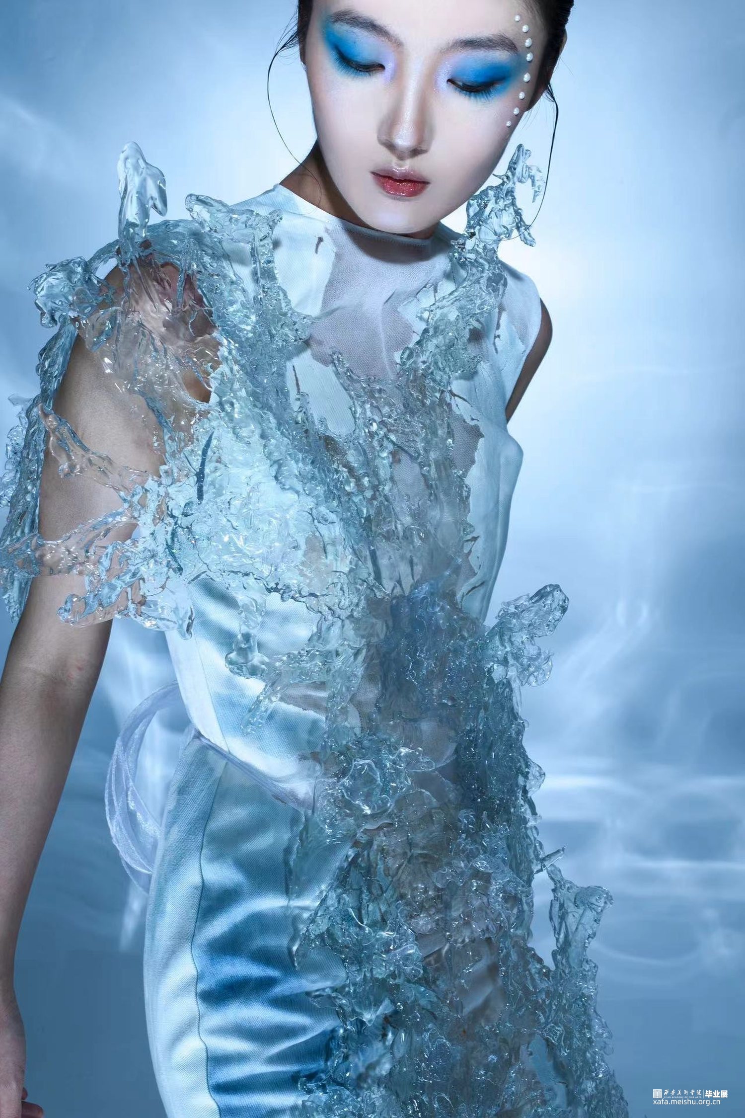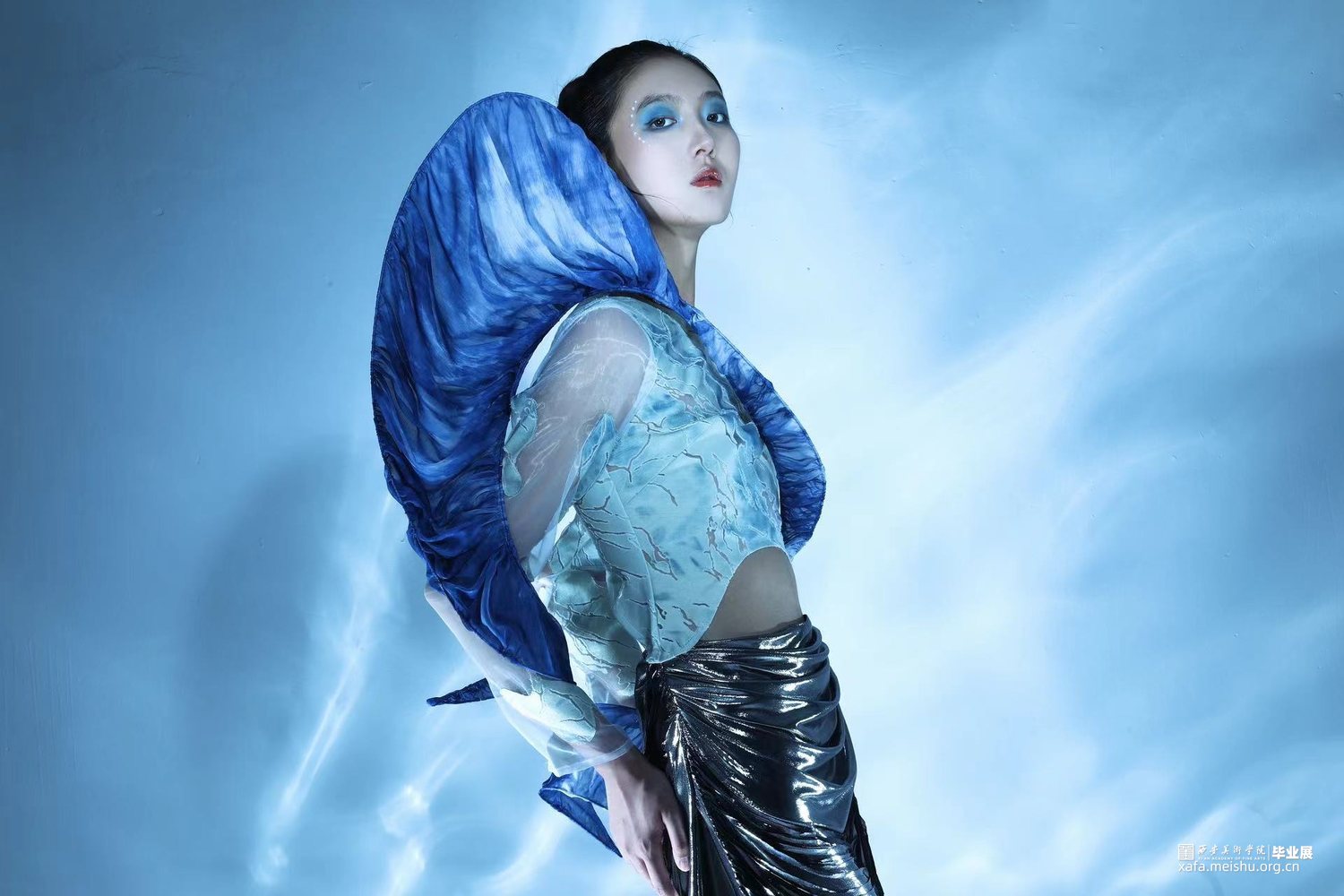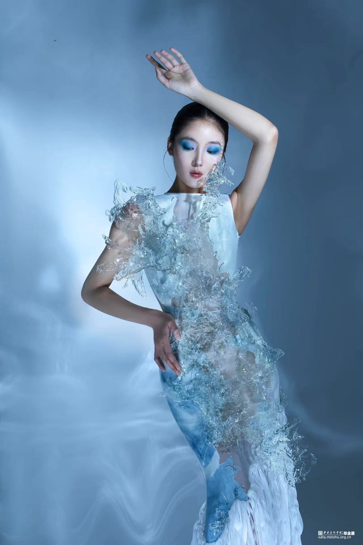 作品简要介绍:选题通过海洋污染元素在服装设计中的研究,并结合当下与其相关的社会现象,进而将海洋垃圾,生态环境以及环保理念 向具体的设计语言转化,最终将提取出的设计元素应用到时尚创意服装的设计当中。通过服装语言传达出人们对海洋生态环境的思考。