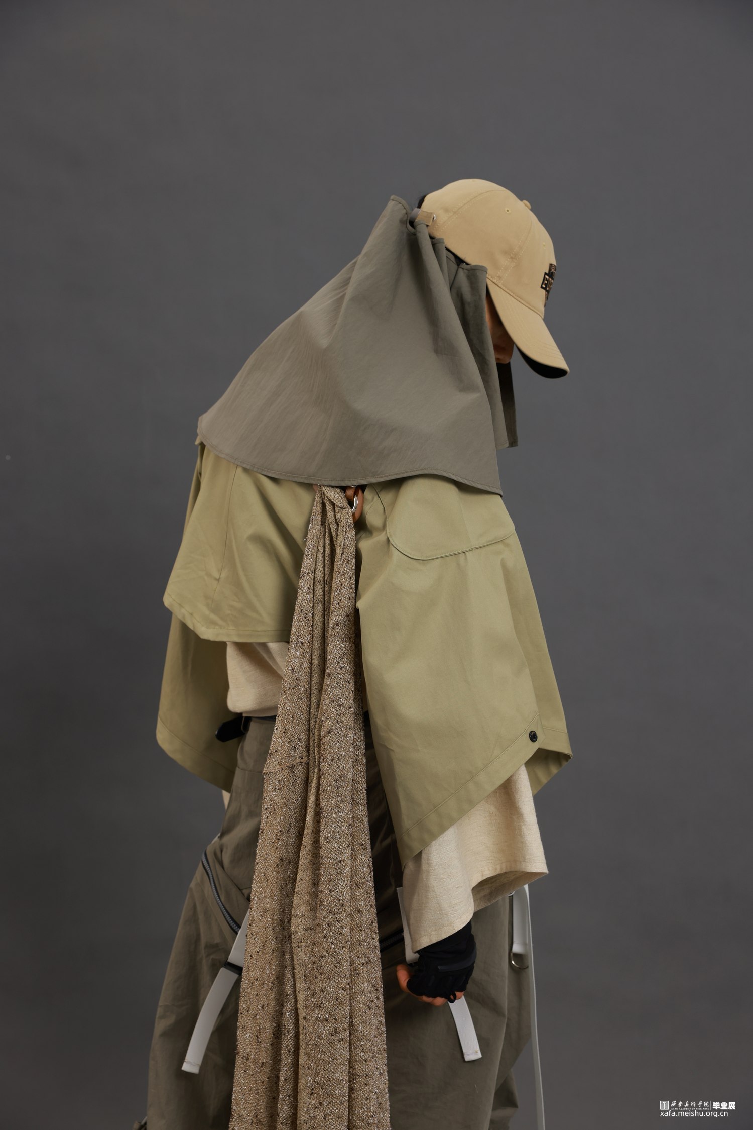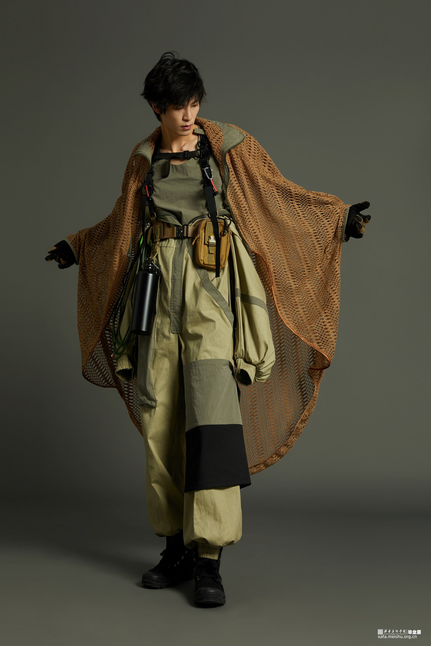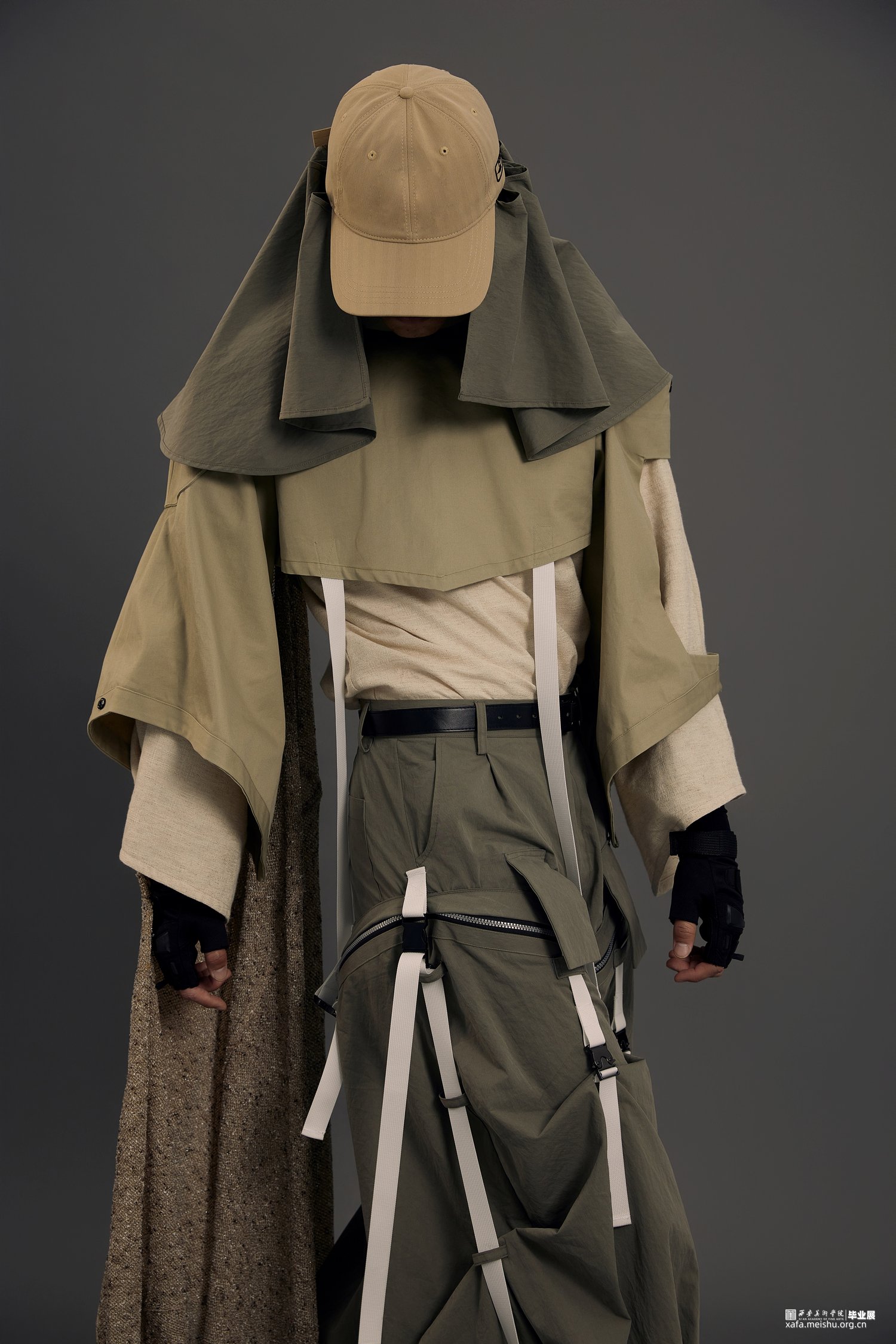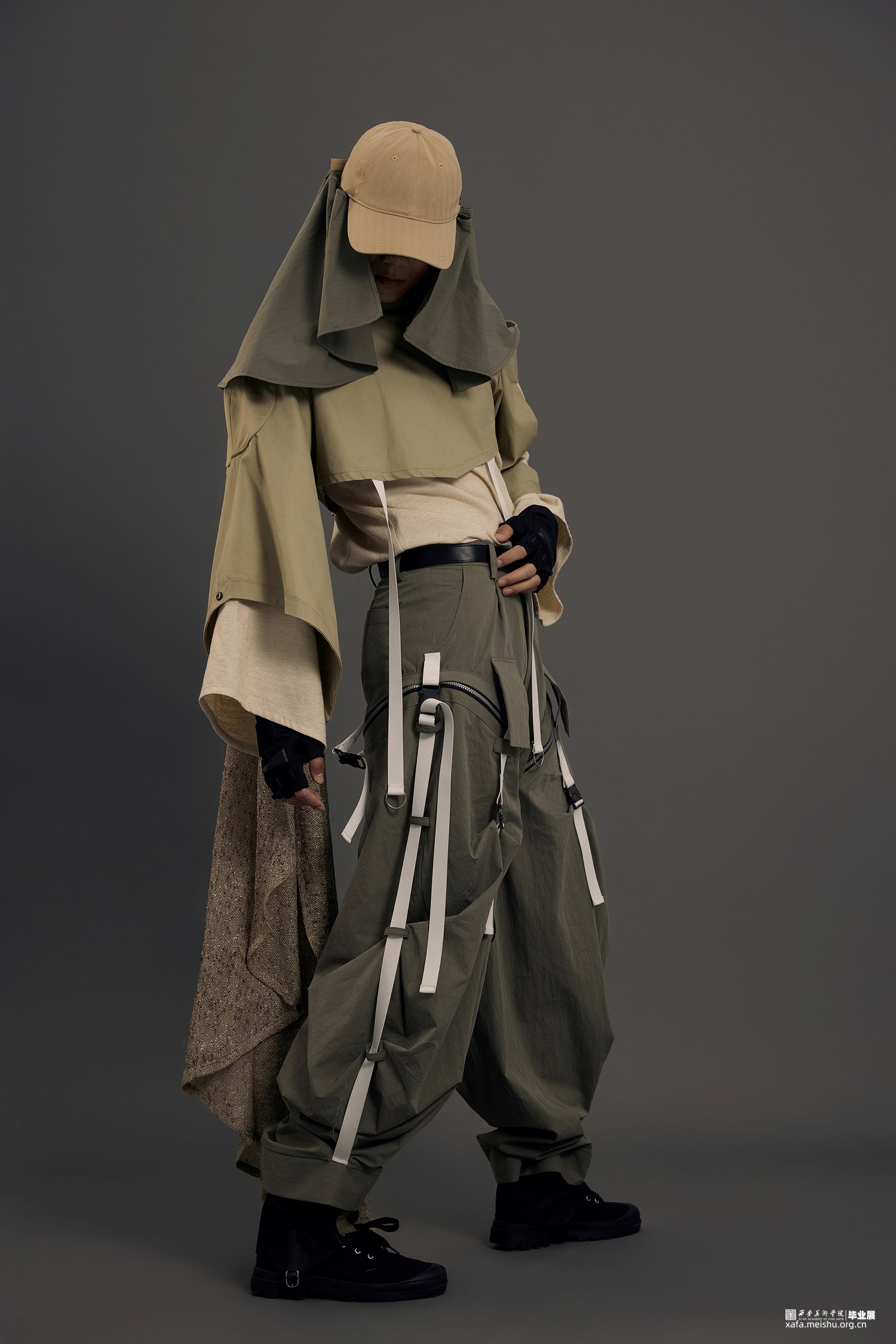 第一套服装由棕色网披风和工装连衣裤组成,披风上的网格设计独具特色,裤子则采用黑色与绿色的拼接。黑色腰封增添了实用性。整体设计融合休闲与探险元素,展现出自由奔放的气息。它可能代表现代时尚对沙漠探险的热爱,或是专为户外活动打造。