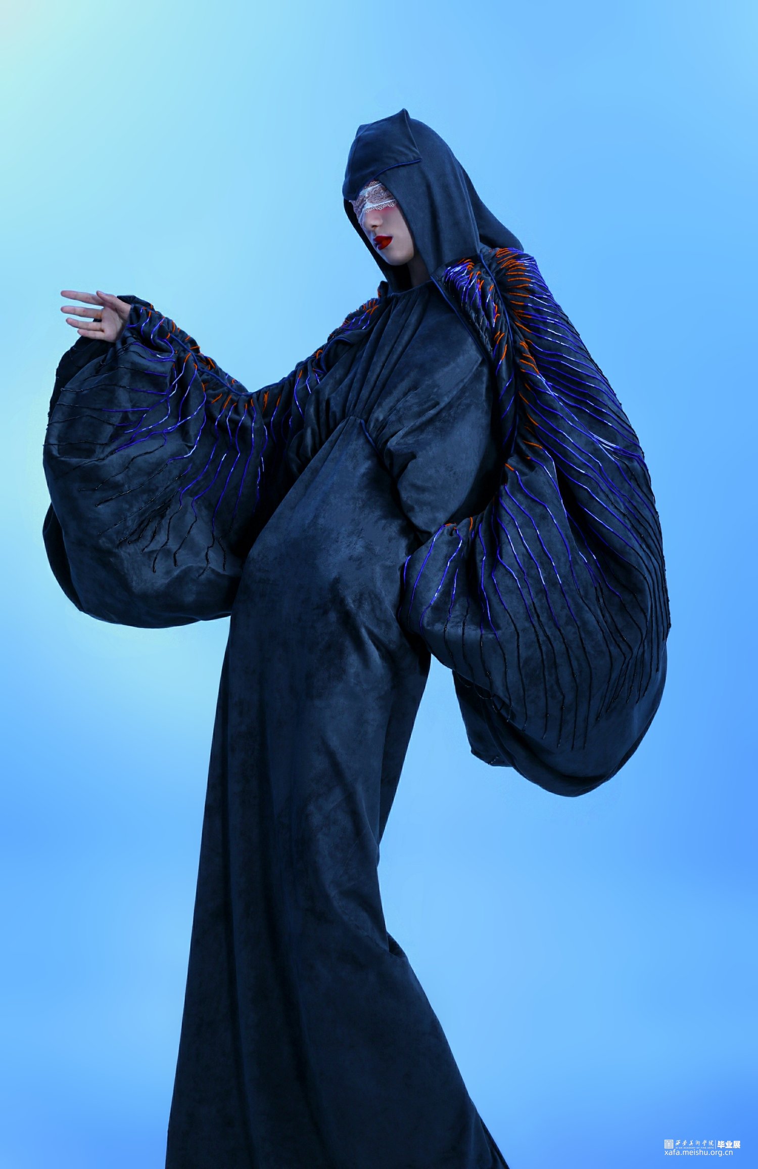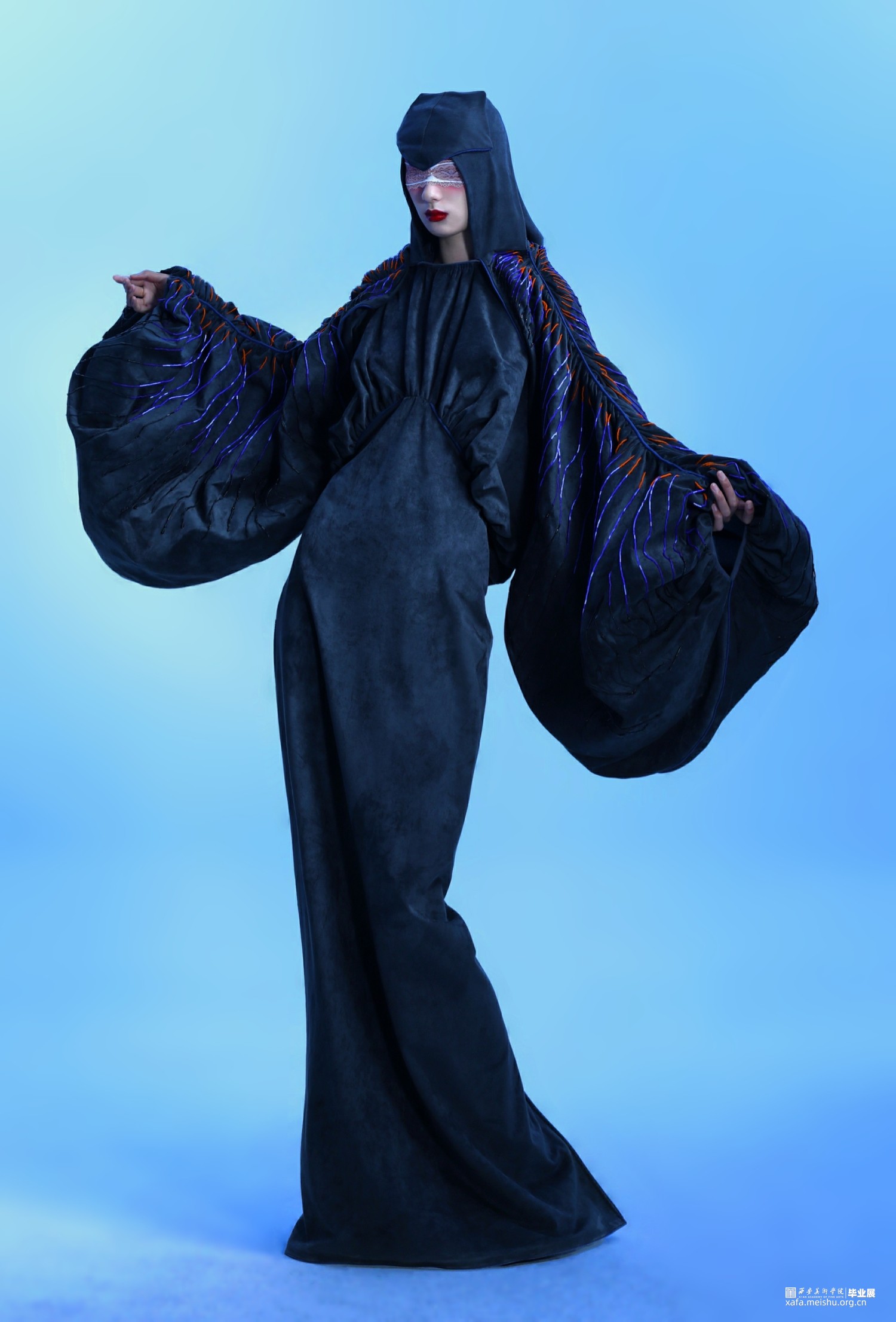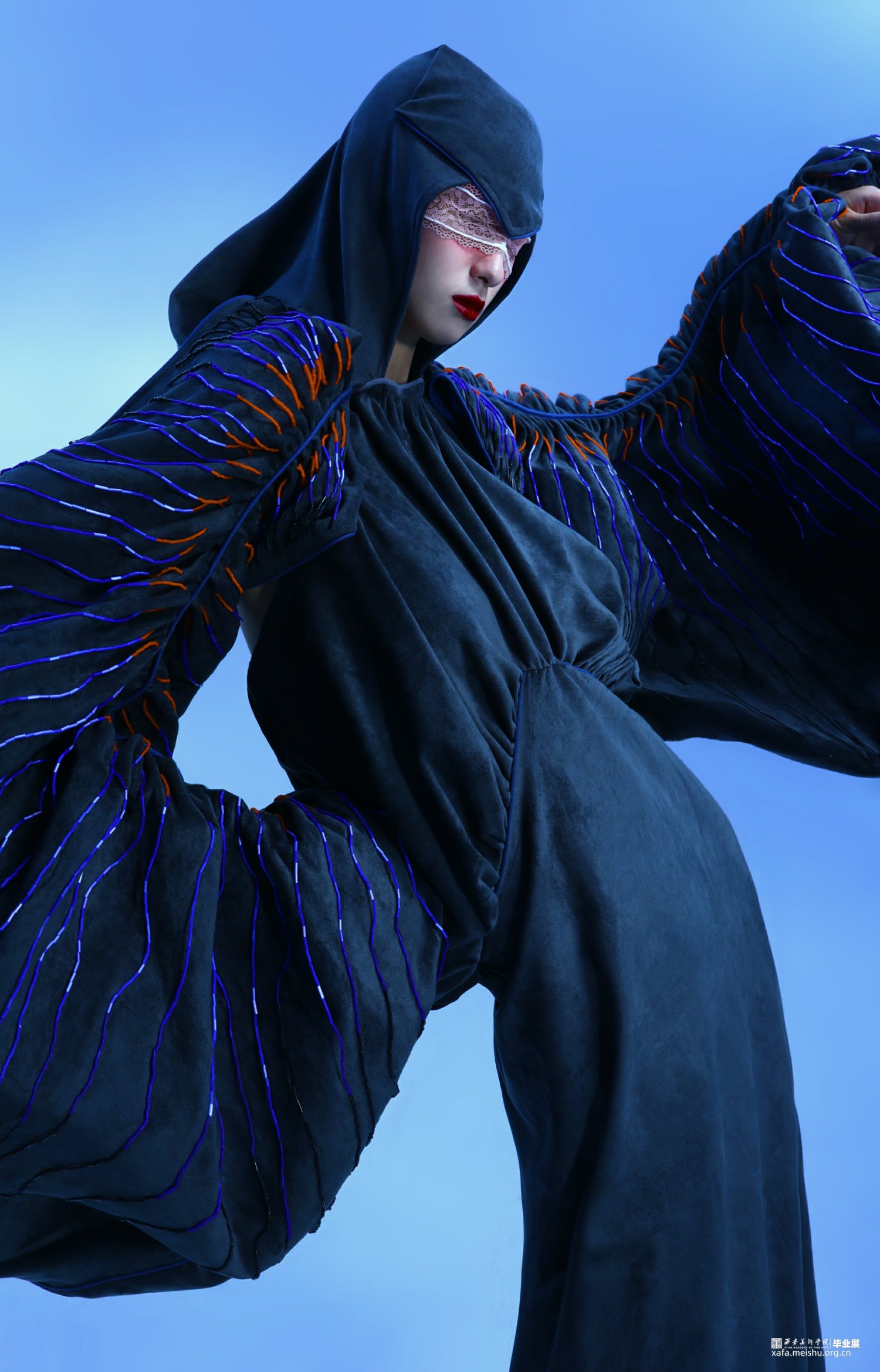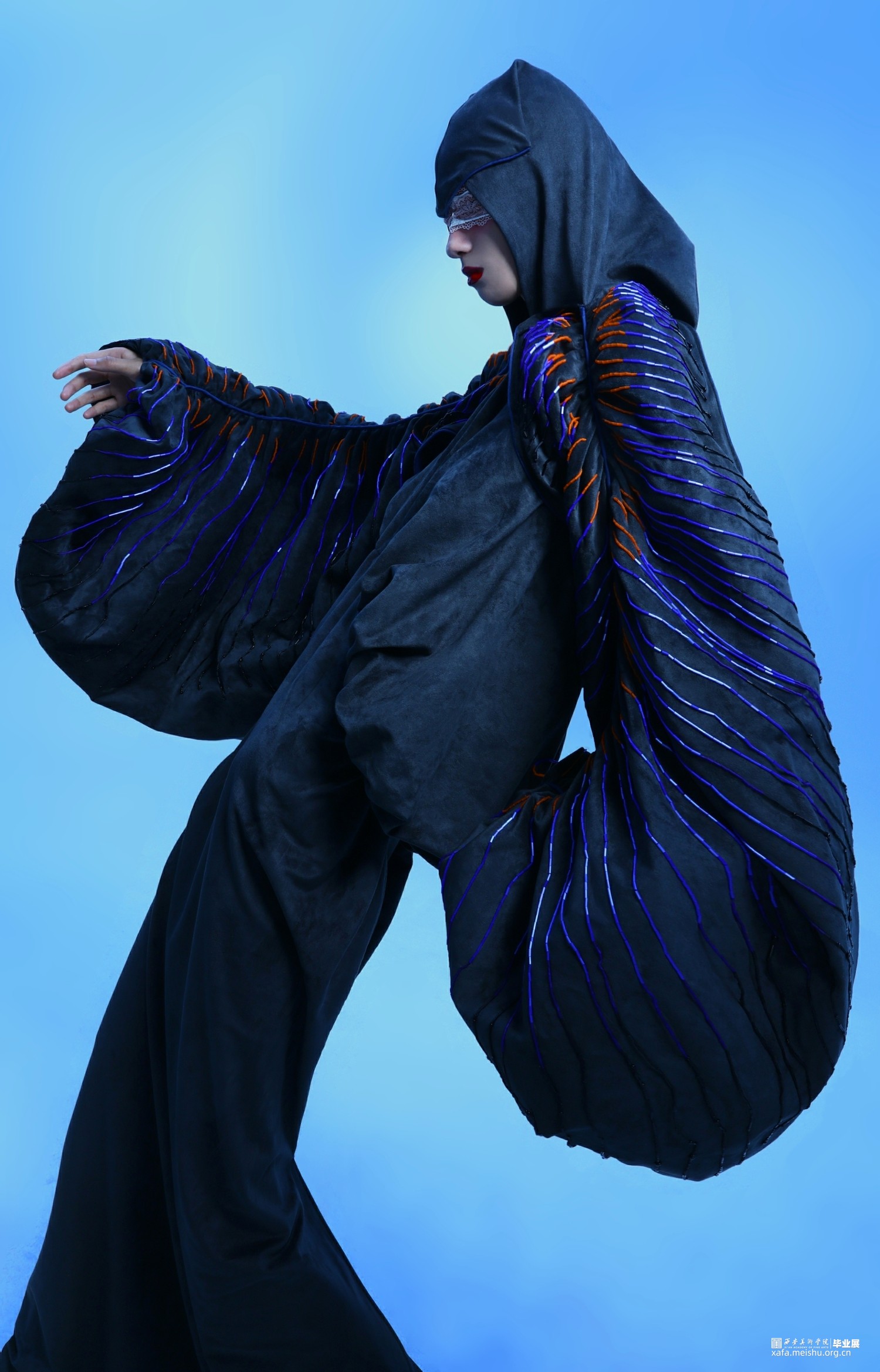 2.在第二套的成衣制作中,主要希望通过裙身与连帽来呈现一片式服装的合体效果,以及通过放量抽褶袖部结构来表现出区别于裙身的廓形反差。整体的管珠面改也主要集中于袖部的板片结构周围,通过由抽褶向外散射的方式进行排列布局,在强调板片结构的同时借由不同的质感来呈现出具有流动效果的光泽感。而妆造上,则以蕾丝眼罩来突出优雅且具有复古神秘感的服装风格。