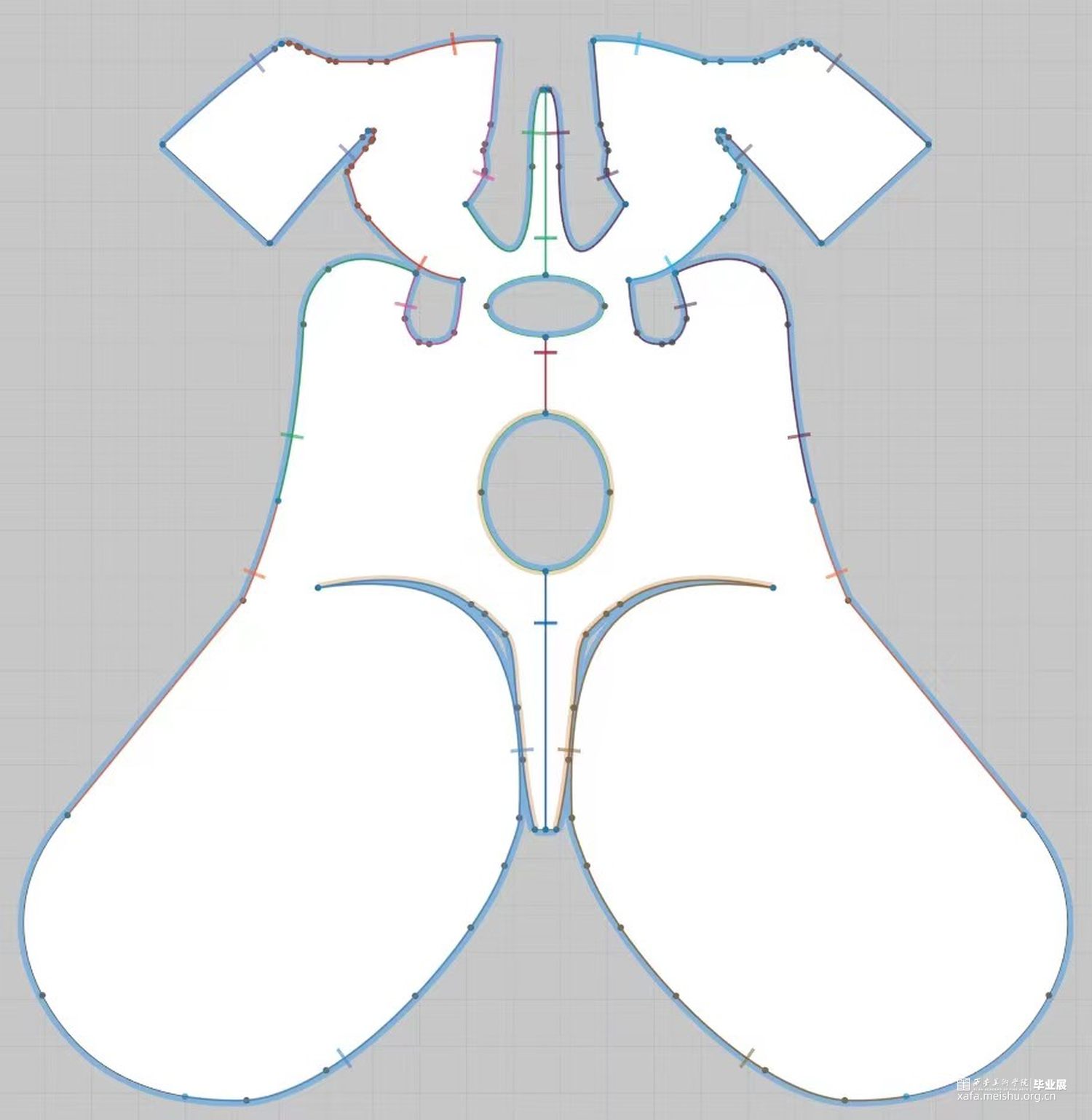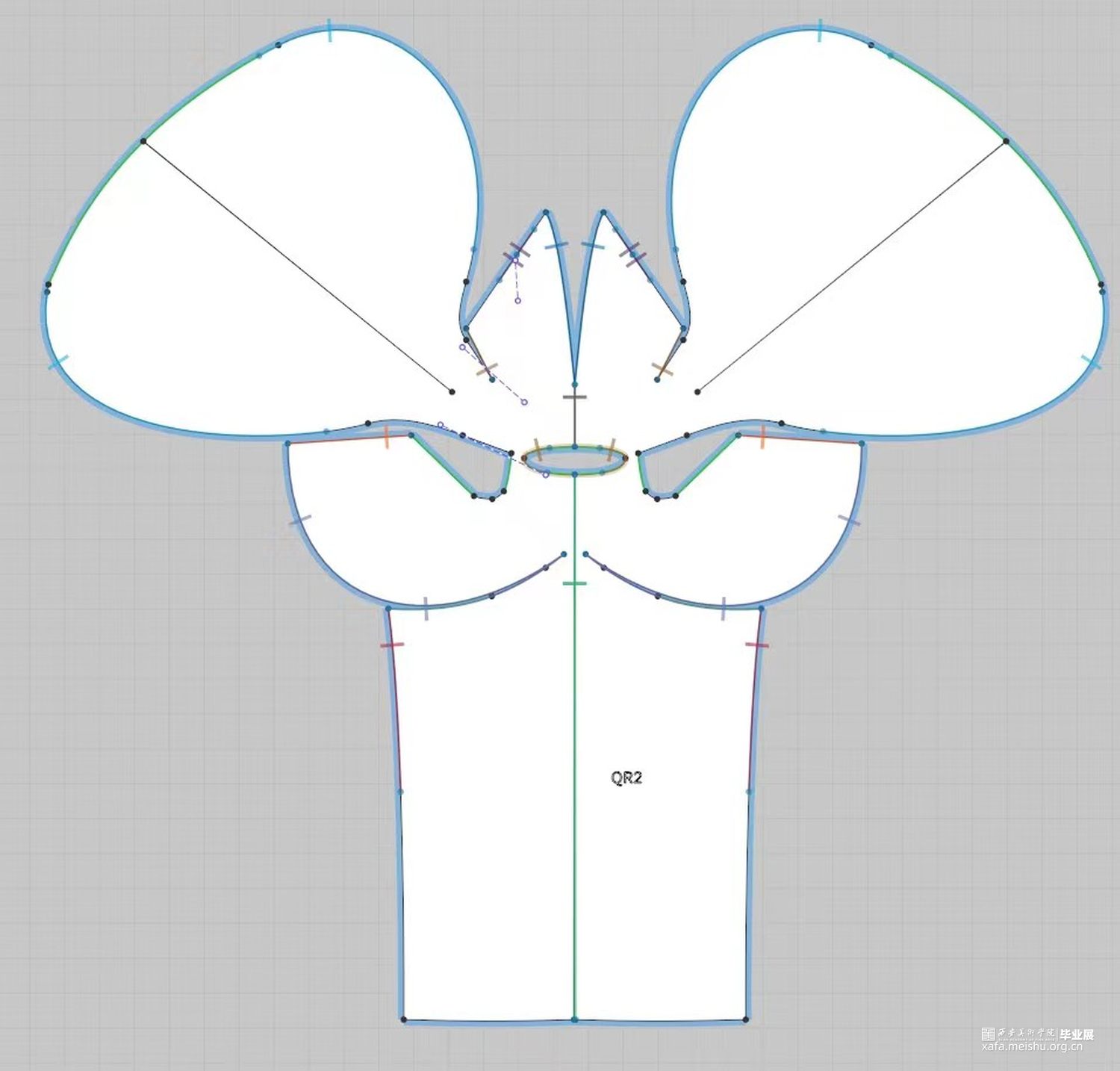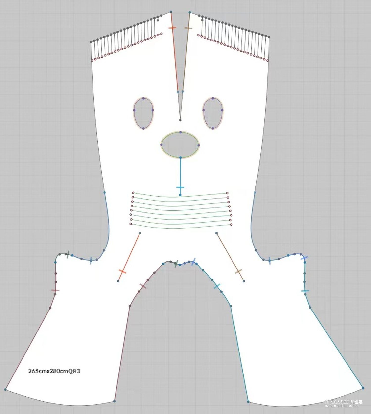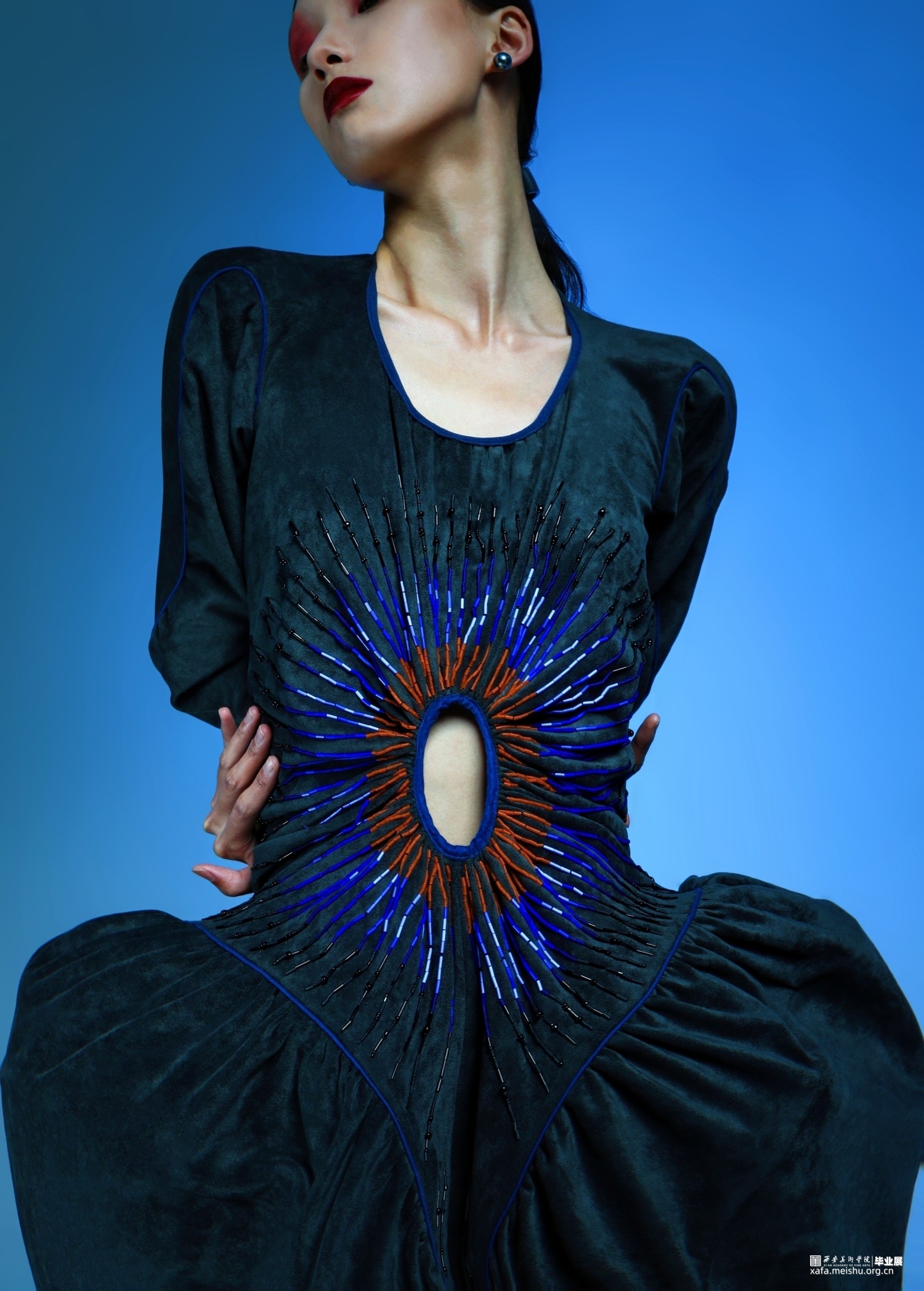 2.在第二套的成衣制作中,主要希望通过裙身与连帽来呈现一片式服装的合体效果,以及通过放量抽褶袖部结构来表现出区别于裙身的廓形反差。整体的管珠面改也主要集中于袖部的板片结构周围,通过由抽褶向外散射的方式进行排列布局,在强调板片结构的同时借由不同的质感来呈现出具有流动效果的光泽感。而妆造上,则以蕾丝眼罩来突出优雅且具有复古神秘感的服装风格。