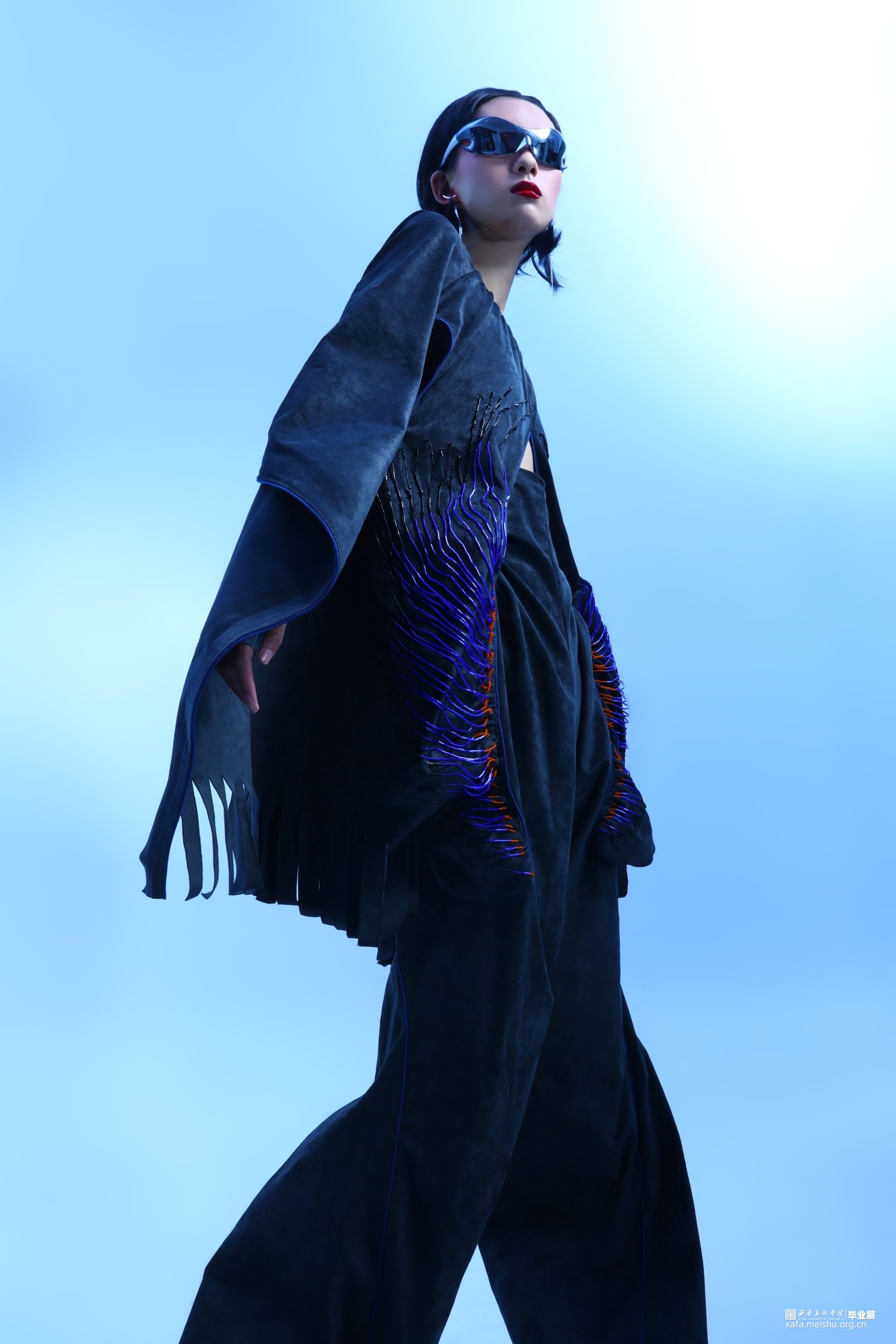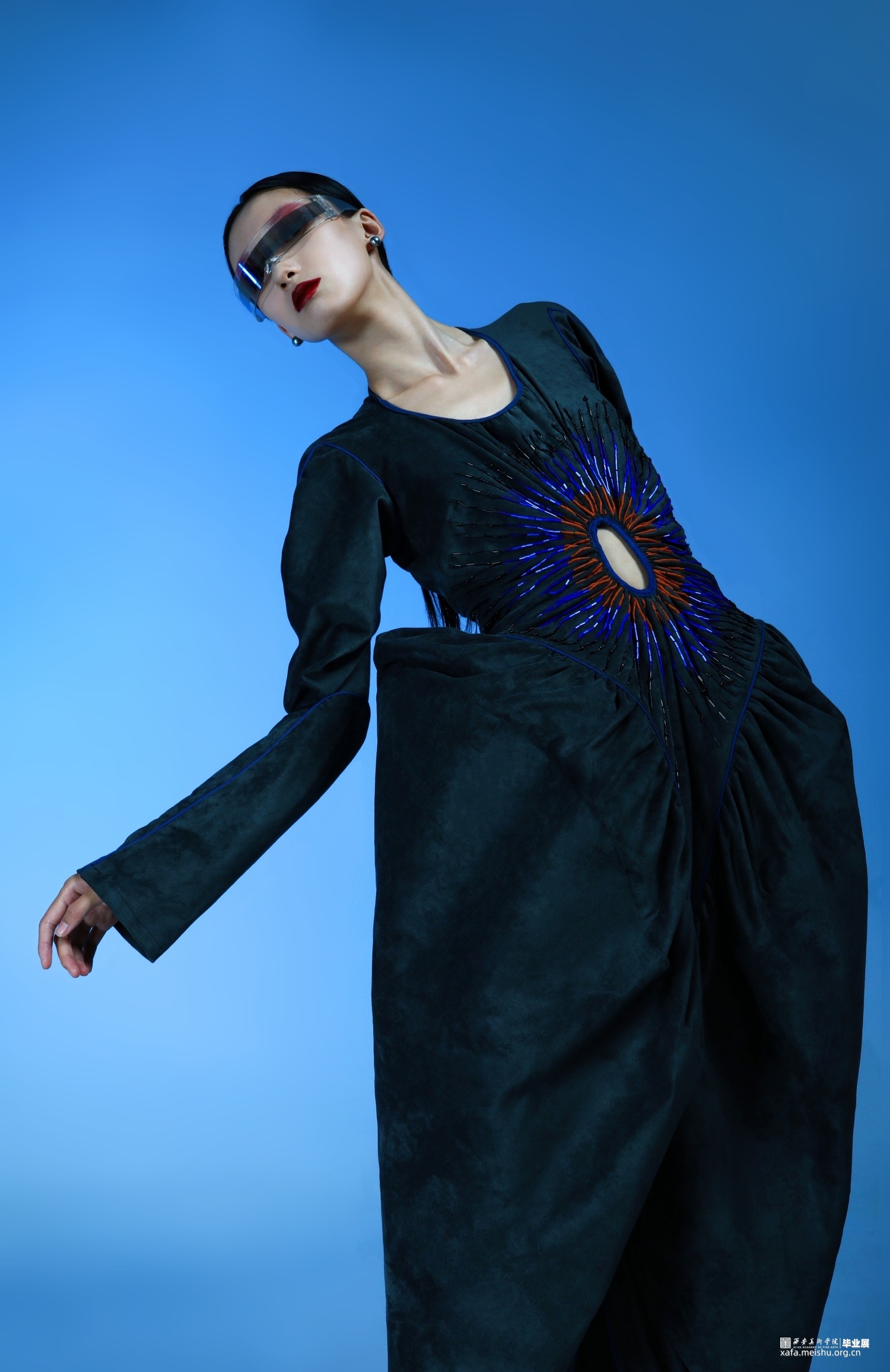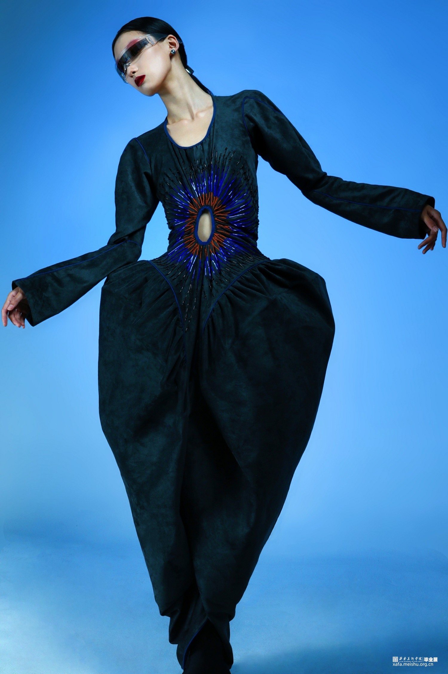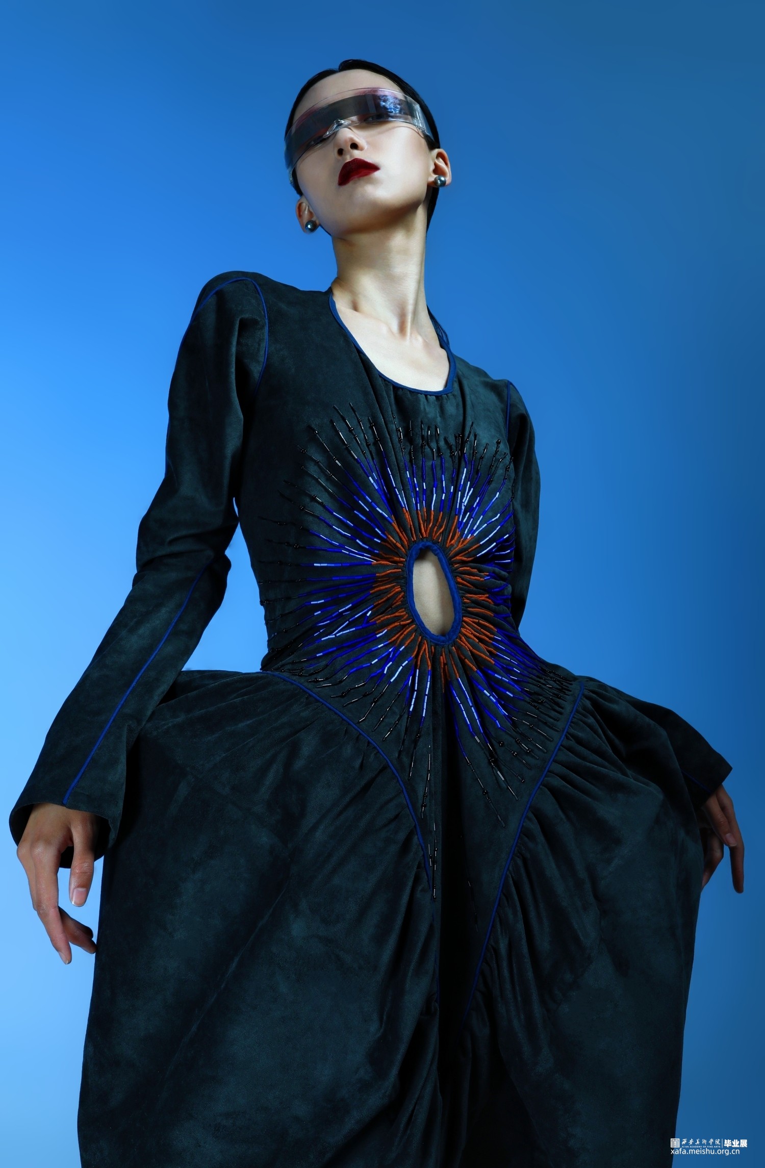 1.在第一套的成衣制作中,主要希望通过上半身来呈现一片式服装的合体效果,以及通过放量缩缝胯部面料来表现出区别于上半身的廓形反差。整体的管珠面改也主要集中于胸部的板片结构周围,通过中心散射的方式进行排列布局,在强调板片结构的同时借由不同的质感来呈现出具有流动效果的光泽感。并且妆造上也为避免喧宾夺主,以简约并具有复古科技感的眼镜与耳饰来突显服装风格。