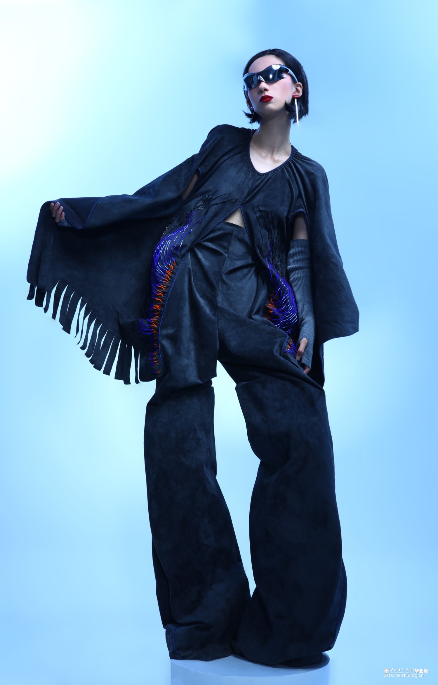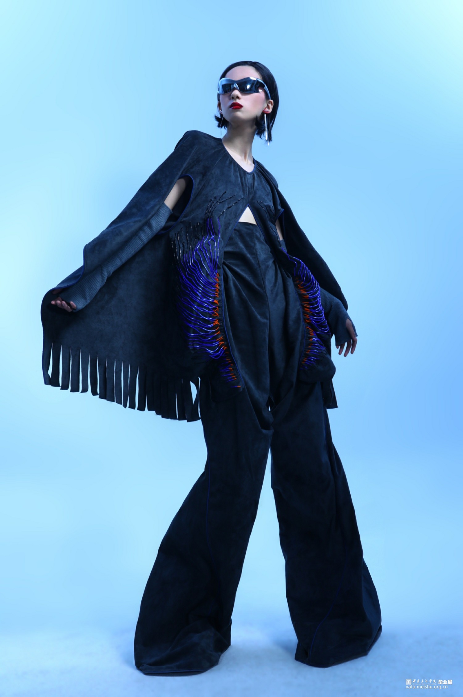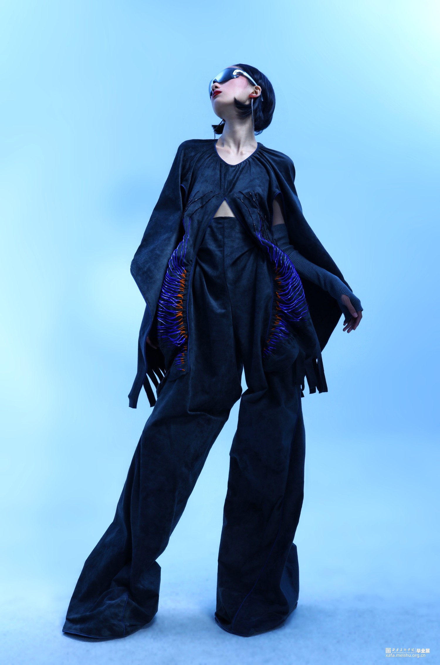 3.在第三套的成衣制作中,主要希望通过裤子结构来呈现一片式服装的合体效果,以及通过放量缩缝上半身衣片来表现出区别于裤身的廓形反差。整体的管珠面改也主要集中于上半身的缩缝结构周围,通过由缩缝向上的弧线排列进行布局,在强调板片结构的同时借由不同的质感来呈现出具有流动效果的光泽感。而妆造上,则以流苏耳饰、机能墨镜与袖套来突出动感且具有复古运动感的服装风格。
