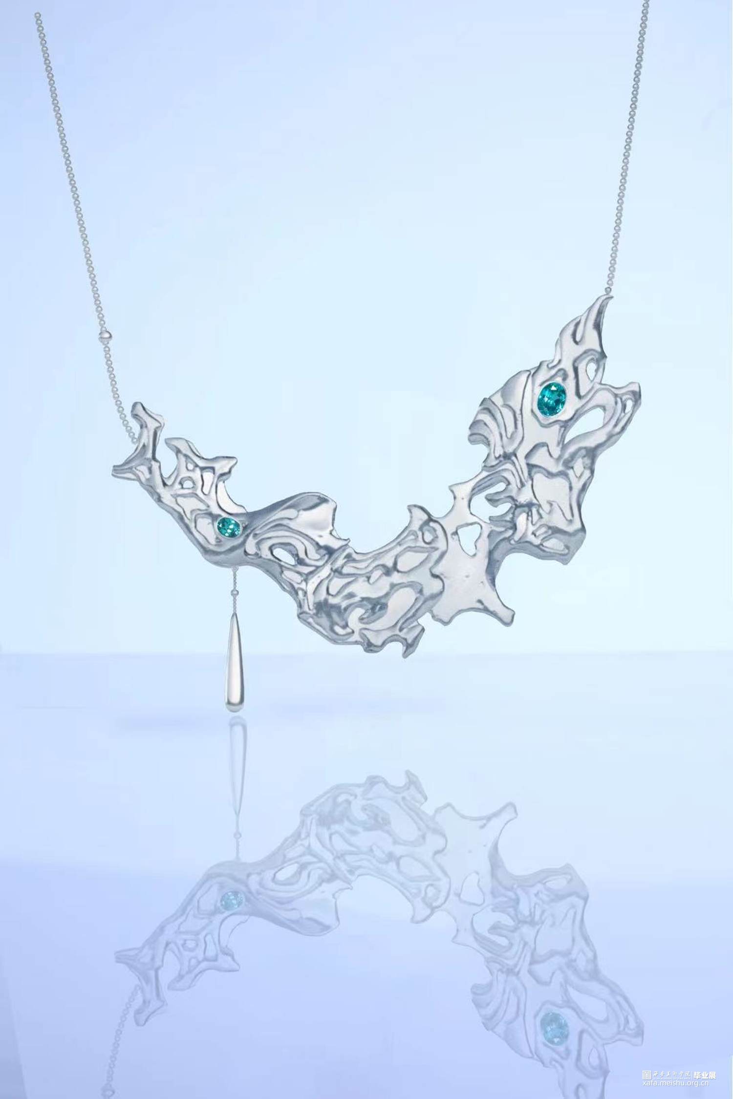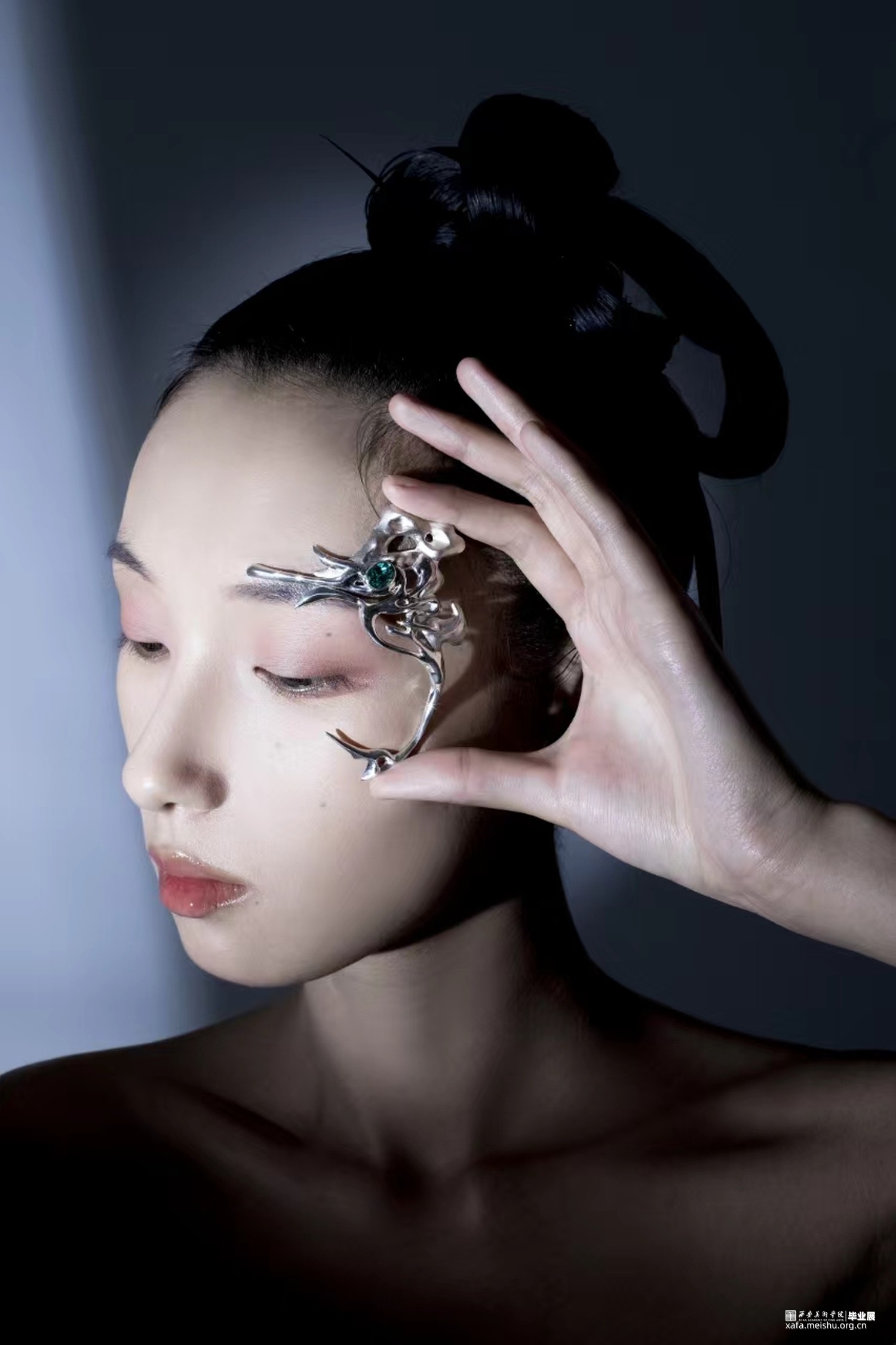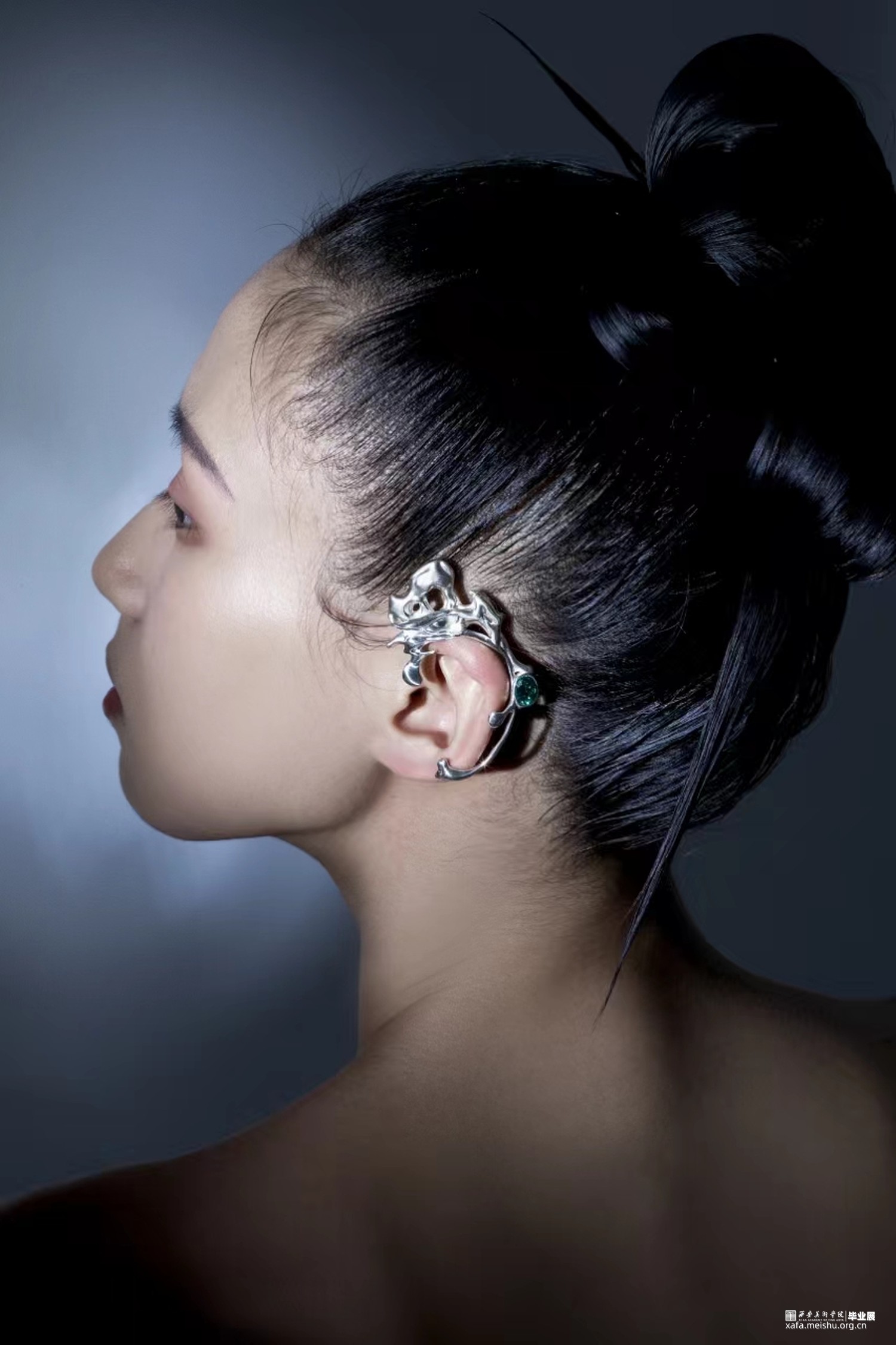 首饰设计巧妙地结合了书法的线条特点与太湖石的形态美感。通过曲线的流畅和直线的挺拔,塑造出书法韵味,同时借鉴太湖石的形态,注重空间布局和层次感,使其在视觉上更具立体感和动态美。材质精选了玉石与金属的组合,即体现了传统文化的厚重感,也巧妙地展现了当代首饰的时尚魅力。